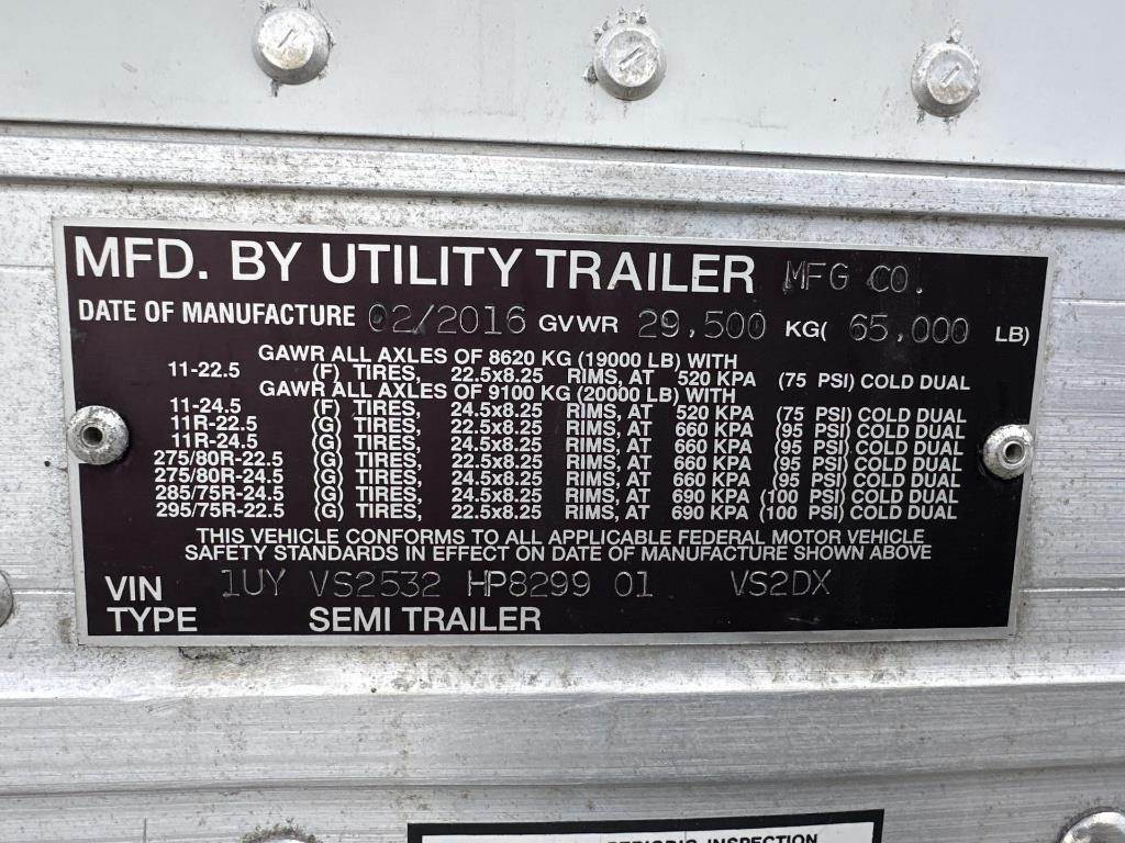Location: Kaukauna, WI Approx 53' Length, 102" Width, 65000LB GVWR, Air Ride, Sliding Axles, 2 Speed Landing Gear, Rear Swing Doors, 295/75R22.5 Tires, Spare Tire VIN: 1UYVS2532HP829901