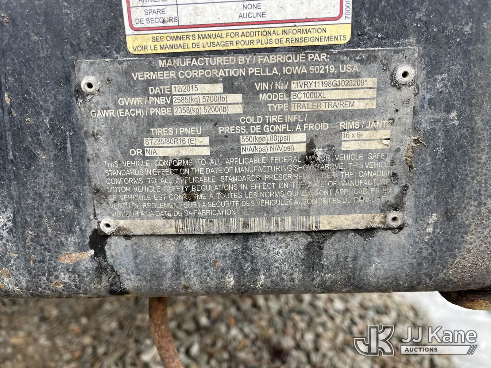 2016 Vermeer BC1000XL Portable Chipper (12in Drum), 4-cyl gas, trl mtd (Runs, Operational Condition Unknown, Jump To Start, No Tail Shelf Pin, Seller States: Needs Cutter Drum & Drive Belt, Bearings, Shear Bar, Brakes & Wheel Bearings) (Reads 3,767 hours) This is a Titled Item NOTE: This unit is being sold AS IS/WHERE IS via Timed Auction and is located in Smock, PA. Inspection & preview days for this unit are the 2 business days prior to the first day of items closing for this auction, item is located at 1000 Franklin Dr Smock, PA 15480 and hours of operations are 7:00 am to 3:30 pm. For pre-sale questions, please contact Alaina White @ (724) 562-2575 or Alaina.White@JJKane.com. (Buyer is responsible for removal. Assistance by consignor or JJ Kane Auctions is not assured.)