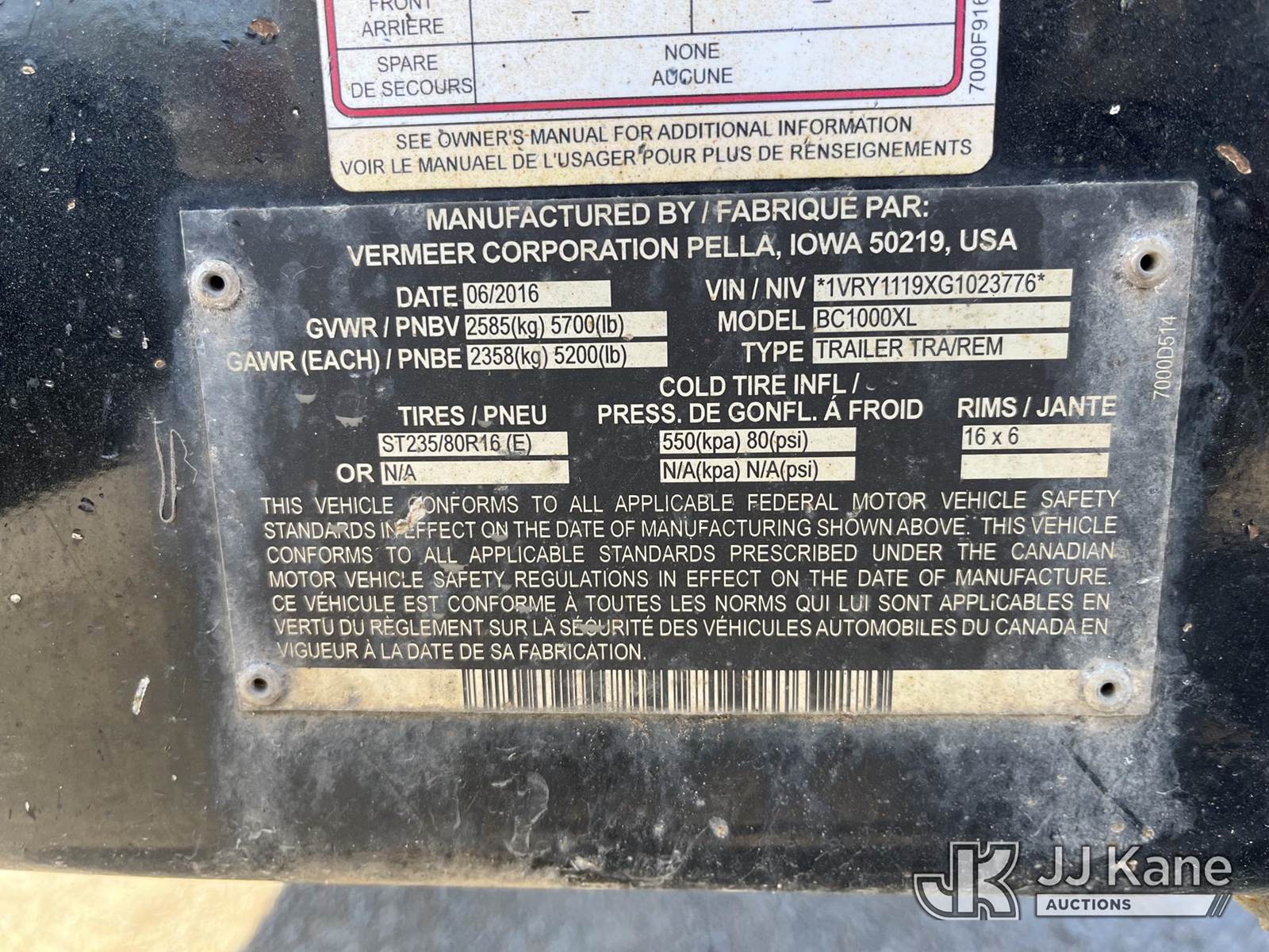 2016 Vermeer BC1000XL Portable Chipper (12in Drum), s/n 1VRY1119XG1023776, 4-cyl Gas, Trailer Mounted (CERTIFICATE OF ORIGIN) (No Title, Not Running, Cranks, Condition Unknown) (Reads 1,027 hours) NOTE: This unit is being sold AS IS/WHERE IS via Timed Auction and is located in Smock, PA. Inspection & preview days for this unit are the 2 business days prior to the first day of items closing for this auction, item is located at 1000 Franklin Dr Smock, PA 15480 and hours of operations are 7:00 am to 3:30 pm. For pre-sale questions, please contact Alaina White @ (724) 562-2575 or Alaina.White@JJKane.com. (Buyer is responsible for removal. Assistance by consignor or JJ Kane Auctions is not assured.)
