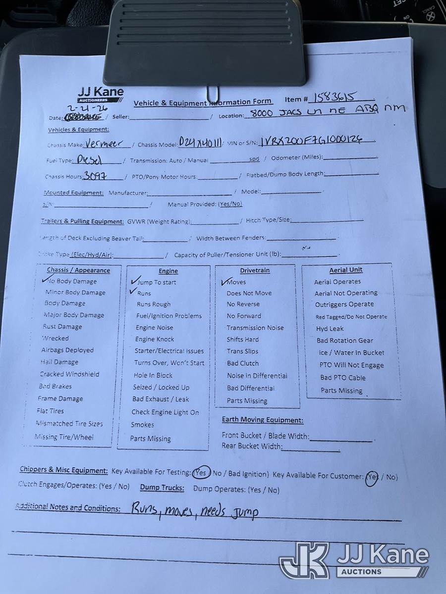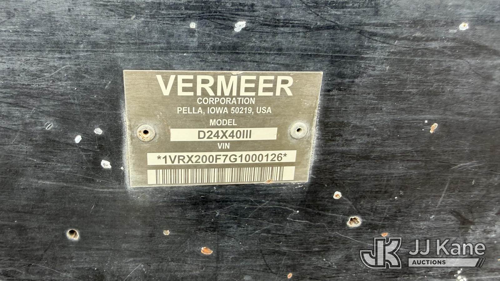 2016 Vermeer Corporation D24x40III Directional Boring Machine, s/n 1VRX200F7G1000126, diesel, Hydrostatic, with hyd. stakes, riding console, steel tracks, drill steel, (Runs & Moves) (Jump To Start) (Reads 3,097 hours) NOTE: This unit is being sold AS IS/WHERE IS via Timed Auction and is located in Albuquerque, NM. Inspection & preview days for this unit are by appointment only; please contact us at contact@jjkane.com or 84-Go-JJKane for more details. (Buyer is responsible for removal. Assistance by consignor or JJ Kane Auctions is not assured.)