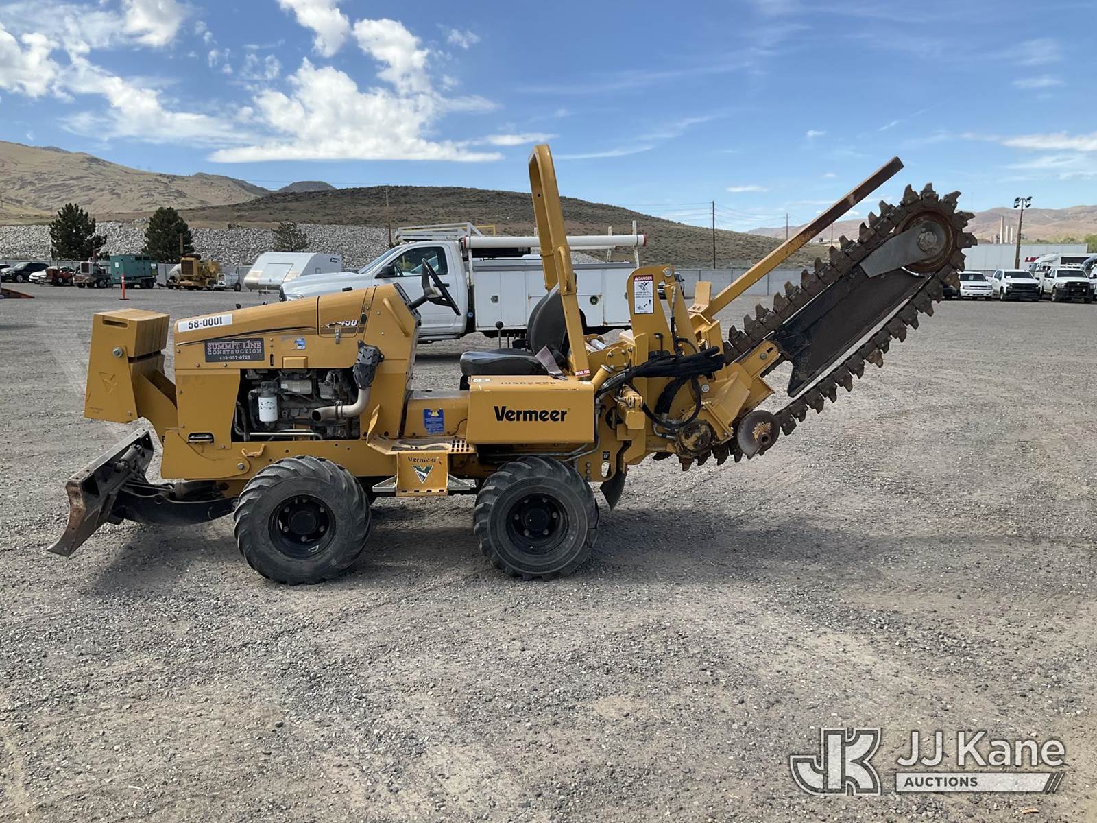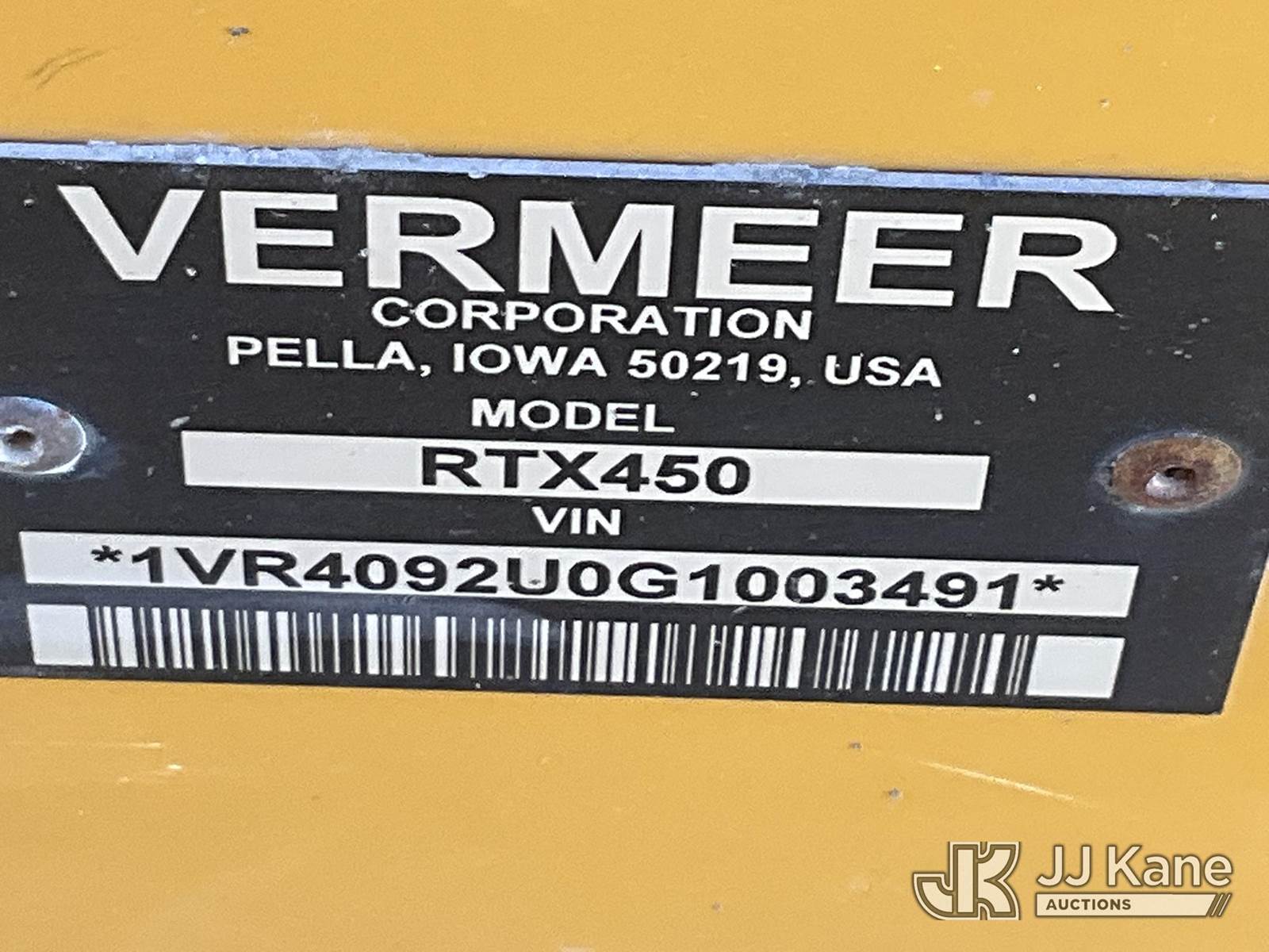 2016 Vermeer RTX450 Trencher, s/n 1VR4092U0G1003491, Deutz 2.9L diesel, 4wd, Hydrostatic, with front counterweights, backfill blade, ROPS posts, (Runs & Moves, Operates)(Check Engine Message) (Reads 1,361 hours) NOTE: This unit is being sold AS IS/WHERE IS via Timed Auction and is located in Sparks, NV. Inspection & preview days for this unit are the 2 business days prior to the first day of items closing for this auction, item is located at 601 Britain Dr Sparks, NV 89437 and hours of operations are 8a-4p. Titles executed exactly as bidder registered. Ensure your name and/or business name and address in JJ Kane and/or ProxiBid is correct before bidding. For pre-sale questions, please contact Office Staff @ (801) 519-0123 and provide sale date and lot number. Sparks Dealer License Number DLR000052908 / OHV000052909. (Buyer is responsible for removal. Assistance by consignor or JJ Kane Auctions is not assured.)