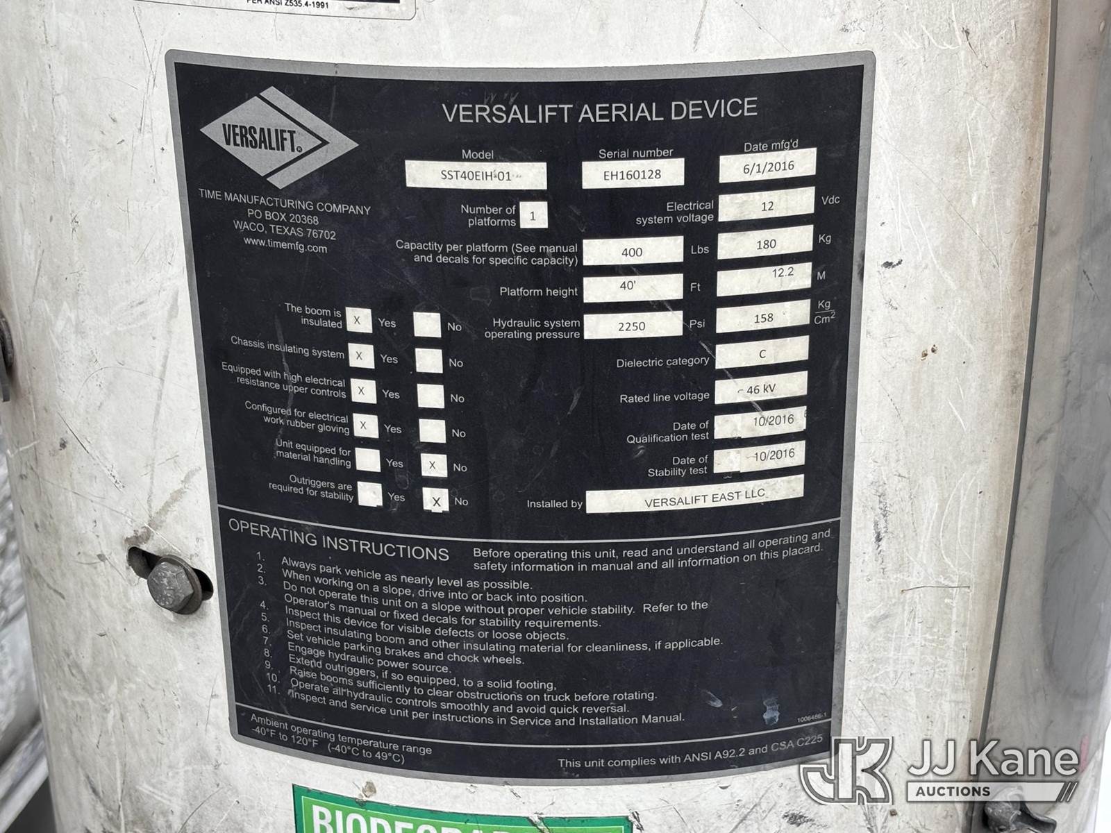 Versalift SST40EIH-01, 45 ft, Articulating & Telescopic Bucket Truck s/n EH160128, with single-man bucket, Electric Drive, center mounted on 2016 RAM 5500 4x4 Service Truck, 6.7L Auto, diesel, A/C, (186,085 miles) (Runs Moves & Upper Operates, ABS Light On, Check Engine Light On, Traction Control Light On, Body Damage) This is a Titled Item NOTE: This unit is being sold AS IS/WHERE IS via Timed Auction and is located in Plymouth Meeting, PA. Inspection & preview days for this unit are the 2 business days prior to the first day of items closing for this auction, item is located at 1402 Conshohocken Rd Plymouth Meeting, PA 19462 and hours of operations are 8a-4p. For pre-sale questions, please contact Bruce Thomas @ (267) 887-0392 or bruce.thomas.jr@jjkane.com. (Manuals provided in cab) (Buyer is responsible for removal. Assistance by consignor or JJ Kane Auctions is not assured.)