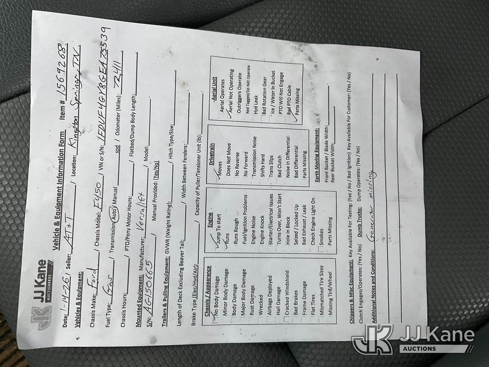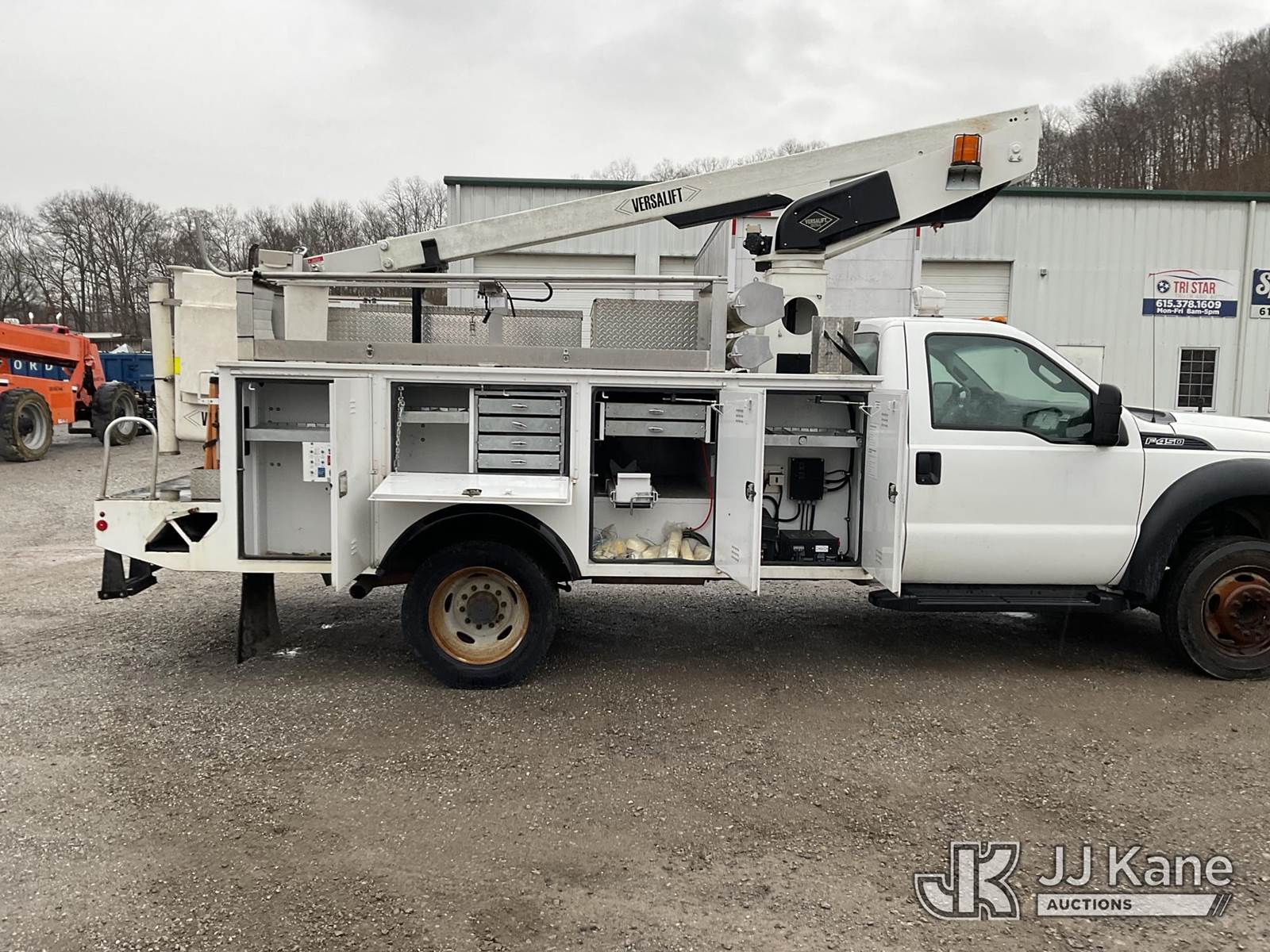 Versalift TEL29, 34 ft, Articulating & Telescopic Non-Insulated Bucket Truck s/n AG150665, with Single-Man Bucket, mounted behind cab on 2016 Ford F-450 SD Service Truck, 10-cyl gas, Auto, A/C, (72,411 miles) (Runs, Moves & Upper Condition Unknown) (Generator Missing, Jump To Start) This is a Titled Item NOTE: This unit is being sold AS IS/WHERE IS via Timed Auction and is located in Kingston Springs, TN. Inspection & preview days for this unit are by appointment only; please contact us at contact@jjkane.com or 84-Go-JJKane for more details. (Missing manuals, See Auction Company for Manufacturers Information to obtain manuals) (Buyer is responsible for removal. Assistance by consignor or JJ Kane Auctions is not assured.)