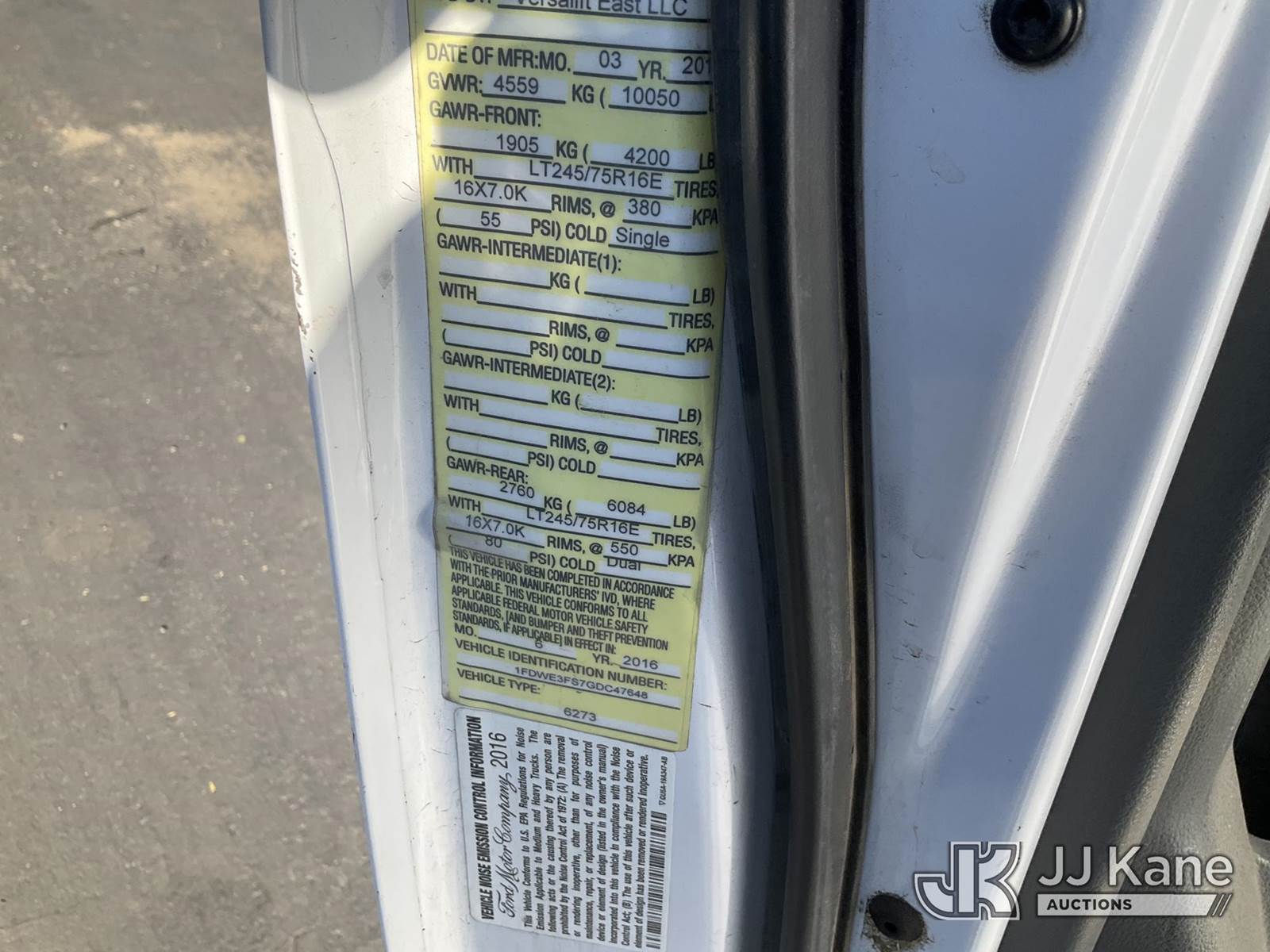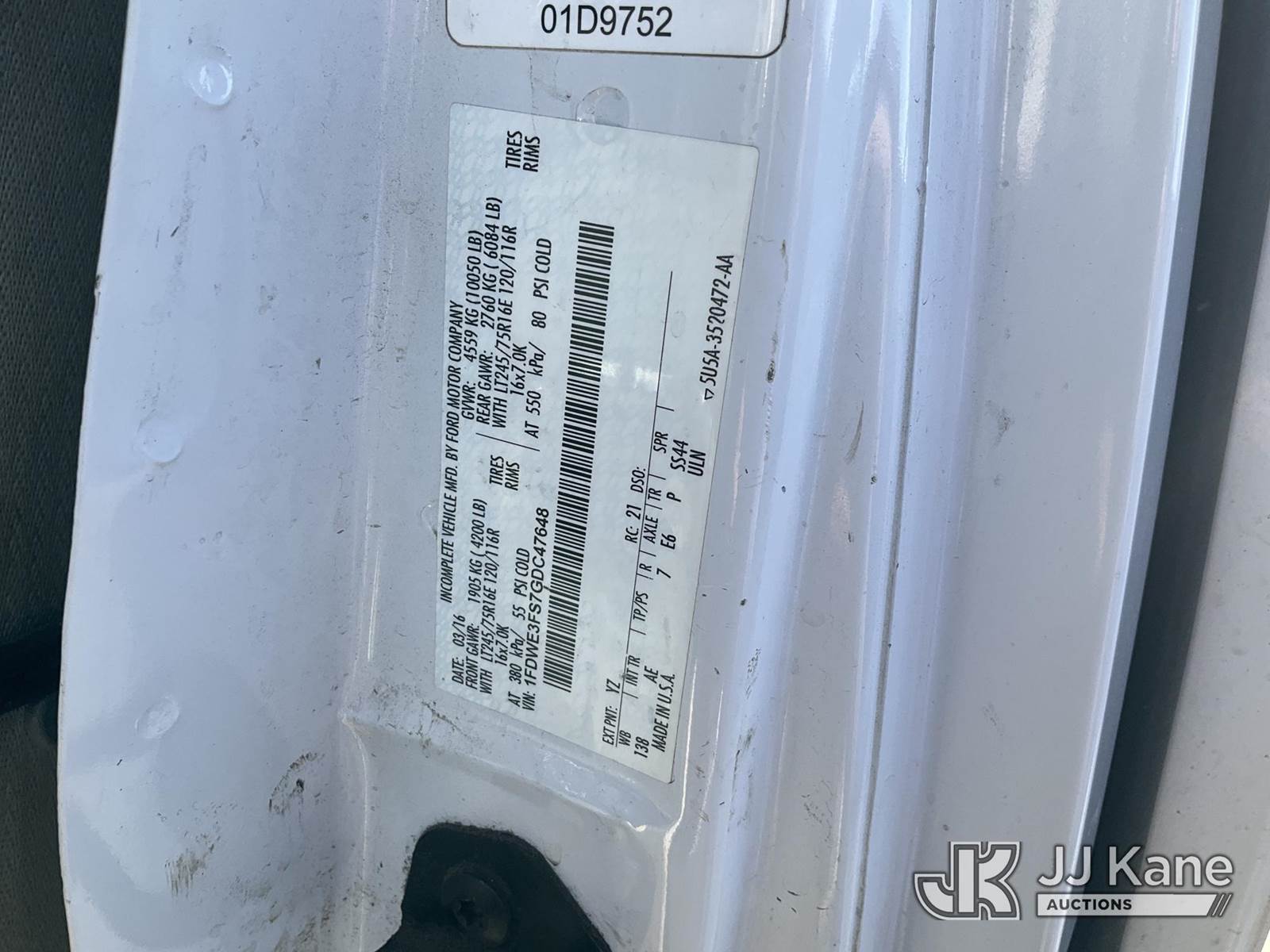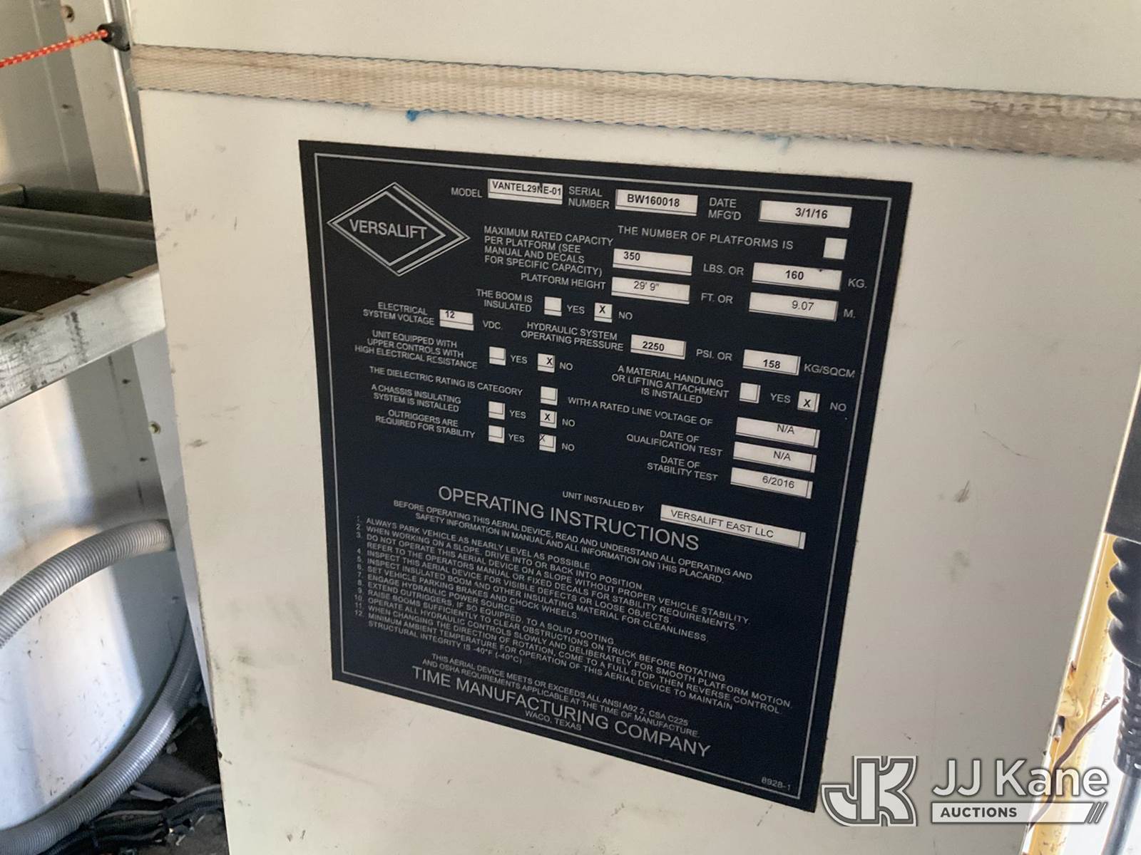 Versalift VANTEL29NE, 35 ft, Telescopic Bucket Truck s/n BW160018, with single man splicer bucket, mounted behind cab on 2016 Ford E350 Cutaway Van, 10-cyl gas, A/C, (183,381 miles) (Runs, Moves, & Upper Operates) (Bucket Has Cracks, No Manual) This is a Titled Item NOTE: This unit is being sold AS IS/WHERE IS via Timed Auction and is located in Jurupa Valley, CA. Inspection & preview days for this unit are the 2 business days prior to the first day of items closing for this auction, item is located at 4510 Muth Way Jurupa Valley, CA 92509 and hours of operations are 8a-4p. For pre-sale questions, please contact please contact Office Staff @ (310) 353-7140. Dealer License Number 45696. (Manuals provided in cab) (Buyer is responsible for removal. Assistance by consignor or JJ Kane Auctions is not assured.)