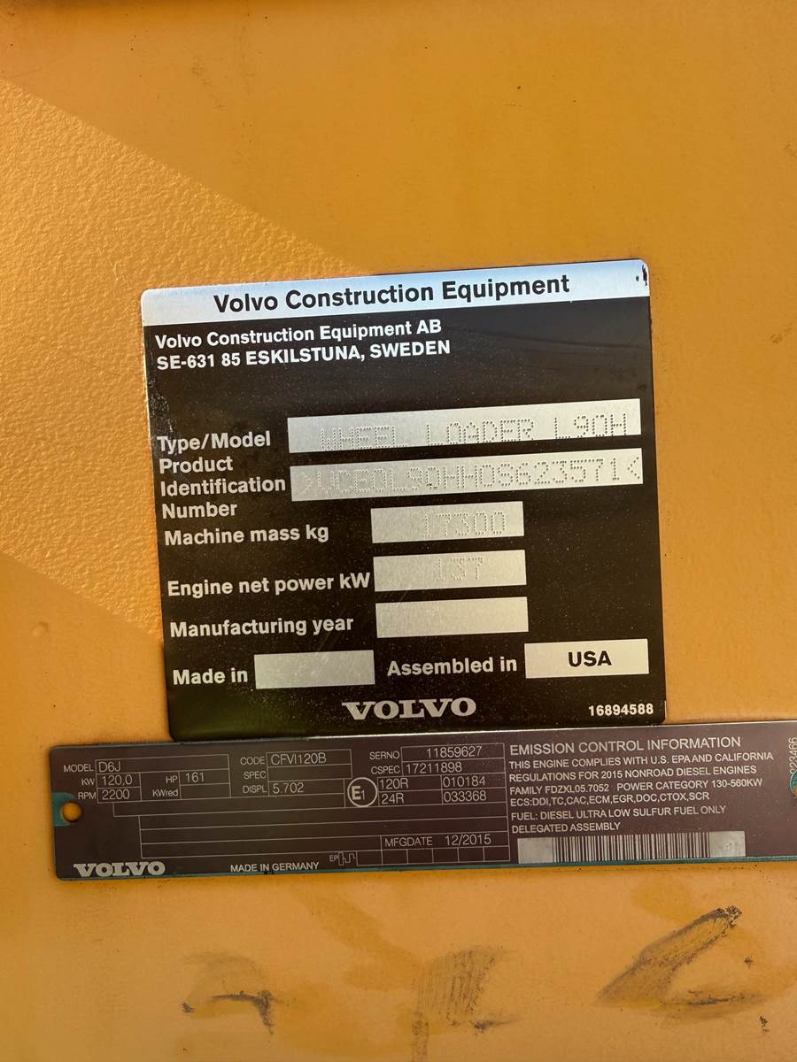 2016 Volvo L90H Wheel Loader- SINGLE OWNER, FLEET MAINTAINED, GARAGE KEPT, 186 HP Volvo D6J Diesel, EROPS, Enclosed Cab w/ Heat & Air, Joystick Controls, 5,263 Hours, 104" Bucket 3.5 Cubic Yard, Quick Coupler, **FORKS ALSO AVAILABLE!!** 20.5R25 Tires, Static Tipping Load- 22,265 LBS., Backup Camera, Opt. Weight- 38,140 LBS., CALL FOR VIDEOS!!!