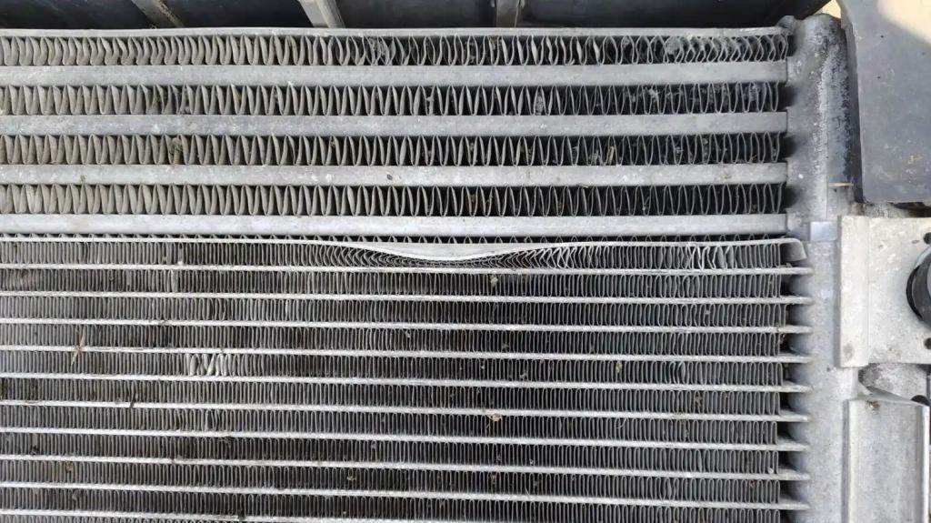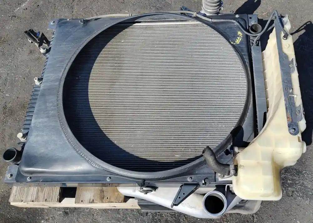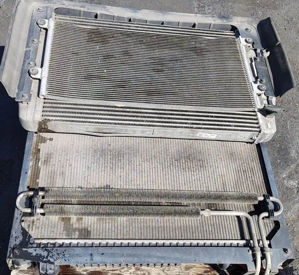 Cooling Assembly, Complete, Includes RAD, CAC, and Condenser. Radiator P/N 23459369, 1A0216330001, 40 5/8"H x 34 1/4"W, 2.5" Inlet - Upper Left, 2.5" Outlet - Lower Right, Oil Cooler 11.5" Centers. Condenser Top Edge Bent.