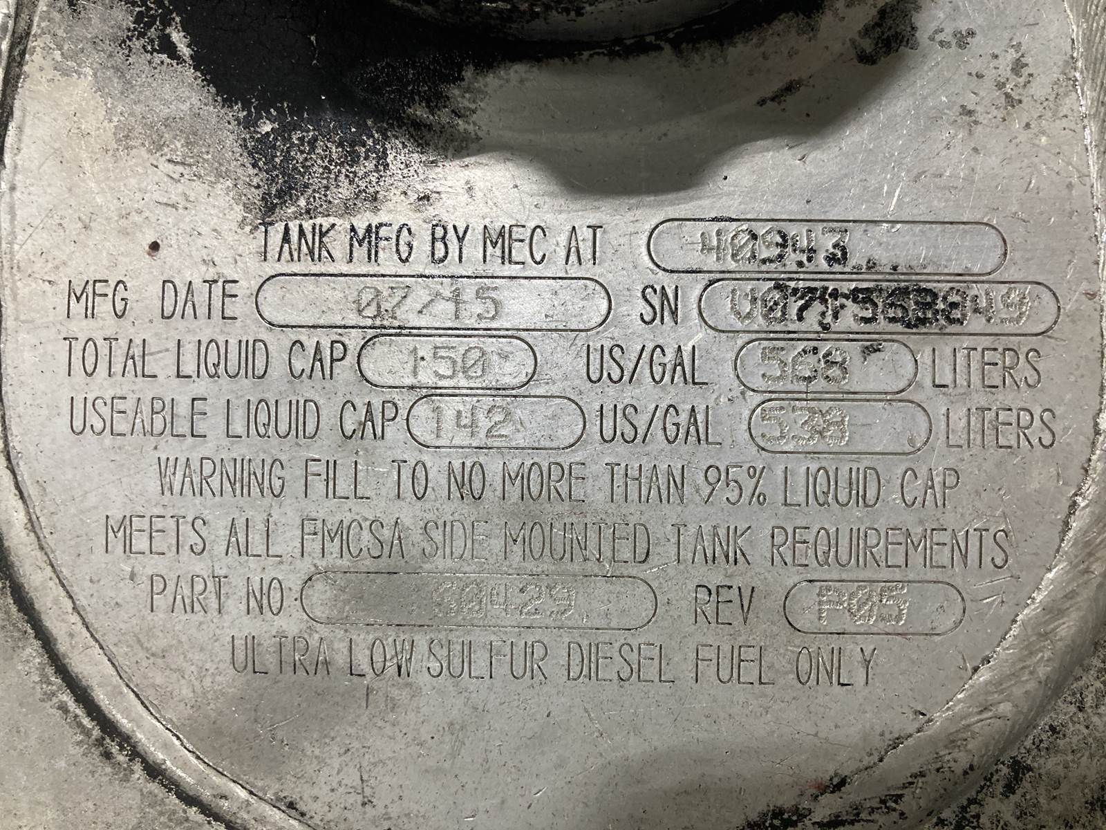 (USED) Volvo VNL Gallons: 150 Length: 67 Width/Dia: 26 Height: 26 TANK ONLY