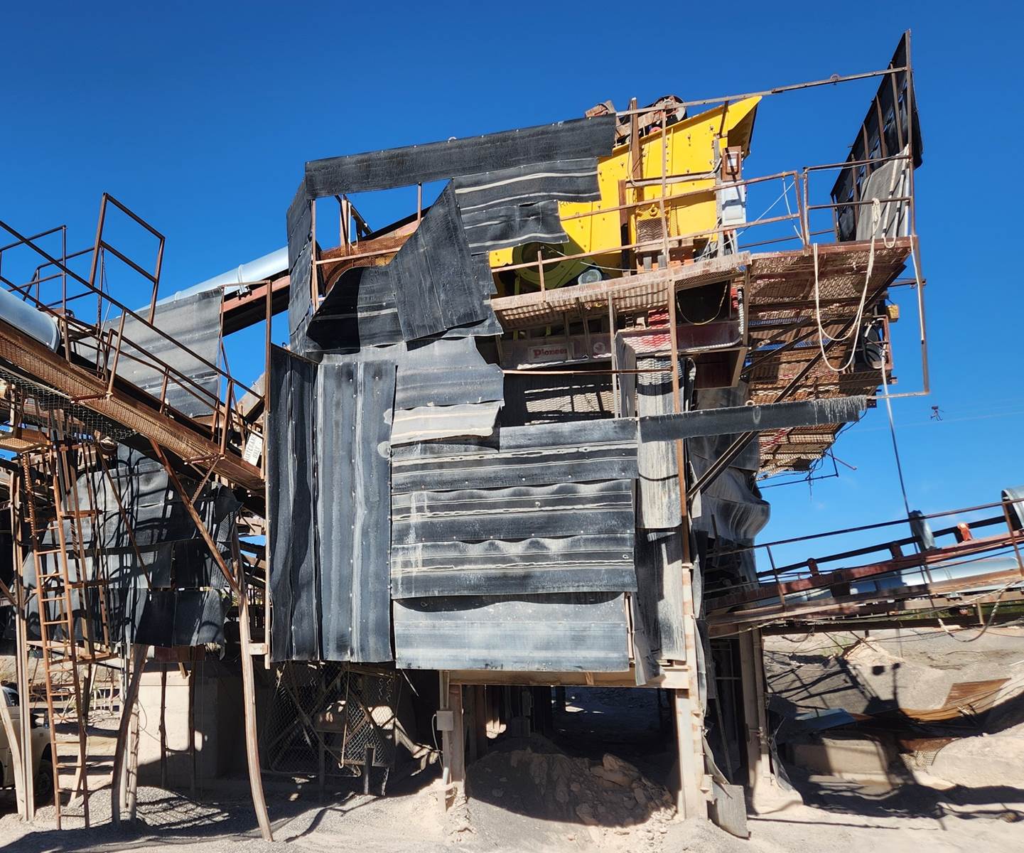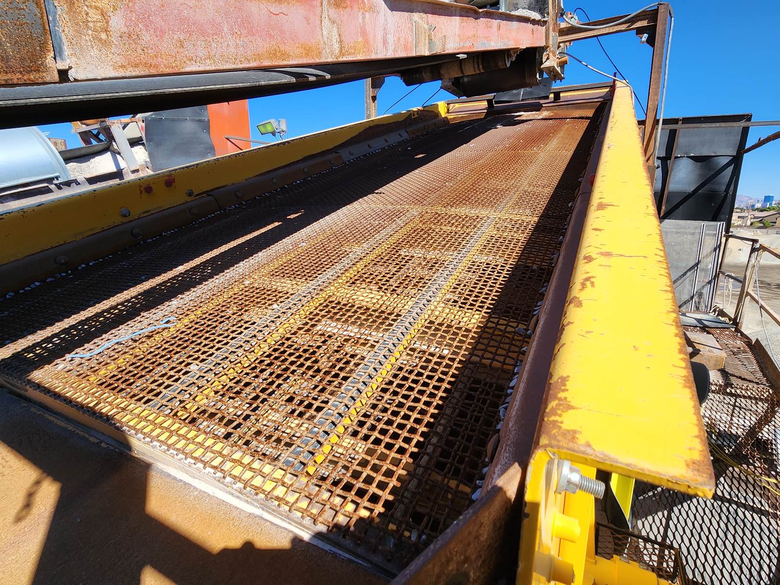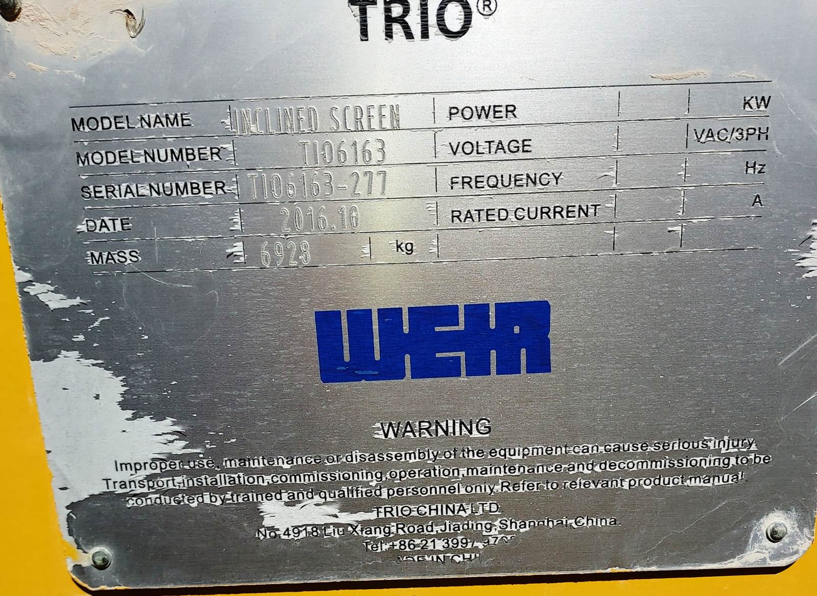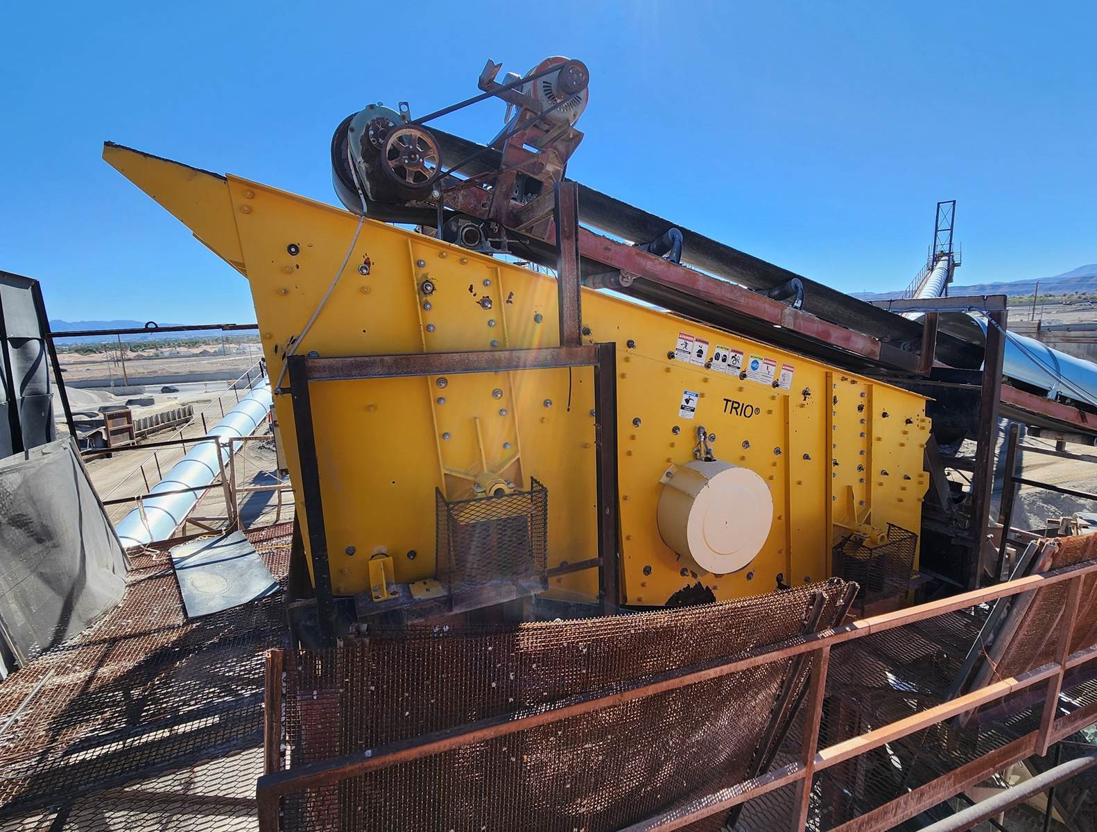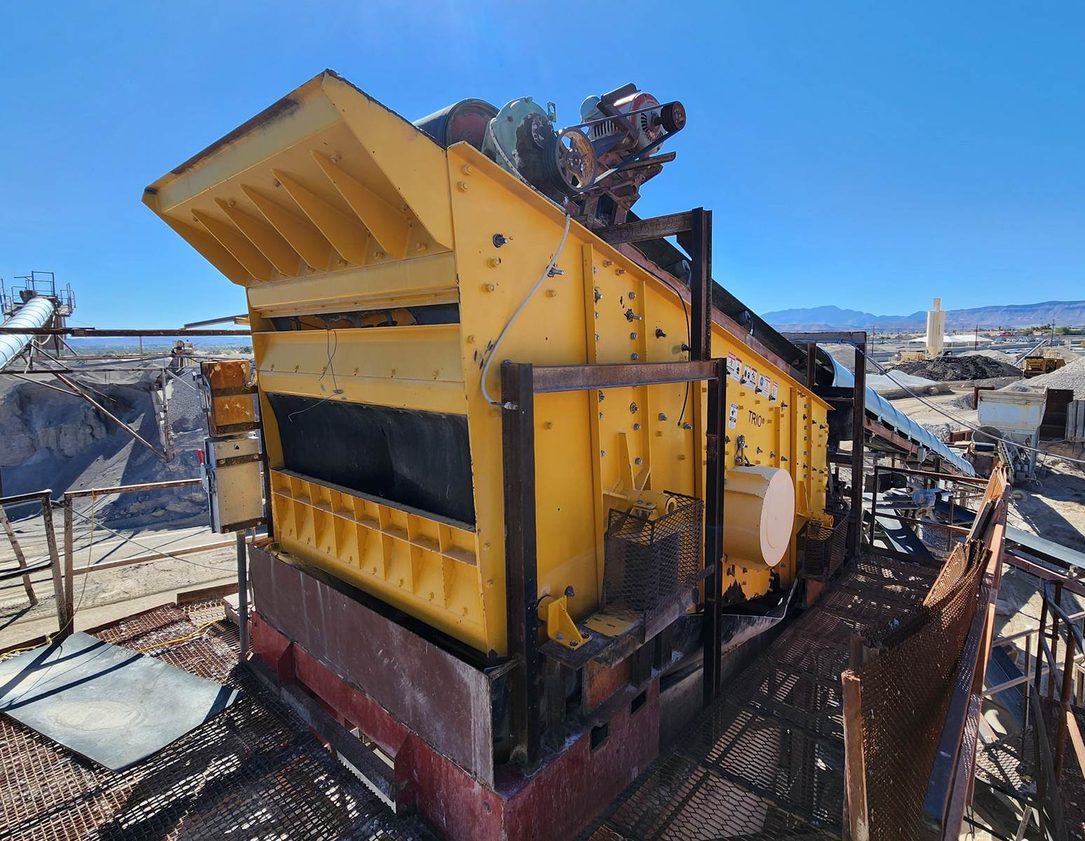 (1) - one – WEIR-TRIO 6’ x 16’ Three Deck Incline Vibrating Screen, 20 h.p. electric motor, V-belt drive with guard, single shaft, two roller bearing oil bath lubricated vibrator assembly with external counterweights, steel coil isolation springs, friction check assemblies at 4 corners, bolt on steel lined feed box, conventional single crowned decks, standard wire screen media with side tension rails. Bare screen, no salvageable structure. Model TIO6163, S/N TIO6163-277 Date of Mfr. 2016. Used Equipment……Selling Price $ E-Mail or call for more information and pricing. Truck loading is included in the selling price. Condition: Very good, low use hours. Running condition when shut down.