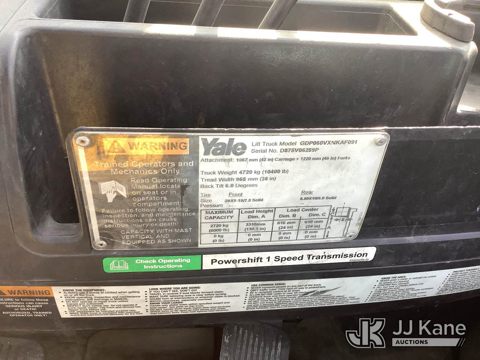 2016 Yale GP060VX Solid Tired Forklift, s/n D875V06259P, 4-cyl, Diesel, Shuttle, with 2 Stage Mast, Open Closed Forks, Side Shift & ROPS, (Runs, Moves & Operates) (Removal is by Appointment Only, Buyer MUST make a appointment prior to picking up, Buyer/Transporter Must have PAID IN FULL RELEASE. No onsite assistance available, Please Come prepared.) (Reads 3,720 hours) NOTE: This unit is being sold AS IS/WHERE IS via Timed Auction and is located in Harmans, MD. Inspection & preview days for this unit are by appointment only; please contact us at contact@jjkane.com or 84-Go-JJKane for more details. For pre-sale questions, please contact the on-site office @ (443) 557-0025 or Kevin.Waggoner@JJKane.com. (Buyer is responsible for removal. Assistance by consignor or JJ Kane Auctions is not assured.)