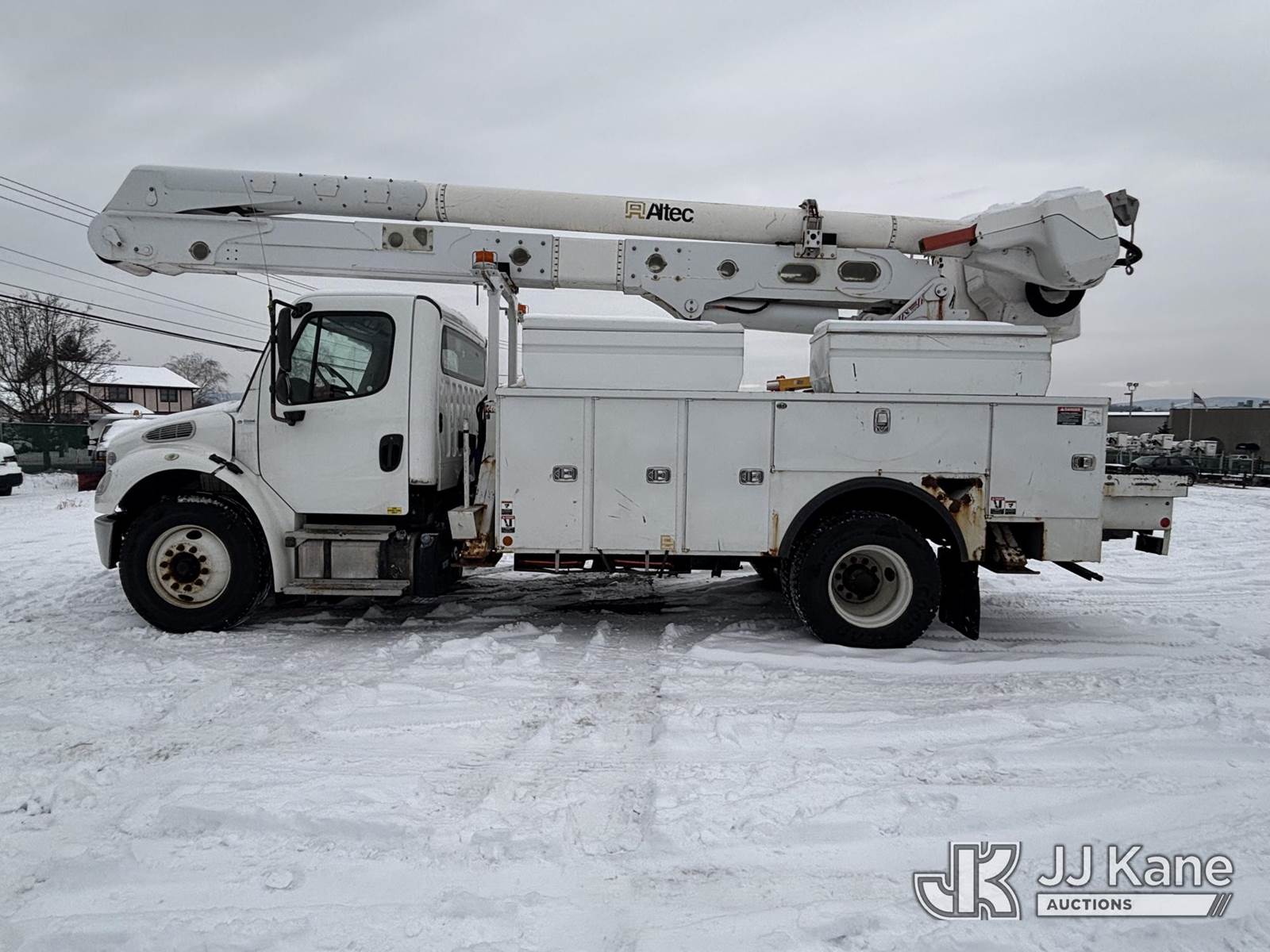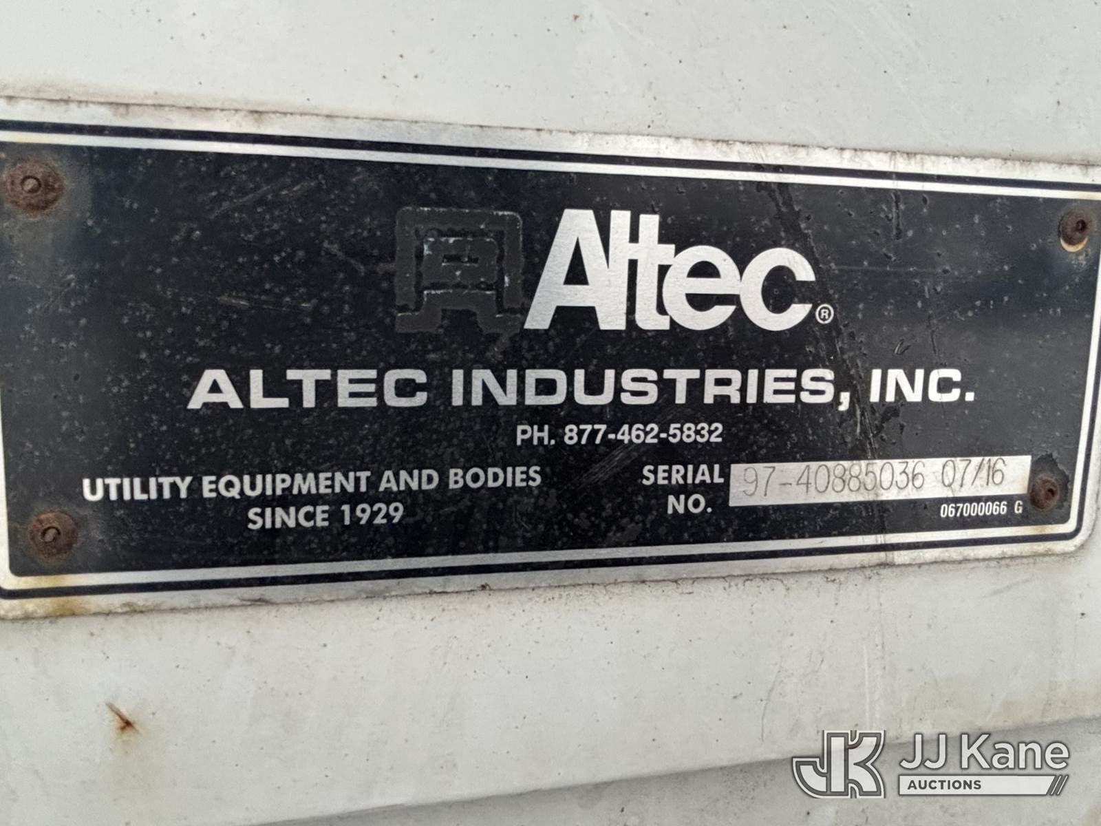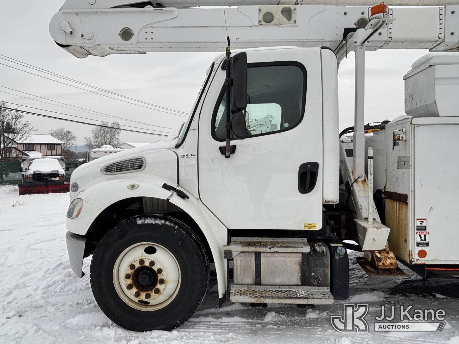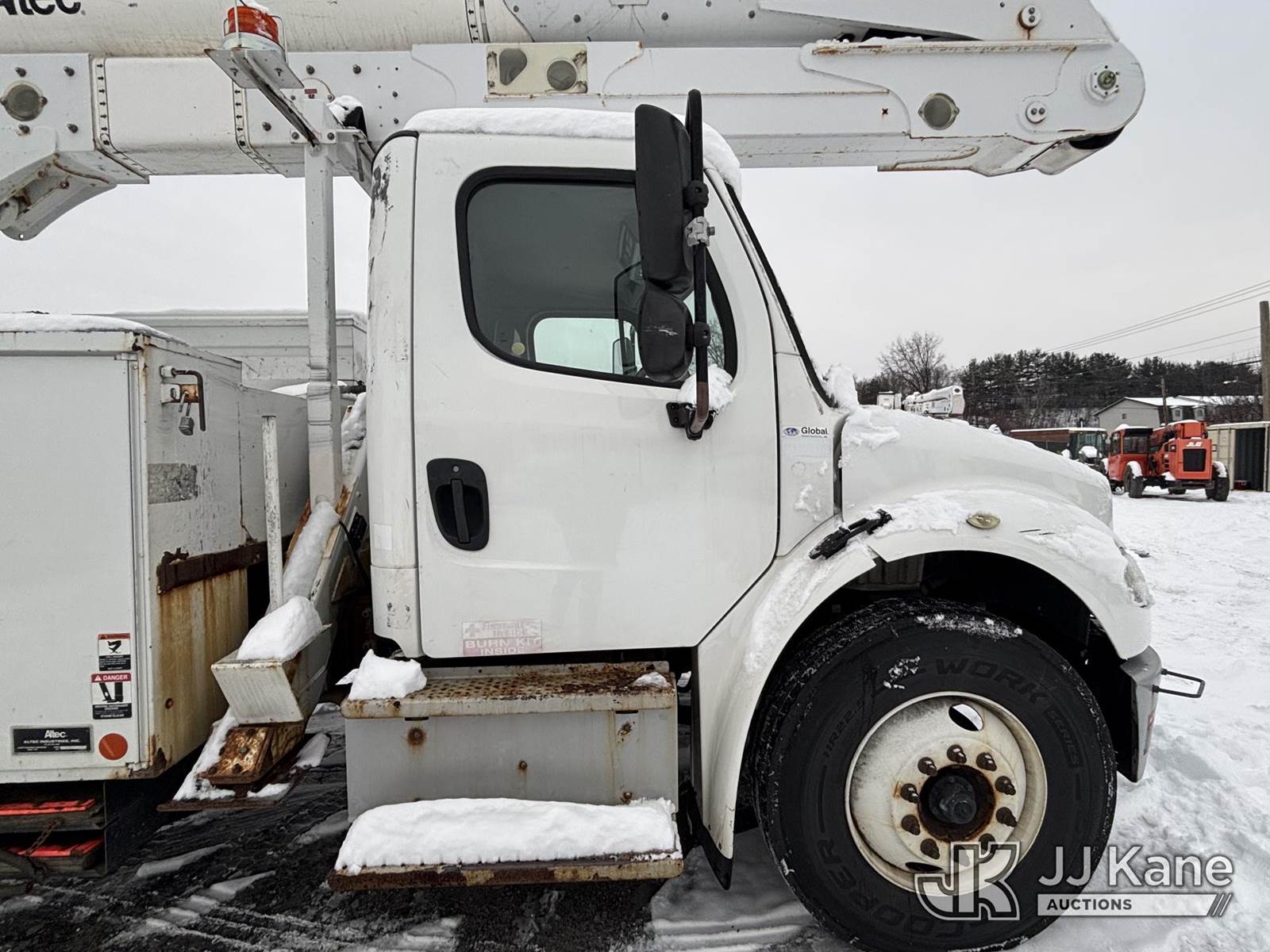 Altec AA55, 60 ft, Material Handling Bucket Truck s/n 0816FH3346, with 4 Outriggers, 2-Man Bucket With Jib & Rope Winch On Insulated, Articulating, Non-Over Center Booms, rear mounted on 2017 Freightliner M2 106 Utility Truck, 6.7L L6 Diesel, Auto, A/C, (48,425 miles) (Runs & Moves, Condition Unknown, Red Tagged: Rust Rotted Outriggers, Potential Subbase Weld & Rust Damage, Rear End Damage, Boom Tip Damage, Body & Rust Damage, **Dealer Only** This item has been removed from service due to the listed safety repairs not being completed. The safety items below must be completed by an approved OEM facility before the unit can return to service: REPLACE DAMAGED/RUSTED OUTRIGGER LEGS; COMPLETE ANSI INSPECTION; COMPLETE ANY REQUIRED TESTING AFTER REPAIRS AND INSPECTIONS ARE COMPLETED.) (Reads 9,114 hours) (Bidding Restricted to Licensed Vehicle Dealers Only), This is a Titled Item NOTE: This unit is being sold AS IS/WHERE IS via Timed Auction and is located in Plains, PA. For pre-sale questions, please contact Mary Darlington @ 570-899-4930 or Mary.Darlington@JJKane.com. JJ Kane Plains, PA yard is open for inspection on the Friday and Monday before the sale date from 9:00 am to 3:00 pm. REMOVAL: All items must be removed by 10 calendar days after the sale, Monday - Friday (Excluding Holidays). (Manuals provided in cab) (Buyer is responsible for removal. Assistance by consignor or JJ Kane Auctions is not assured.)