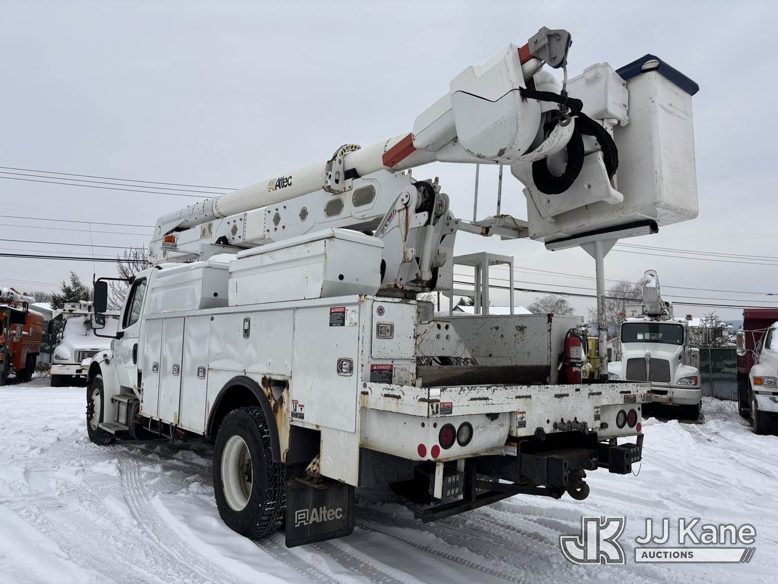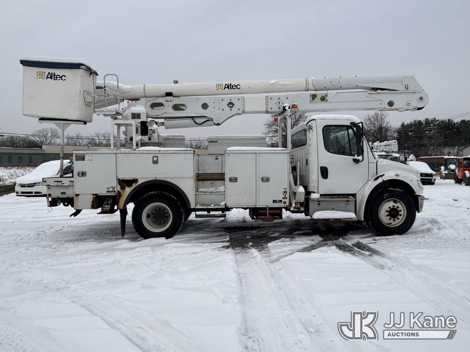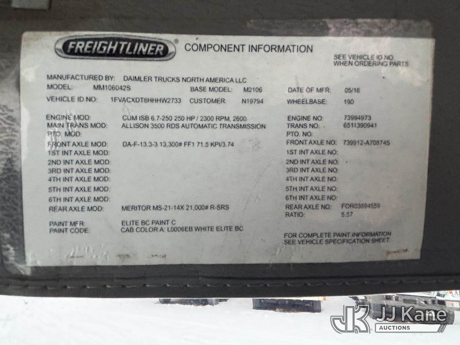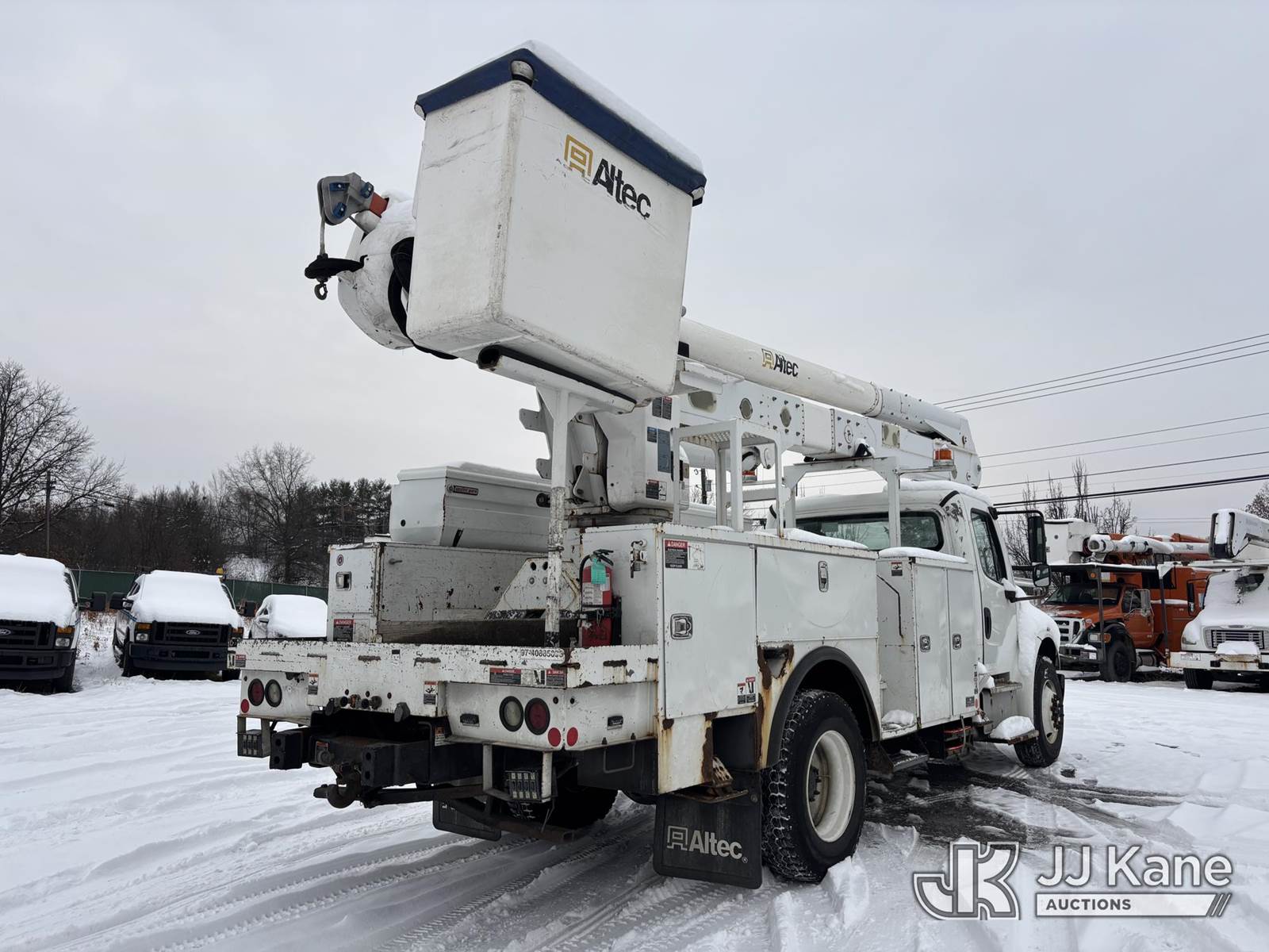 Altec AA55, 60 ft, Material Handling Bucket Truck s/n 0816FH3346, with 4 Outriggers, 2-Man Bucket With Jib & Rope Winch On Insulated, Articulating, Non-Over Center Booms, rear mounted on 2017 Freightliner M2 106 Utility Truck, 6.7L L6 Diesel, Auto, A/C, (48,425 miles) (Runs & Moves, Condition Unknown, Red Tagged: Rust Rotted Outriggers, Potential Subbase Weld & Rust Damage, Rear End Damage, Boom Tip Damage, Body & Rust Damage, **Dealer Only** This item has been removed from service due to the listed safety repairs not being completed. The safety items below must be completed by an approved OEM facility before the unit can return to service: REPLACE DAMAGED/RUSTED OUTRIGGER LEGS; COMPLETE ANSI INSPECTION; COMPLETE ANY REQUIRED TESTING AFTER REPAIRS AND INSPECTIONS ARE COMPLETED.) (Reads 9,114 hours) (Bidding Restricted to Licensed Vehicle Dealers Only), This is a Titled Item NOTE: This unit is being sold AS IS/WHERE IS via Timed Auction and is located in Plains, PA. For pre-sale questions, please contact Mary Darlington @ 570-899-4930 or Mary.Darlington@JJKane.com. JJ Kane Plains, PA yard is open for inspection on the Friday and Monday before the sale date from 9:00 am to 3:00 pm. REMOVAL: All items must be removed by 10 calendar days after the sale, Monday - Friday (Excluding Holidays). (Manuals provided in cab) (Buyer is responsible for removal. Assistance by consignor or JJ Kane Auctions is not assured.)