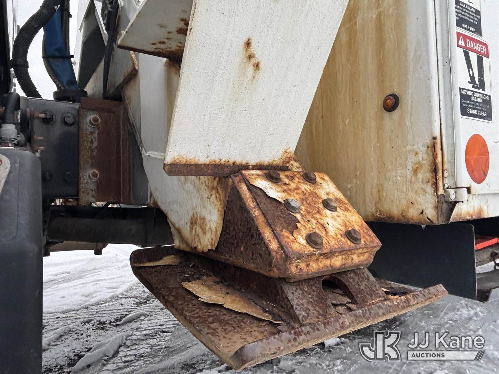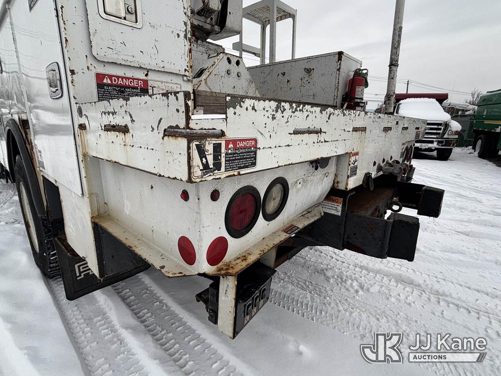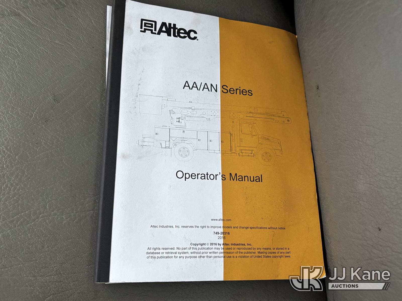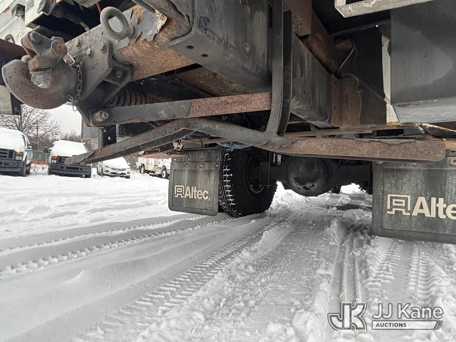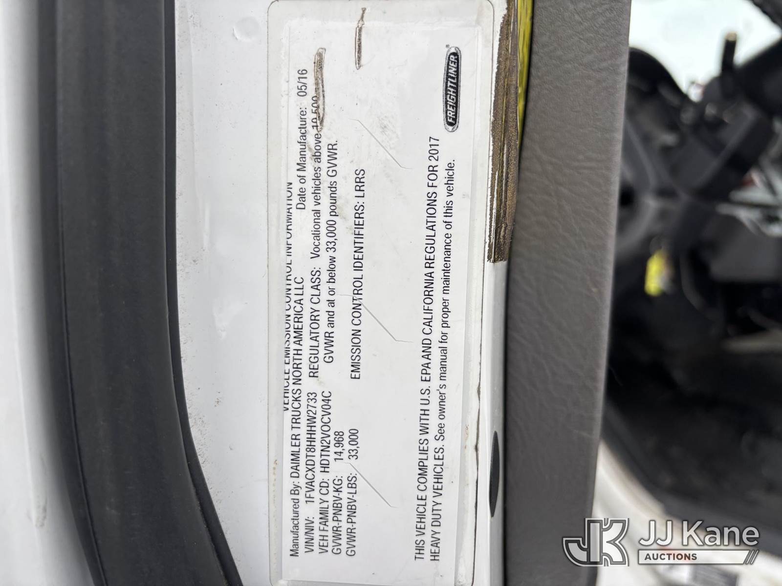 Altec AA55, 60 ft, Material Handling Bucket Truck s/n 0816FH3346, with 4 Outriggers, 2-Man Bucket With Jib & Rope Winch On Insulated, Articulating, Non-Over Center Booms, rear mounted on 2017 Freightliner M2 106 Utility Truck, 6.7L L6 Diesel, Auto, A/C, (48,425 miles) (Runs & Moves, Condition Unknown, Red Tagged: Rust Rotted Outriggers, Potential Subbase Weld & Rust Damage, Rear End Damage, Boom Tip Damage, Body & Rust Damage, **Dealer Only** This item has been removed from service due to the listed safety repairs not being completed. The safety items below must be completed by an approved OEM facility before the unit can return to service: REPLACE DAMAGED/RUSTED OUTRIGGER LEGS; COMPLETE ANSI INSPECTION; COMPLETE ANY REQUIRED TESTING AFTER REPAIRS AND INSPECTIONS ARE COMPLETED.) (Reads 9,114 hours) (Bidding Restricted to Licensed Vehicle Dealers Only), This is a Titled Item NOTE: This unit is being sold AS IS/WHERE IS via Timed Auction and is located in Plains, PA. For pre-sale questions, please contact Mary Darlington @ 570-899-4930 or Mary.Darlington@JJKane.com. JJ Kane Plains, PA yard is open for inspection on the Friday and Monday before the sale date from 9:00 am to 3:00 pm. REMOVAL: All items must be removed by 10 calendar days after the sale, Monday - Friday (Excluding Holidays). (Manuals provided in cab) (Buyer is responsible for removal. Assistance by consignor or JJ Kane Auctions is not assured.)