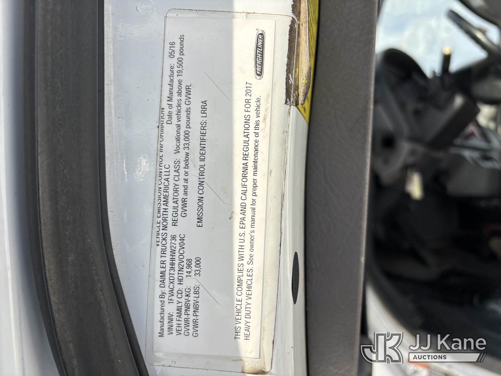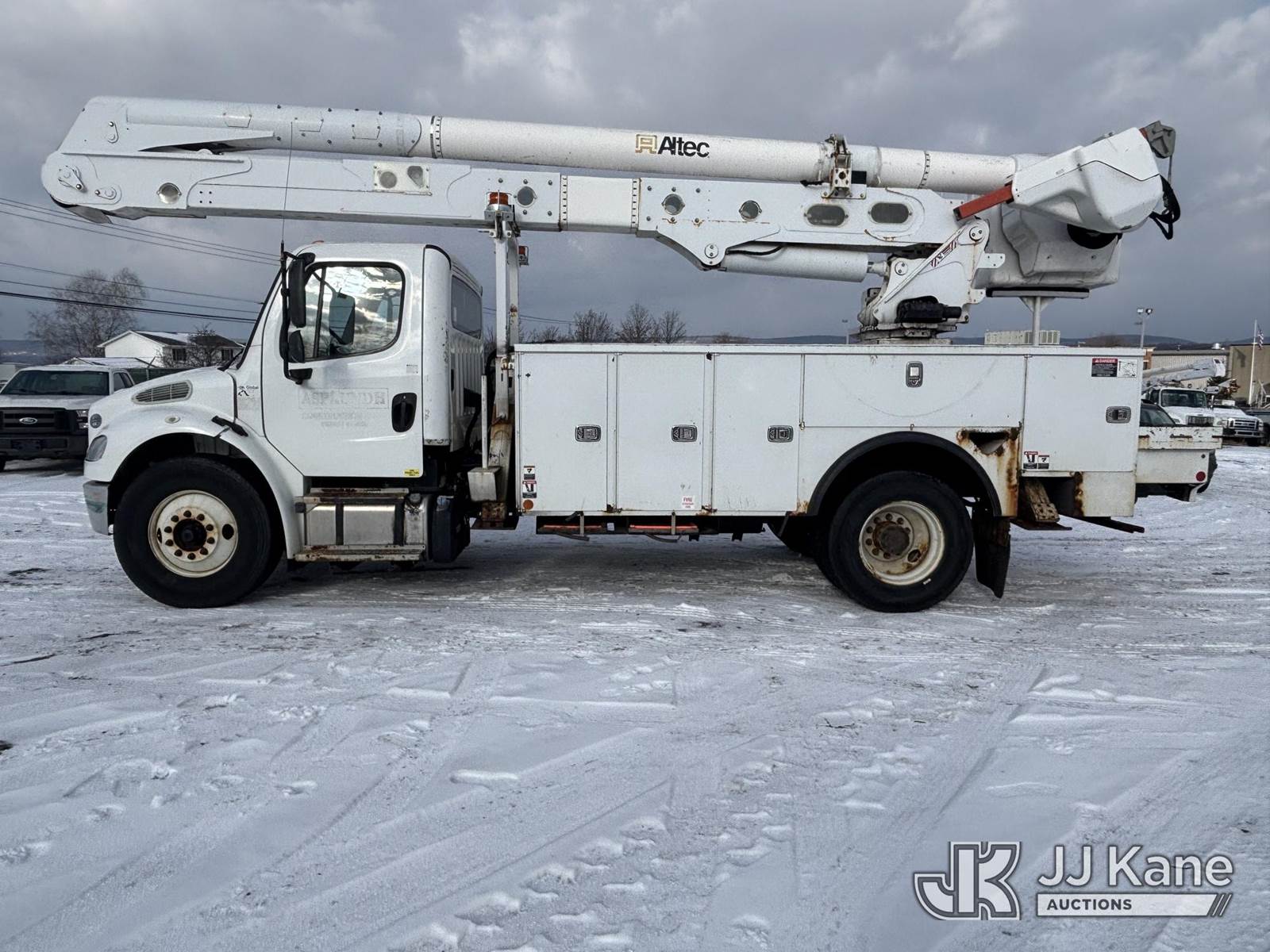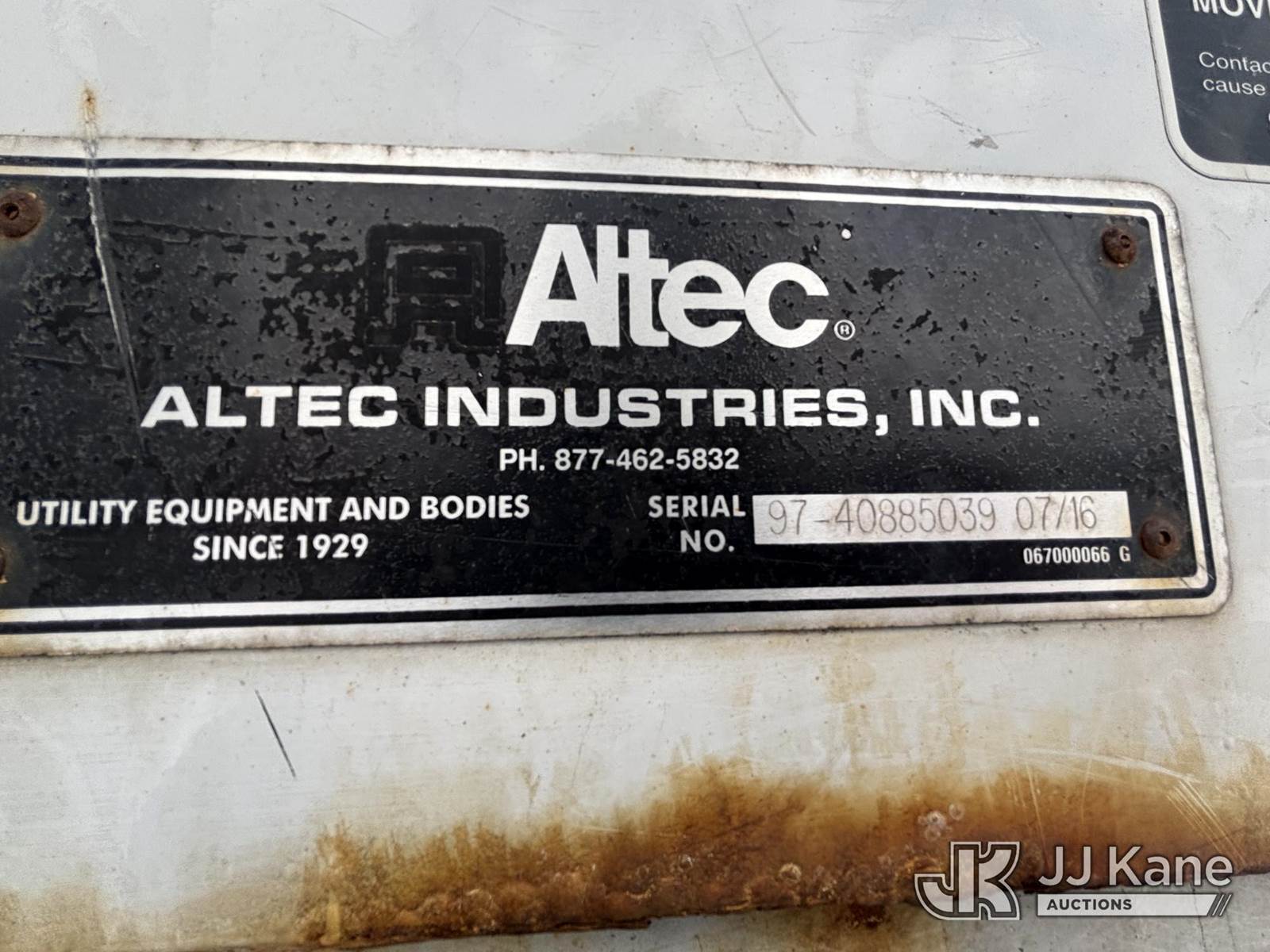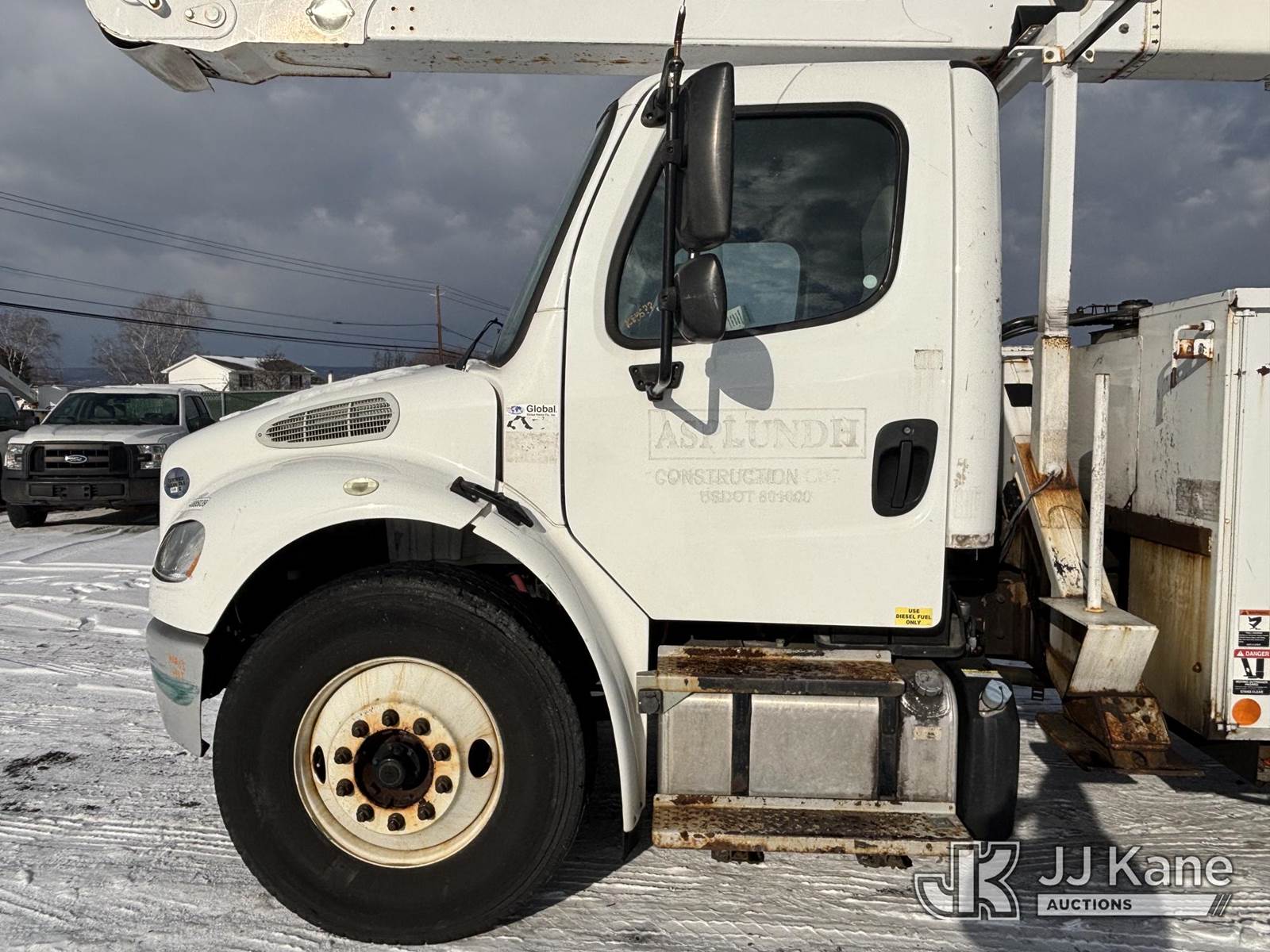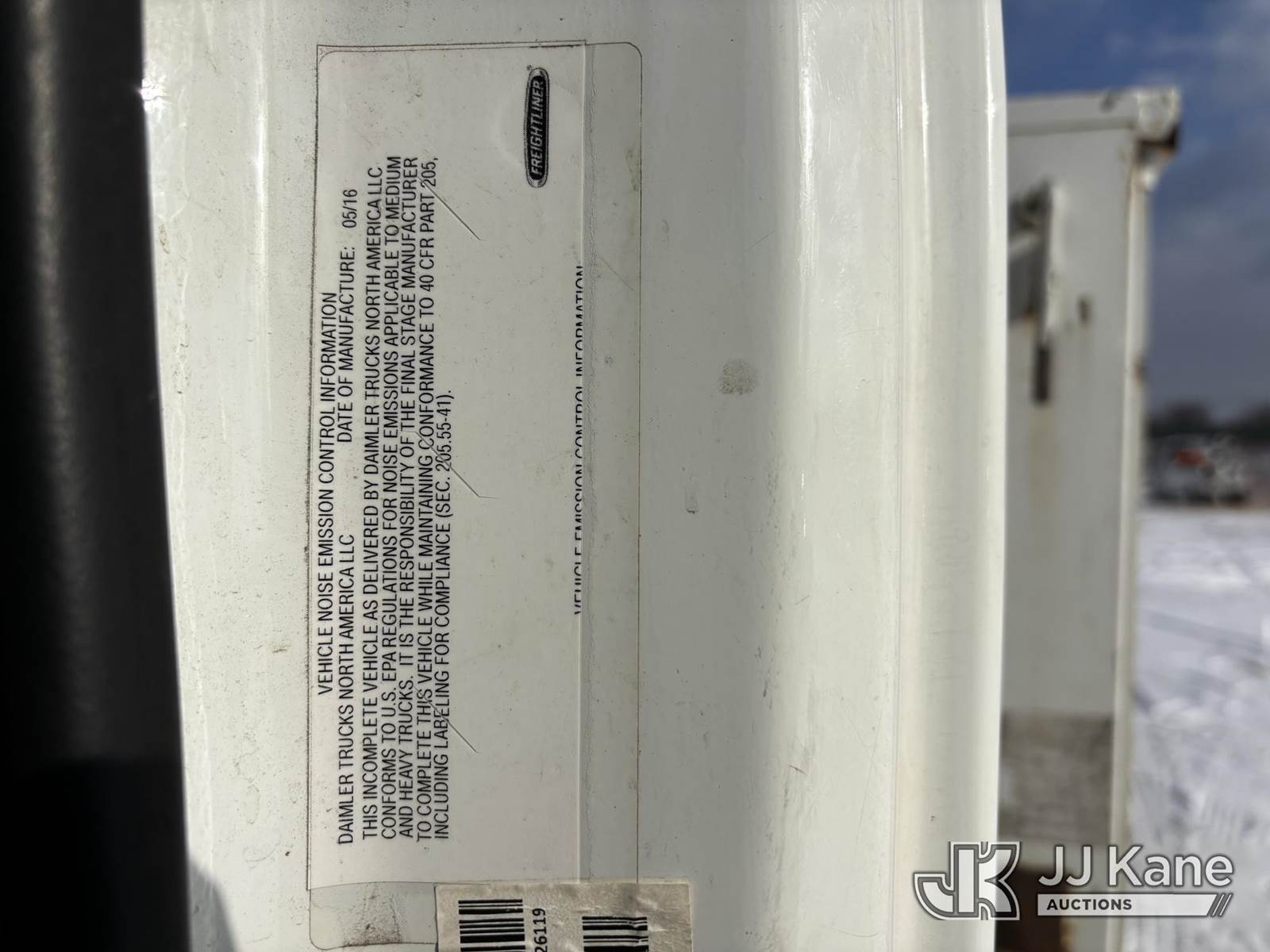 Altec AA55, 60 ft, Material Handling Bucket Truck s/n 0616FH5635, with two-man bucket & 4 hyd outriggers, rear mounted on 2017 Freightliner M2 106 Utility Truck, 6.7L L6 diesel, Auto, A/C, (62,064 miles) (Runs & Moves) (Red Tagged For Rotted Outriggers, Condition Unknown, Check & Service Engine Lights On Dash, Outrigger Feet Warped, Fiberglass Damage On Bucket, Missing Serial Plate, Serial Number Illegible, Main Boom Pin Bearings Damaged, Body & Rust Damage) (Reads 9,534 hours) This is a Titled Item NOTE: This unit is being sold AS IS/WHERE IS via Timed Auction and is located in Plains, PA. For pre-sale questions, please contact Mary Darlington @ 570-899-4930 or Mary.Darlington@JJKane.com. JJ Kane Plains, PA yard is open for inspection on the Friday and Monday before the sale date from 9:00 am to 3:00 pm. REMOVAL: All items must be removed by 10 calendar days after the sale, Monday - Friday (Excluding Holidays). (Manuals provided in cab) (Buyer is responsible for removal. Assistance by consignor or JJ Kane Auctions is not assured.)