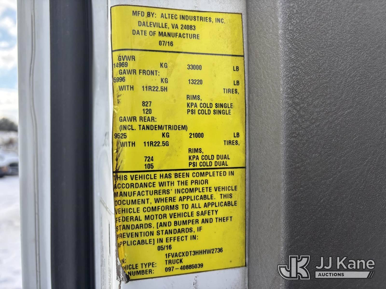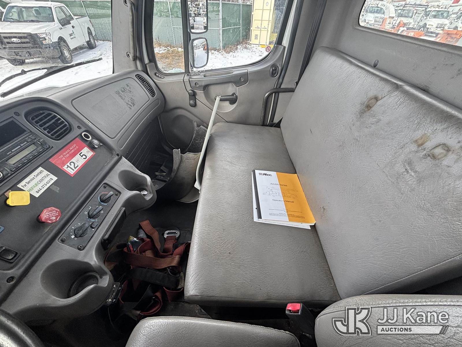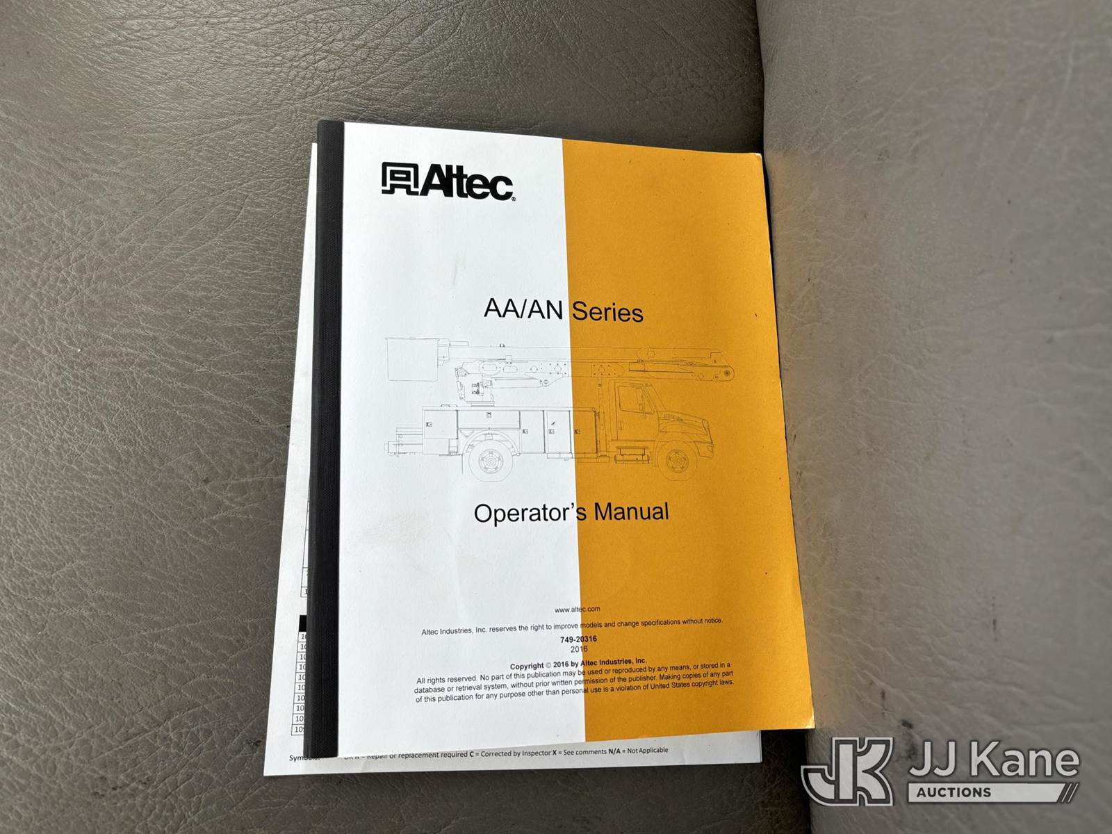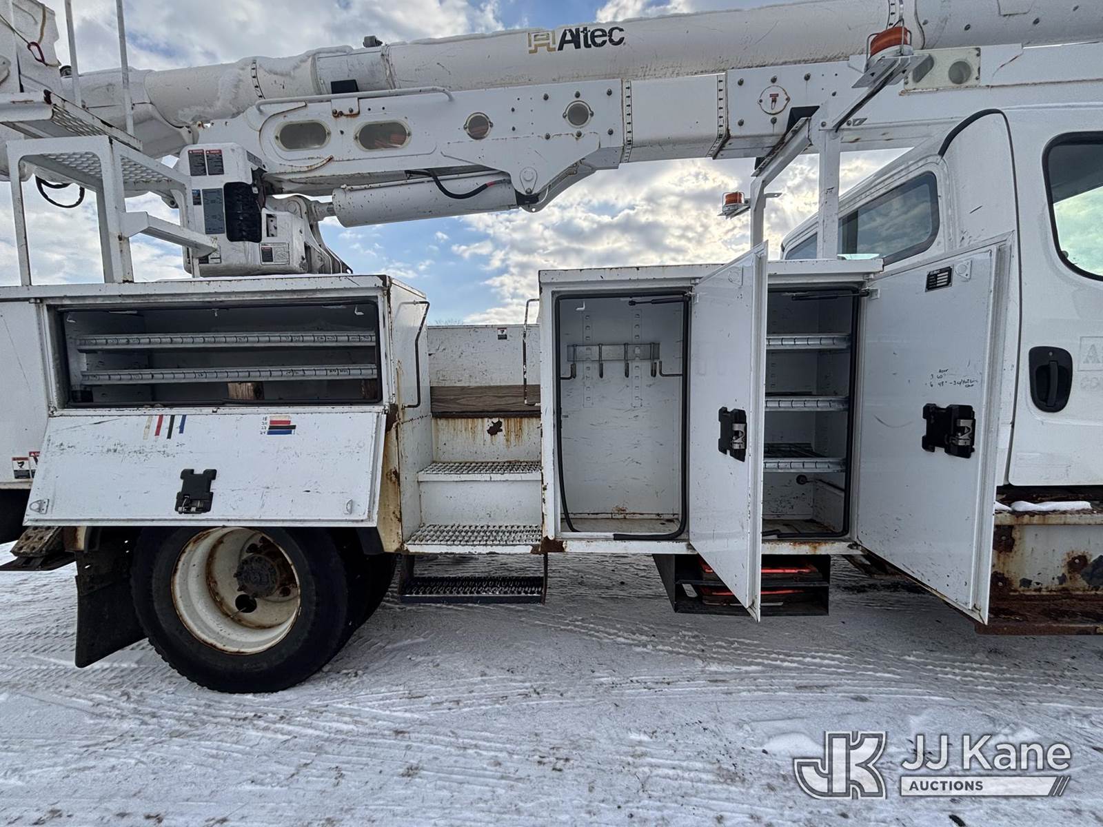 Altec AA55, 60 ft, Material Handling Bucket Truck s/n 0616FH5635, with two-man bucket & 4 hyd outriggers, rear mounted on 2017 Freightliner M2 106 Utility Truck, 6.7L L6 diesel, Auto, A/C, (62,064 miles) (Runs & Moves) (Red Tagged For Rotted Outriggers, Condition Unknown, Check & Service Engine Lights On Dash, Outrigger Feet Warped, Fiberglass Damage On Bucket, Missing Serial Plate, Serial Number Illegible, Main Boom Pin Bearings Damaged, Body & Rust Damage) (Reads 9,534 hours) This is a Titled Item NOTE: This unit is being sold AS IS/WHERE IS via Timed Auction and is located in Plains, PA. For pre-sale questions, please contact Mary Darlington @ 570-899-4930 or Mary.Darlington@JJKane.com. JJ Kane Plains, PA yard is open for inspection on the Friday and Monday before the sale date from 9:00 am to 3:00 pm. REMOVAL: All items must be removed by 10 calendar days after the sale, Monday - Friday (Excluding Holidays). (Manuals provided in cab) (Buyer is responsible for removal. Assistance by consignor or JJ Kane Auctions is not assured.)