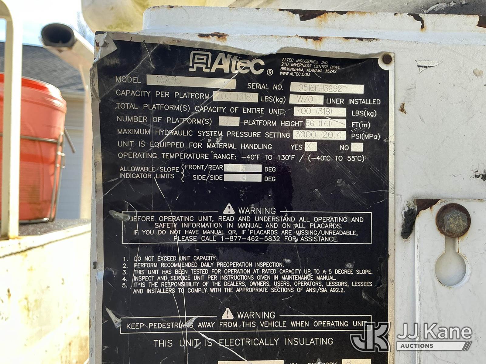 Altec AA55-MH, 60 ft, Material Handling Bucket Truck s/n 0516FH3292, with two man bucket & 4 hydraulic outriggers, rear mounted on 2017 Freightliner M2 106 4x4 Utility Truck, s/n 1FVDCXDT3HHHW2653, 6.7L L6 diesel, Auto, A/C, (73,194 miles) (Runs, Moves & Upper Boom Operates) This is a Titled Item NOTE: This unit is being sold AS IS/WHERE IS via Timed Auction and is located in Aberdeen, NC. For Pre-Sale Questions Contact Pete Klimek at 843-323-6538 (Missing manuals, See Auction Company for Manufacturers Information to obtain manuals) (Buyer is responsible for removal. Assistance by consignor or JJ Kane Auctions is not assured.)