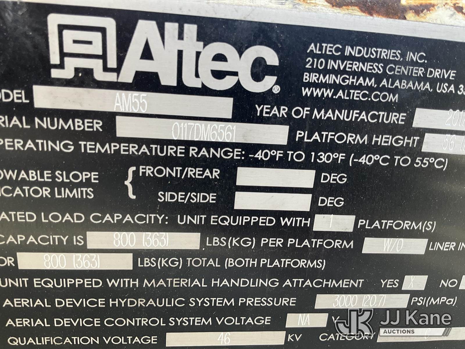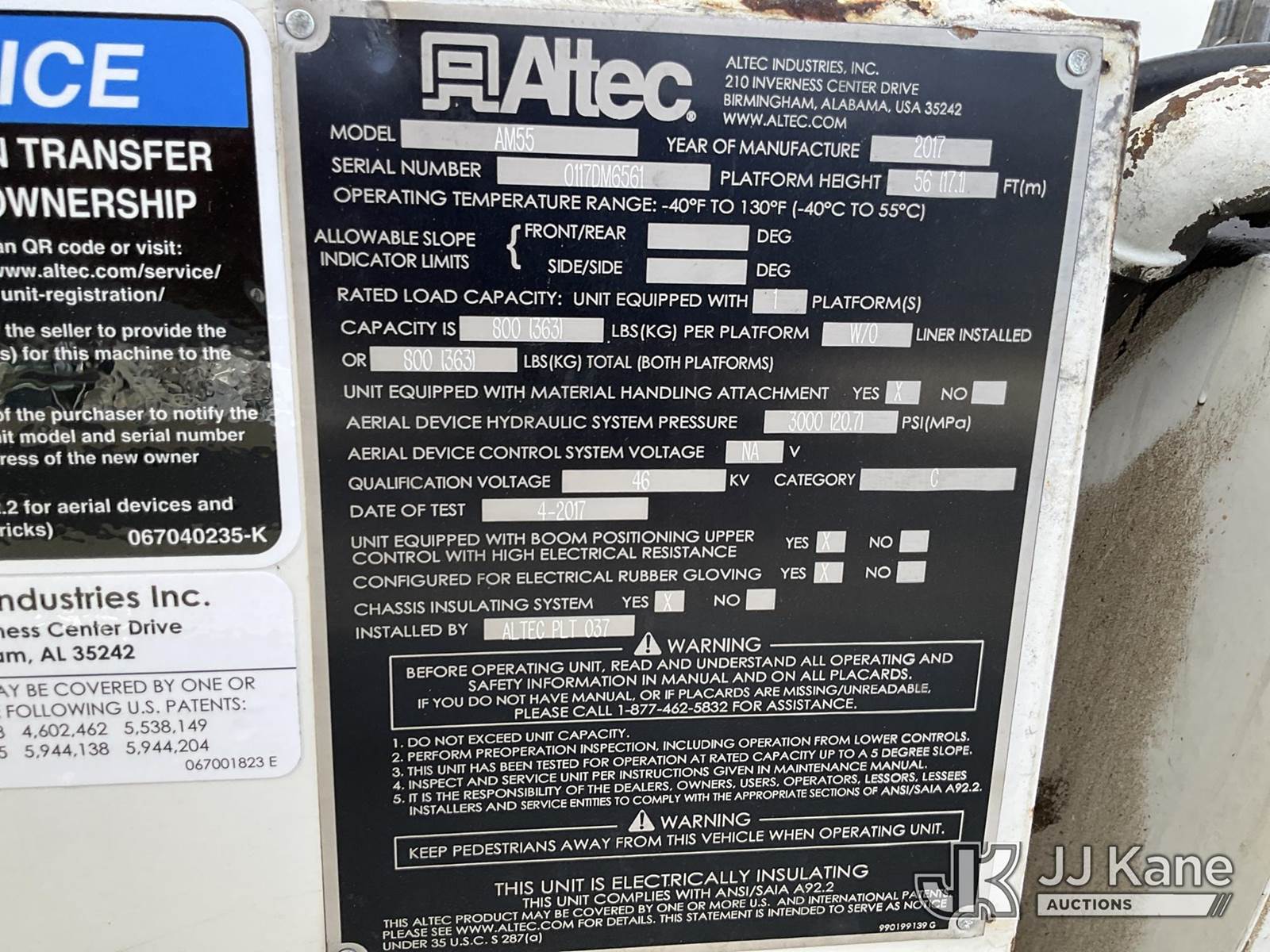 Altec AM55, 60 ft, Articulating Material Handling Bucket Truck s/n 0117DM6561, with two-man bucket & 4 hyd outriggers, rear mounted on 2017 Freightliner M2 106 T/A Utility Truck, 8.9L L6 DIESEL Auto, 6X4, A/C, with front winch, (140,445 miles) (Runs, Moves & Operates ) (Reads 8,409 hours) This is a Titled Item NOTE: This unit is being sold AS IS/WHERE IS via Timed Auction and is located in Conway, AR. For more information & removal arrangements please contact Daniel Flannery @ (816) 294-8182. Load (Manuals provided in cab) (Buyer is responsible for removal. Assistance by consignor or JJ Kane Auctioneers is not assured.)