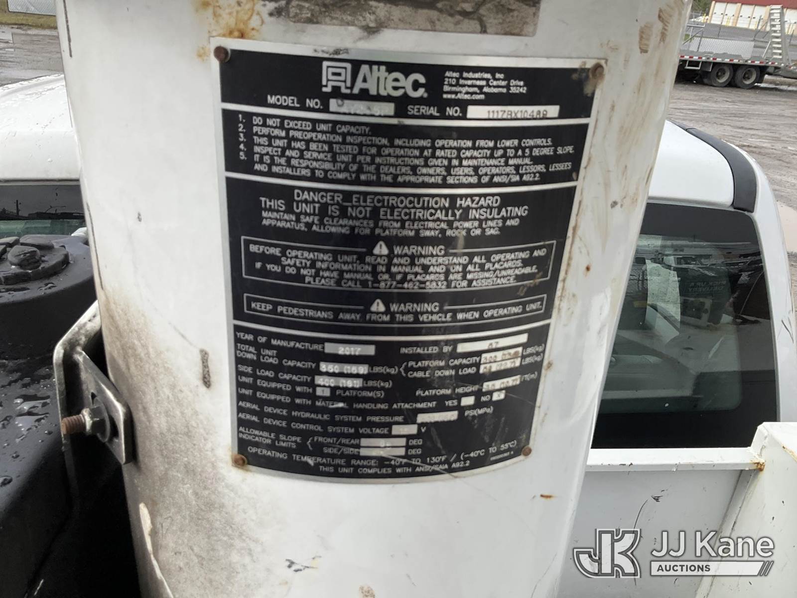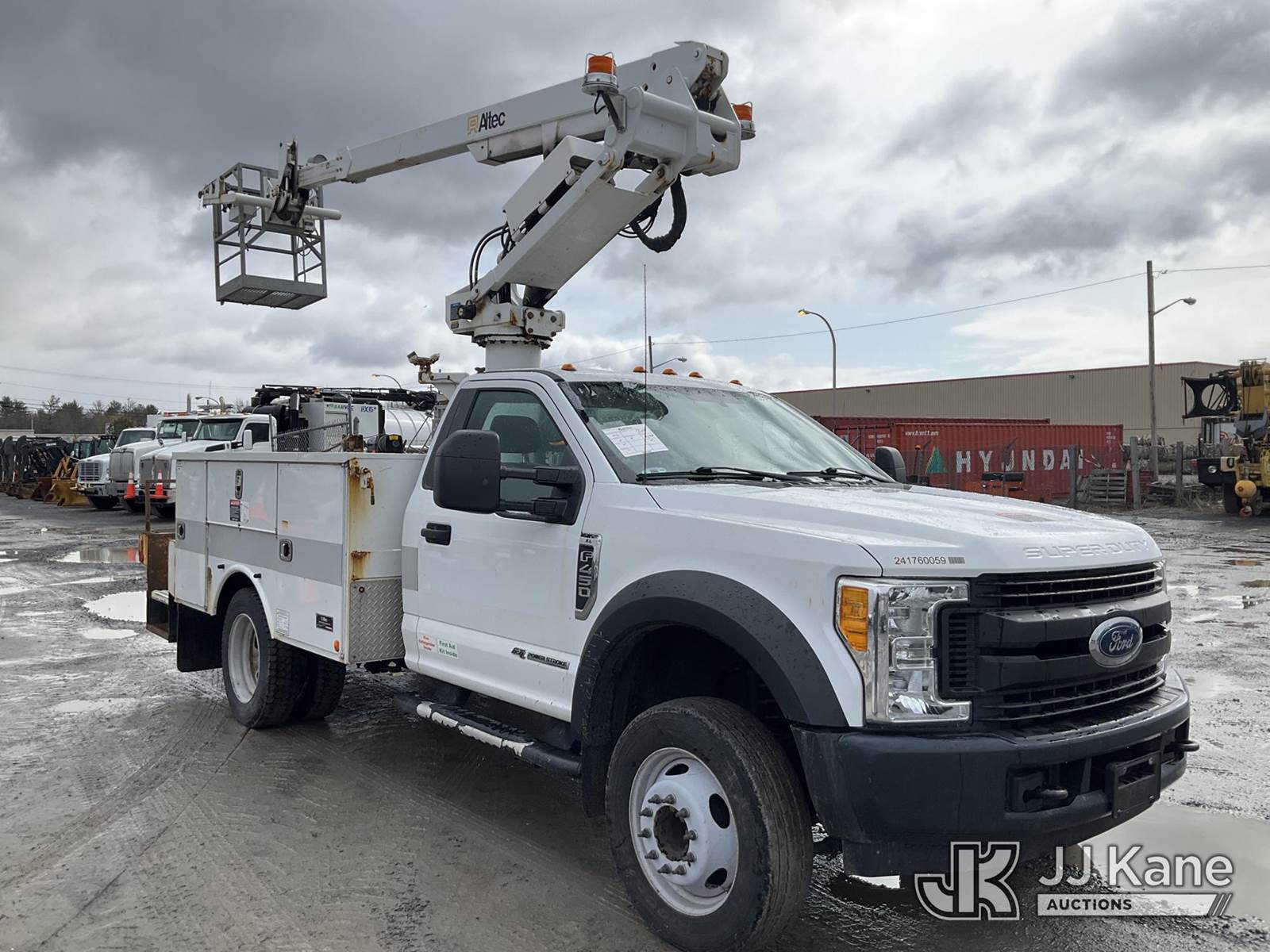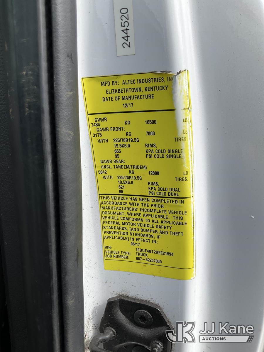 Altec AT235P, 40 ft, Telescopic Non-Insulated Bucket Truck s/n 1117BX10489, with Single-Man Bucket, mounted behind cab on 2017 Ford F450 2WD Service Truck, 6.7L diesel, Auto, A/C, (90,469 miles) (Runs, Moves & Upper Operates, Jump to Start) This is a Titled Item NOTE: This unit is being sold AS IS/WHERE IS via Timed Auction and is located in Rome, NY. Inspection & preview days for this unit are the 2 business days prior to the first day of items closing for this auction, item is located at 5835 Success Dr Rome, NY 13440 and hours of operations are 8a-4p. For pre-sale questions, please contact Ryan Jackson @ (315) 749-3790 or Ryan.Jackson@jjkane.com. (Manuals provided in cab) (Buyer is responsible for removal. Assistance by consignor or JJ Kane Auctions is not assured.)