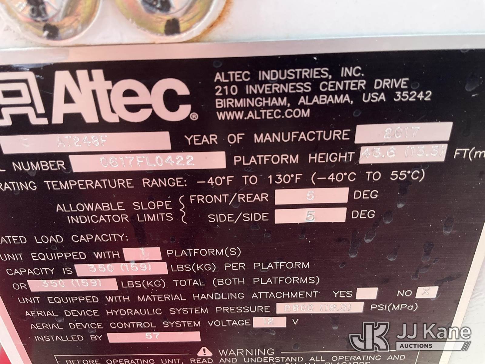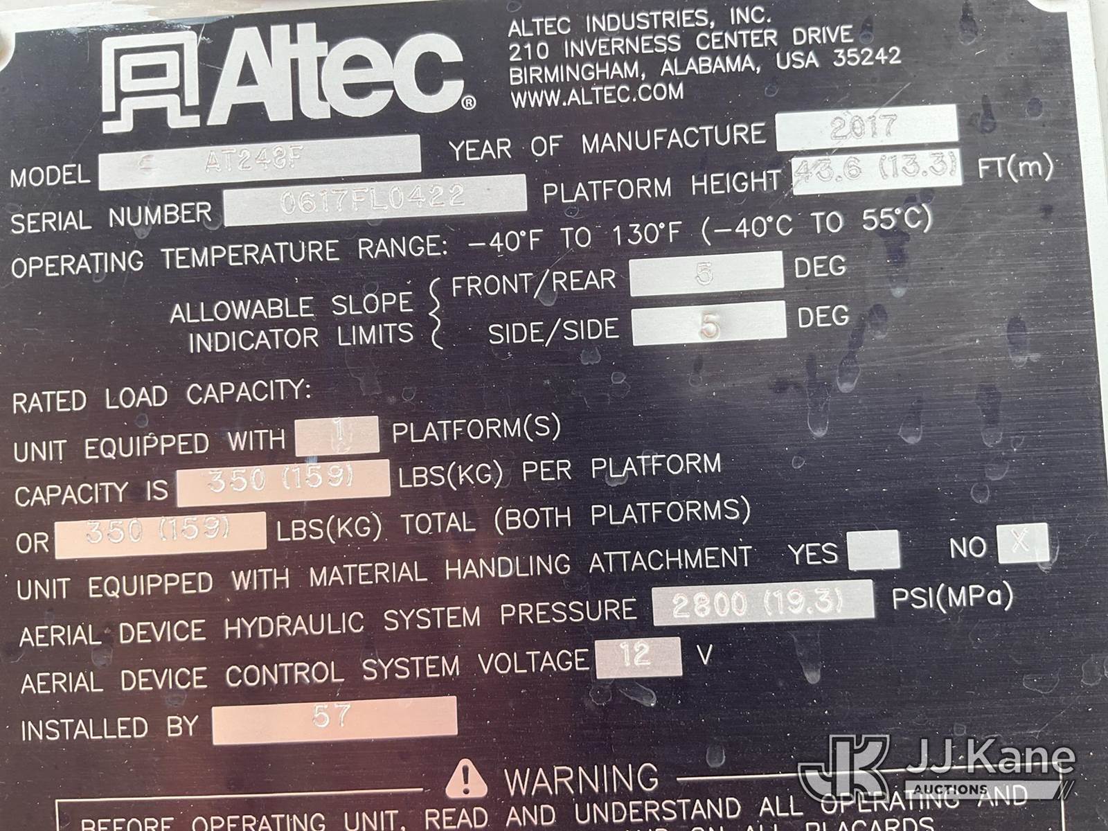 Altec AT248F, 48 ft, Articulating & Telescopic Bucket Truck s/n 0617FL0422, with single-man basket, rear mounted on 2017 RAM 5500 Regular Cab LWB 2WD DRW 6.7L L6 OHV 24V TURBO DIESEL Auto, RWD, A/C, (98,095 miles) (Runs, Moves & Upper Operates) (Check Engine Light On, Light Bulbs In Rear Compartment NOT Included In Sale.) This is a Titled Item NOTE: This unit is being sold AS IS/WHERE IS via Timed Auction and is located in Wichita, KS. (Manuals provided in cab) (Buyer is responsible for removal. Assistance by consignor or JJ Kane Auctioneers is not assured.)