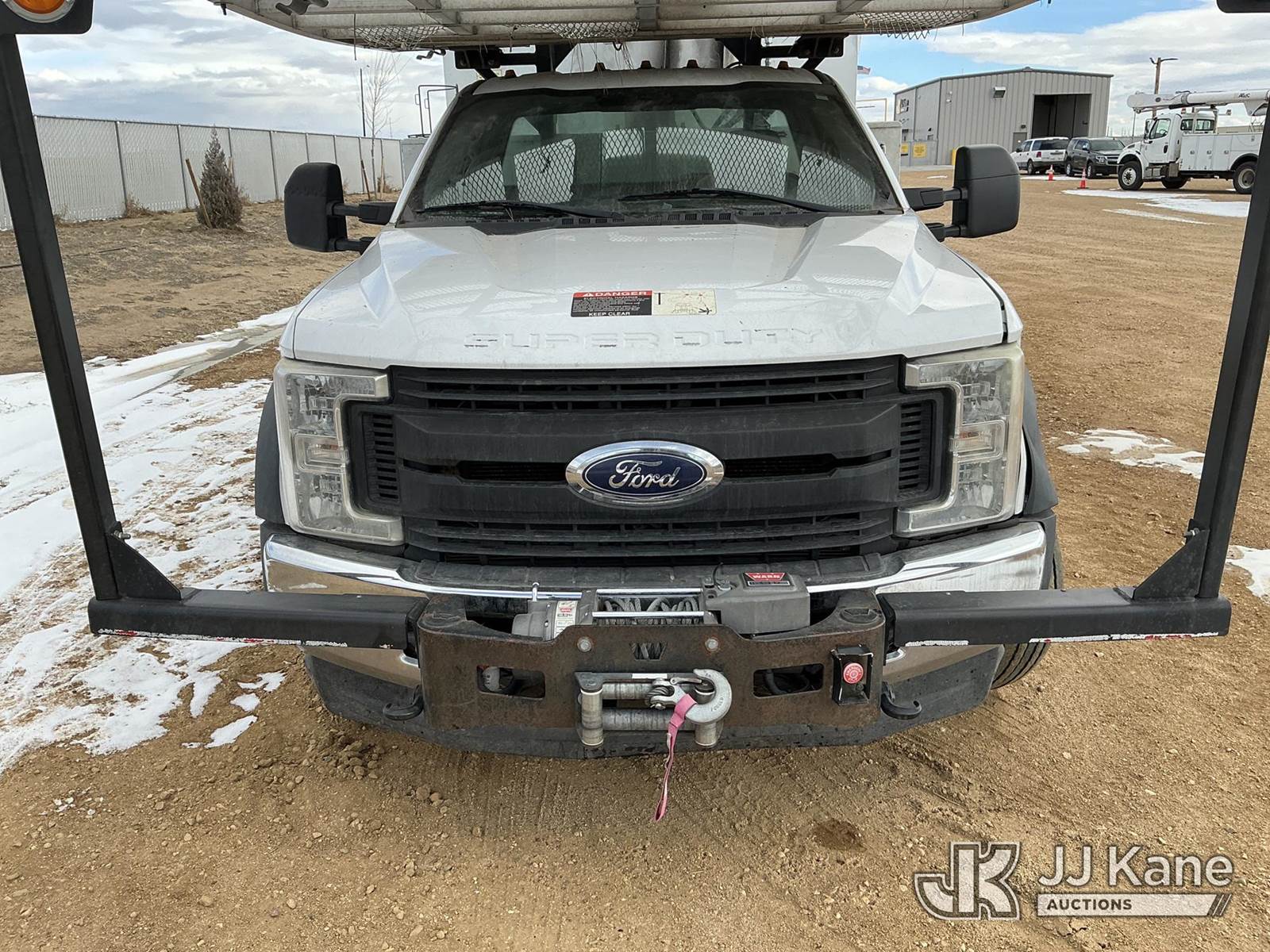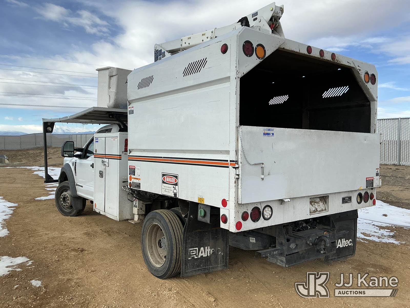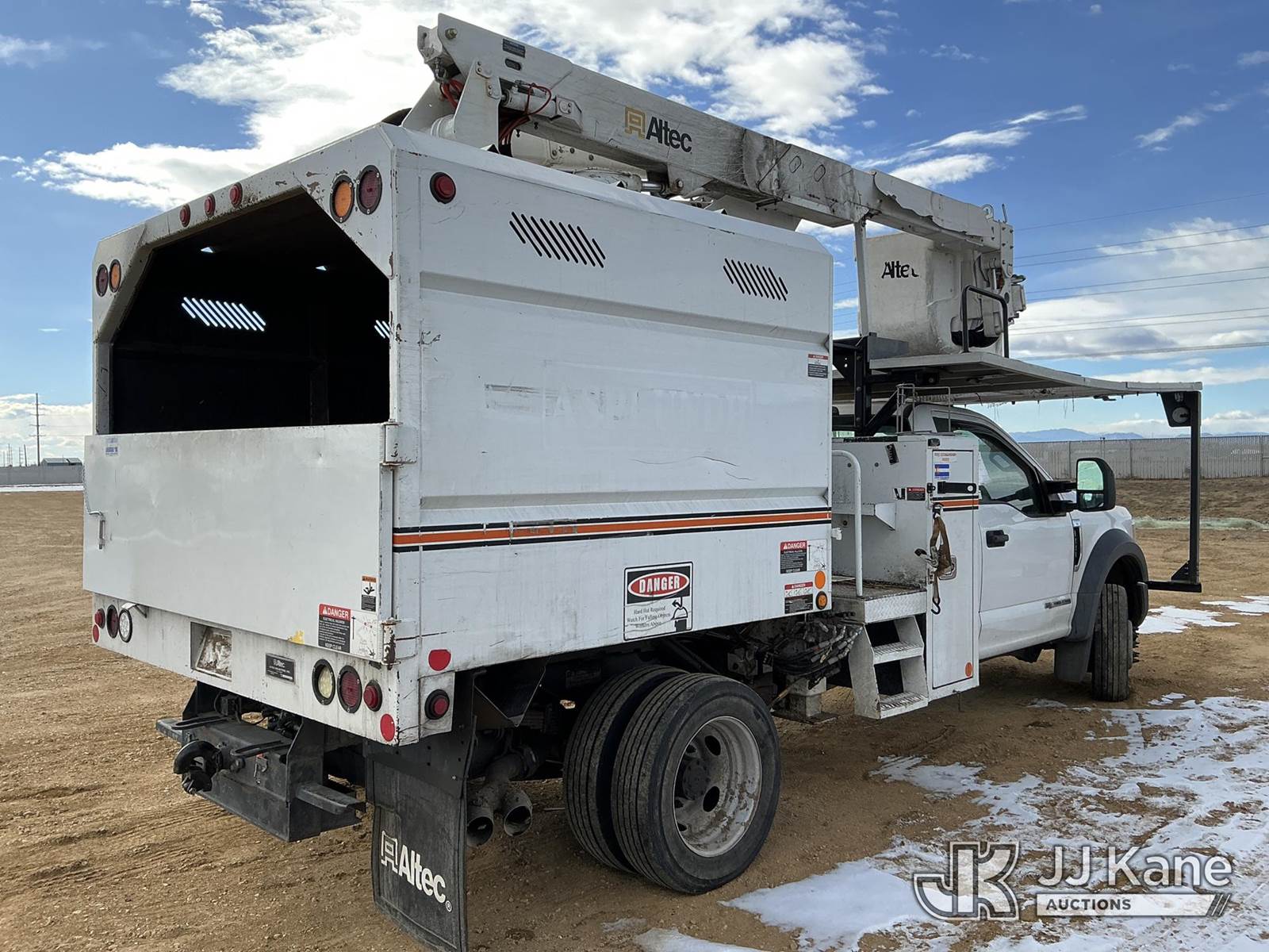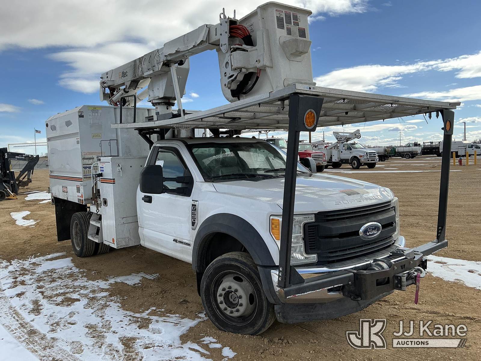 Altec AT37G, 42 ft, Articulating & Telescopic Bucket s/n 0117DE19942, with single man bucket, mounted behind cab on 2017 Ford F-550 Chipper Dump Truck, 6.7L diesel, 4wd, Auto, A/C, with Warn 16.5ti front winch, (59,671 miles) (PTO Reads: 4724 Hrs) (Runs & Moves) (Does Not Operate - Condition Unknown, PTO Does Not Engage, Boom, Dump & Outriggers Do Not Operate, Service Advance Trac Warning When PTO Engaged, Check Engine Light On: Condition Unknown) (No Emissions Provided, See Bidder Agreement) (Seller States: Needs Major Repairs, New Engine, Transmission, Hydraulic System) (Non Drive Away Removal Only: Fails Safety Inspect) (Reads 11,087 hours) This is a Titled Item NOTE: This unit is being sold AS IS/WHERE IS via Timed Auction and is located in Fort Lupton, CO. Inspection & preview days for this unit are the 2 business days prior to the first day of items closing for this auction, item is located at 2105 Northland Dr Fort Lupton, CO 80621 and hours of operations are 8a-4p. For pre-sale questions, please contact Dakota Hoffman @ (720) 621-0786. Dealer License Number 47109. (Manuals provided in cab) (Buyer is responsible for removal. Assistance by consignor or JJ Kane Auctions is not assured.)