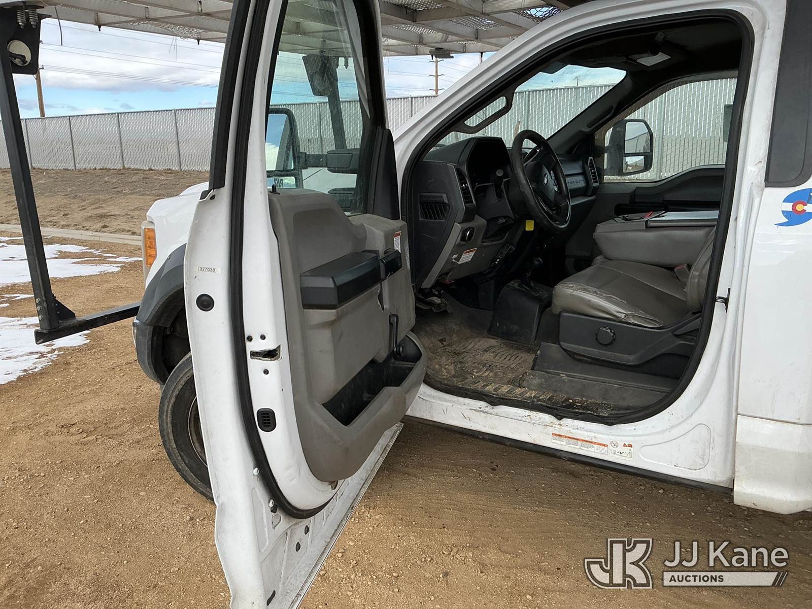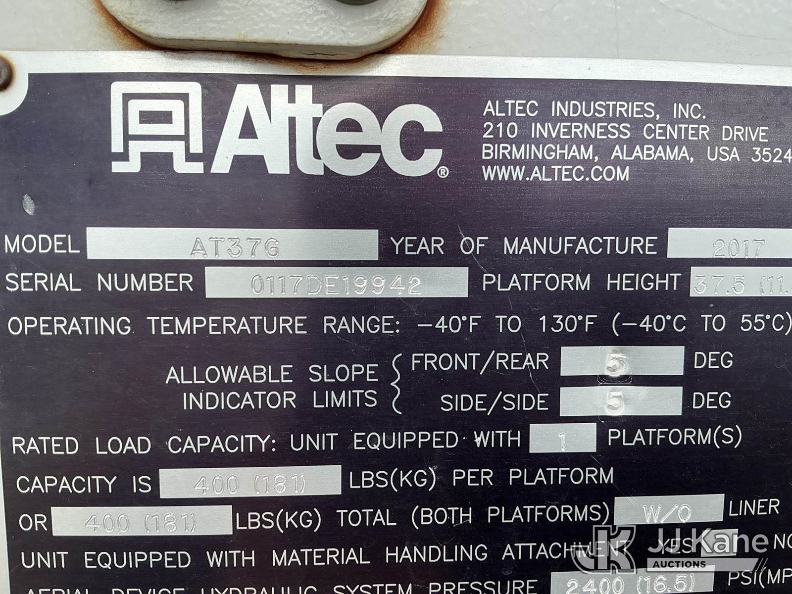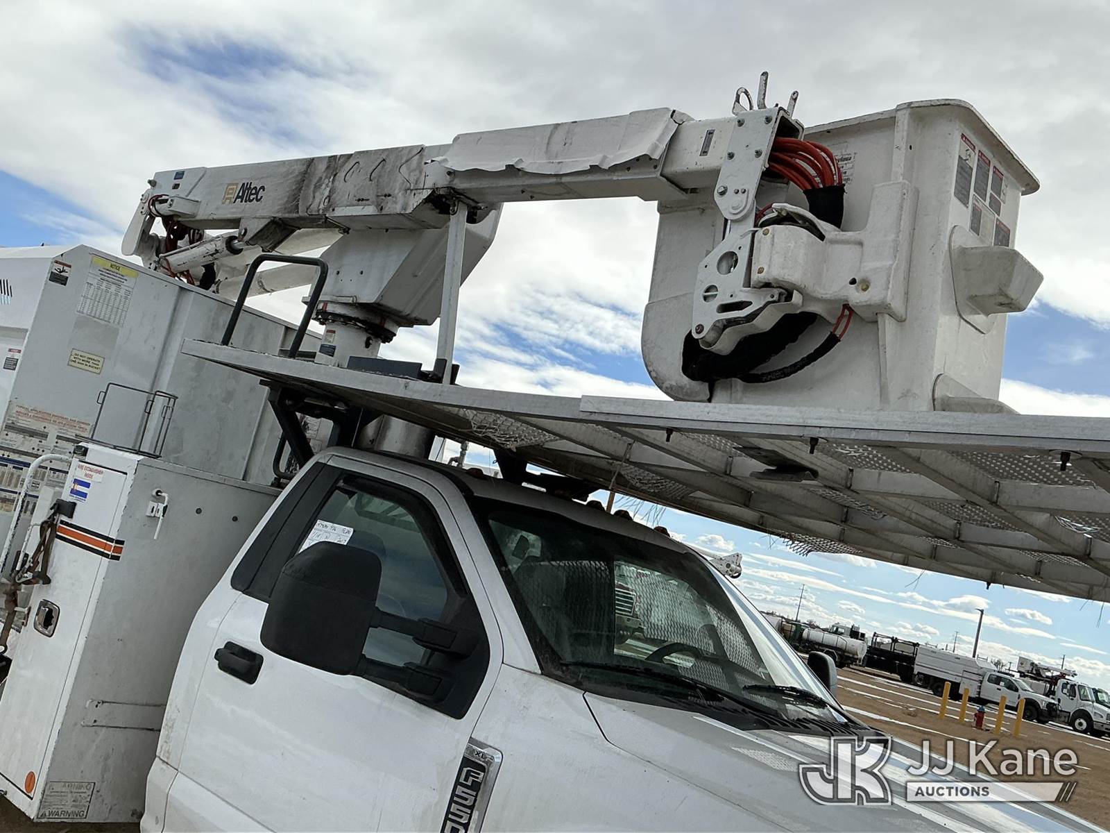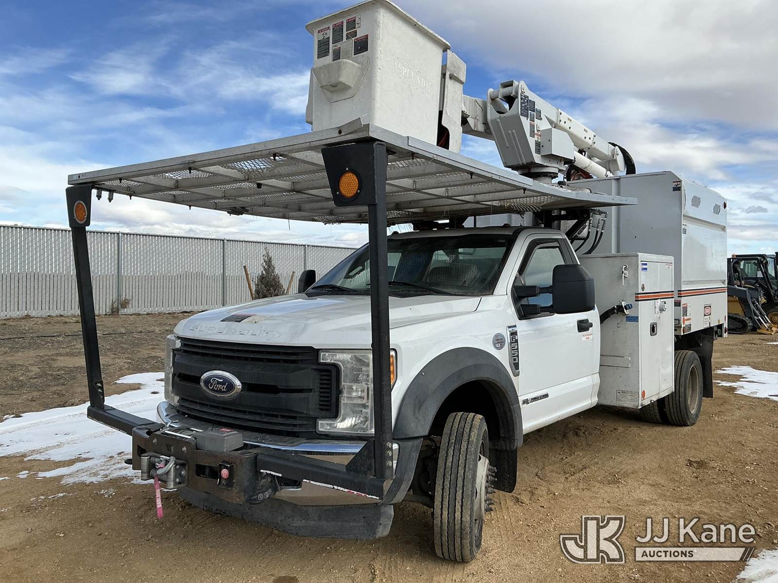 Altec AT37G, 42 ft, Articulating & Telescopic Bucket s/n 0117DE19942, with single man bucket, mounted behind cab on 2017 Ford F-550 Chipper Dump Truck, 6.7L diesel, 4wd, Auto, A/C, with Warn 16.5ti front winch, (59,671 miles) (PTO Reads: 4724 Hrs) (Runs & Moves) (Does Not Operate - Condition Unknown, PTO Does Not Engage, Boom, Dump & Outriggers Do Not Operate, Service Advance Trac Warning When PTO Engaged, Check Engine Light On: Condition Unknown) (No Emissions Provided, See Bidder Agreement) (Seller States: Needs Major Repairs, New Engine, Transmission, Hydraulic System) (Non Drive Away Removal Only: Fails Safety Inspect) (Reads 11,087 hours) This is a Titled Item NOTE: This unit is being sold AS IS/WHERE IS via Timed Auction and is located in Fort Lupton, CO. Inspection & preview days for this unit are the 2 business days prior to the first day of items closing for this auction, item is located at 2105 Northland Dr Fort Lupton, CO 80621 and hours of operations are 8a-4p. For pre-sale questions, please contact Dakota Hoffman @ (720) 621-0786. Dealer License Number 47109. (Manuals provided in cab) (Buyer is responsible for removal. Assistance by consignor or JJ Kane Auctions is not assured.)