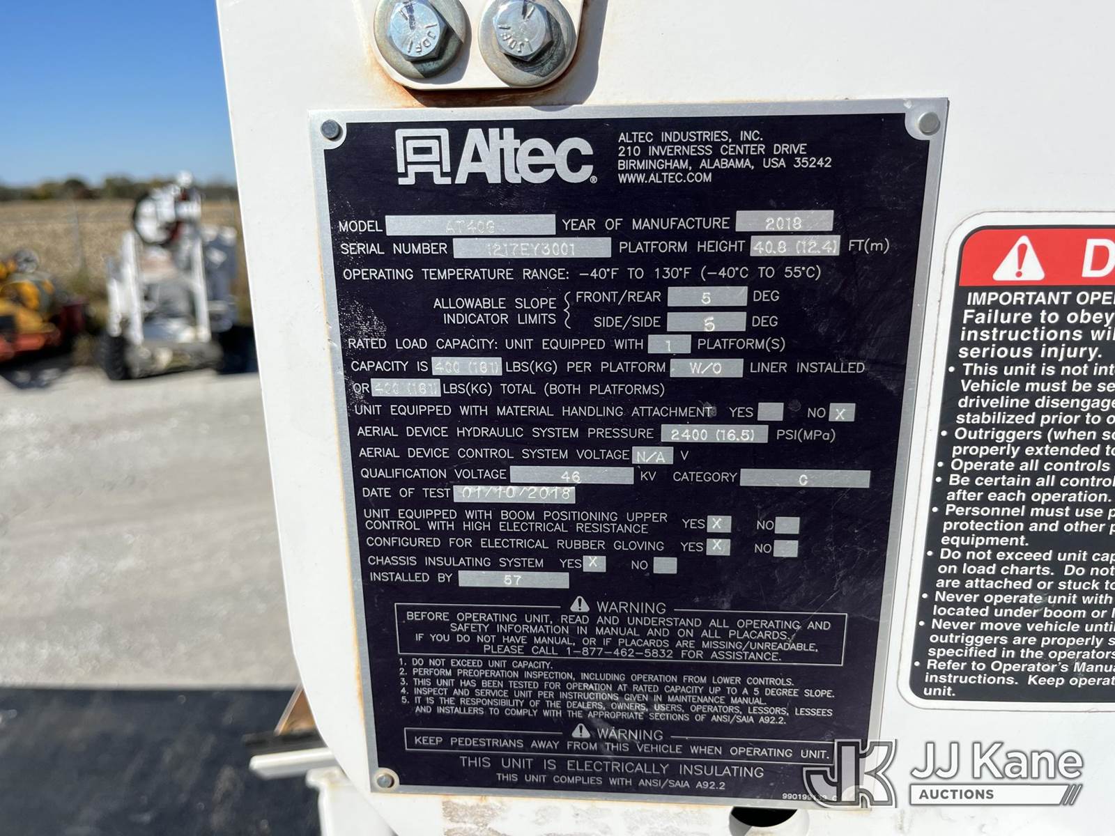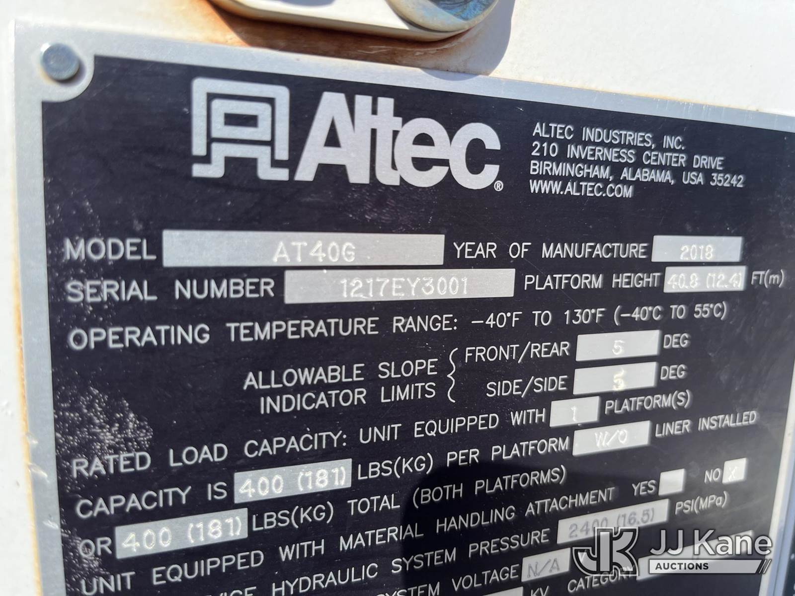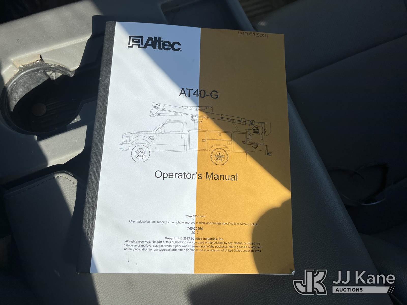 Altec AT40G, 45 ft, Articulating & Telescopic Bucket Truck s/n 1217EY3001, with single-man bucket, mounted behind cab on 2017 Ford F550 4x4 Service Truck, 6.7L Auto, diesel, A/C, (204,461 miles) (Runs, Moves & Upper Operates) (Body Damage) (Reads 12,540 hours) This is a Titled Item NOTE: This unit is being sold AS IS/WHERE IS via Timed Auction and is located in Hawk Point, MO. Inspection & preview days for this unit are the 2 business days prior to the first day of items closing for this auction, item is located at 25 State Highway A Hawk Point, MO 63349 and hours of operations are 8a-4p. For pre-sale questions, please contact Adam Stanek at (636) 295-1594. (Manuals provided in cab) (Buyer is responsible for removal. Assistance by consignor or JJ Kane Auctioneers is not assured.)