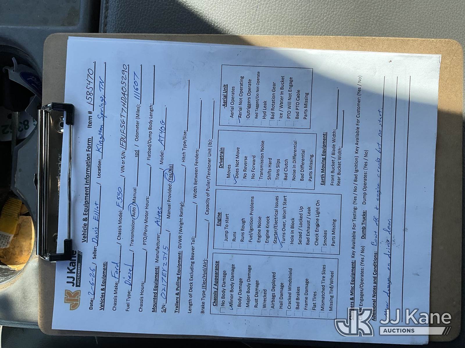 Altec AT40G, 45 ft, Articulating & Telescopic Bucket Truck s/n 0217EY2345, with single-man bucket, mounted behind cab on 2017 Ford F-550 Service Truck, 6.7L diesel, RWD, Auto, A/C, (111,607 miles) (Not Running, Condition Unknown, Cranks, Seller Note: Fuel System Issue, Upper Operates) This is a Titled Item NOTE: This unit is being sold AS IS/WHERE IS via Timed Auction and is located in Kingston Springs, TN. Inspection & preview days for this unit are by appointment only; please contact us at contact@jjkane.com or 84-Go-JJKane for more details. (Manuals provided in cab) (Buyer is responsible for removal. Assistance by consignor or JJ Kane Auctions is not assured.)