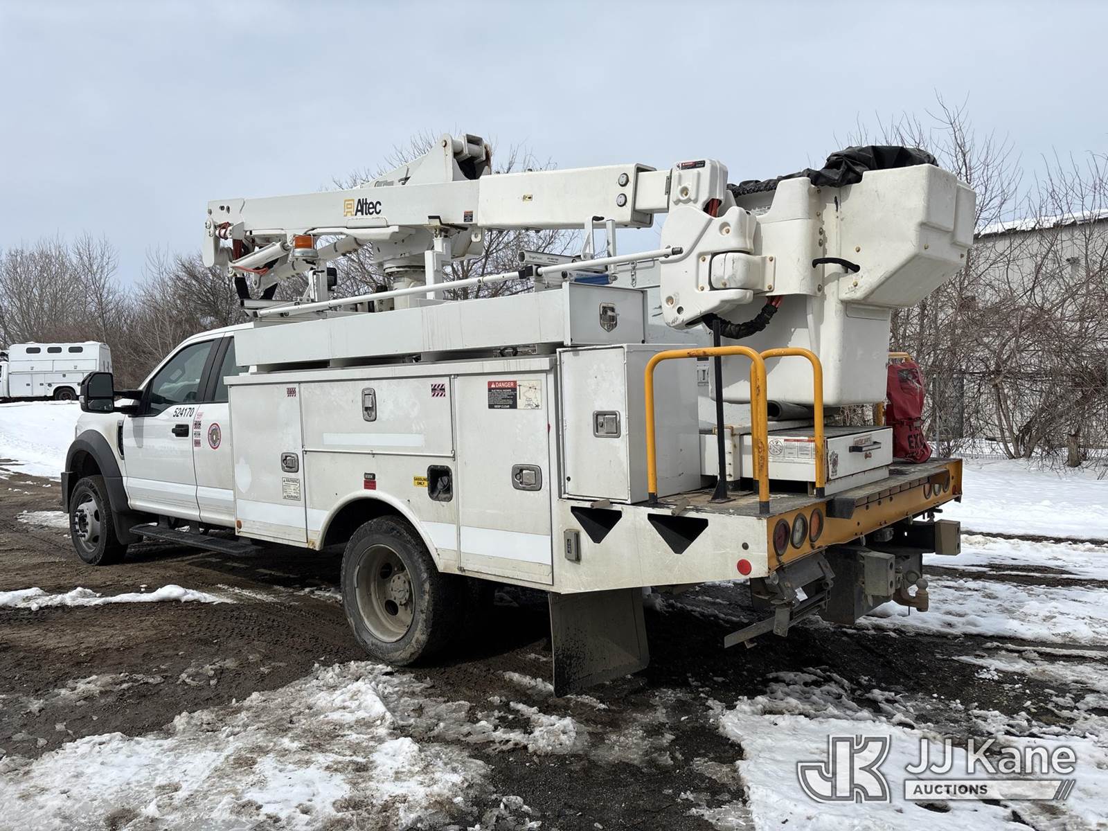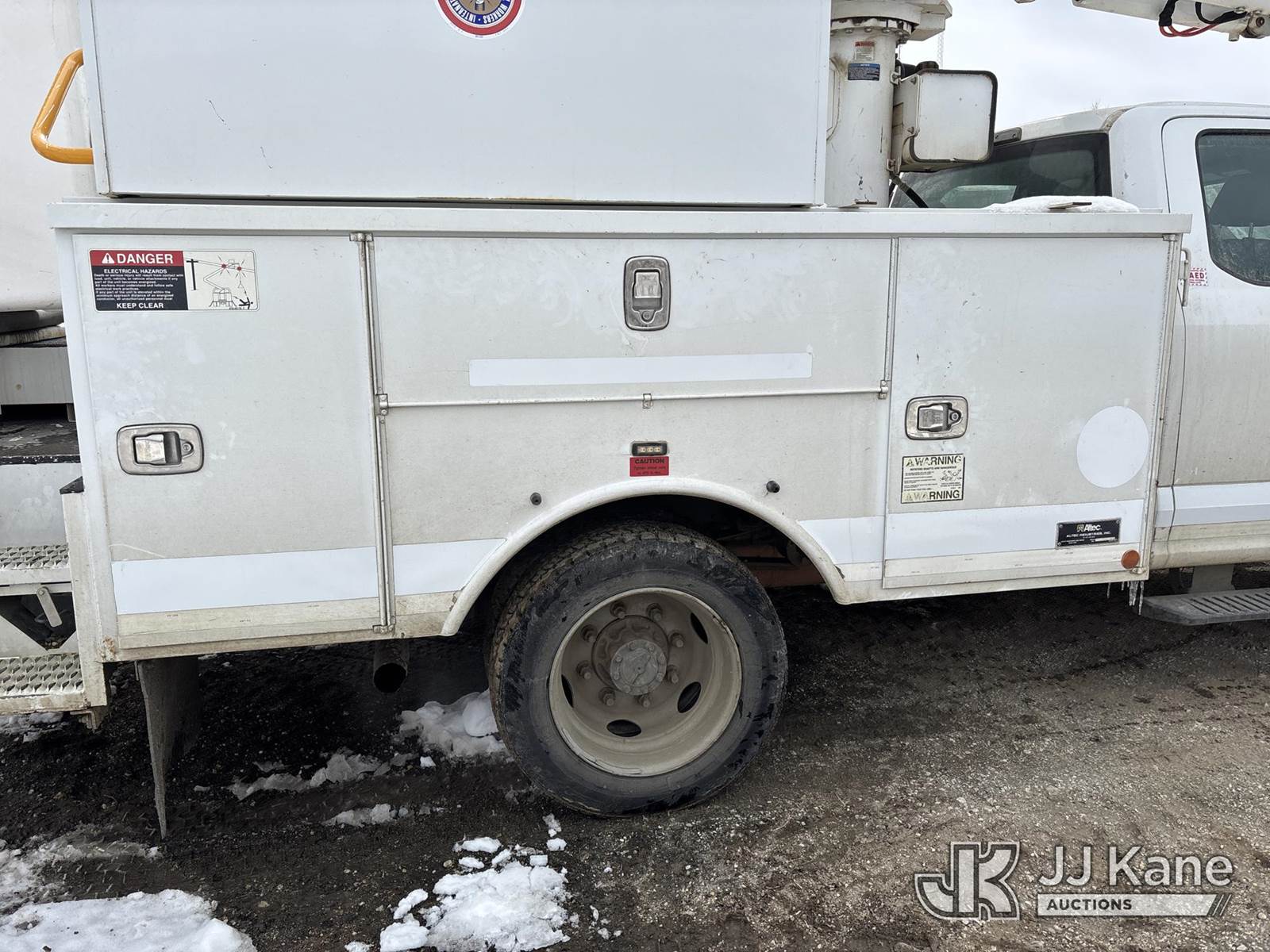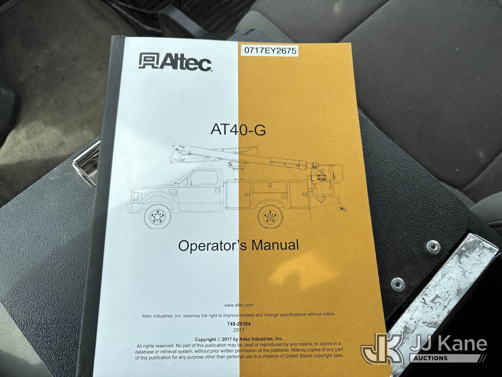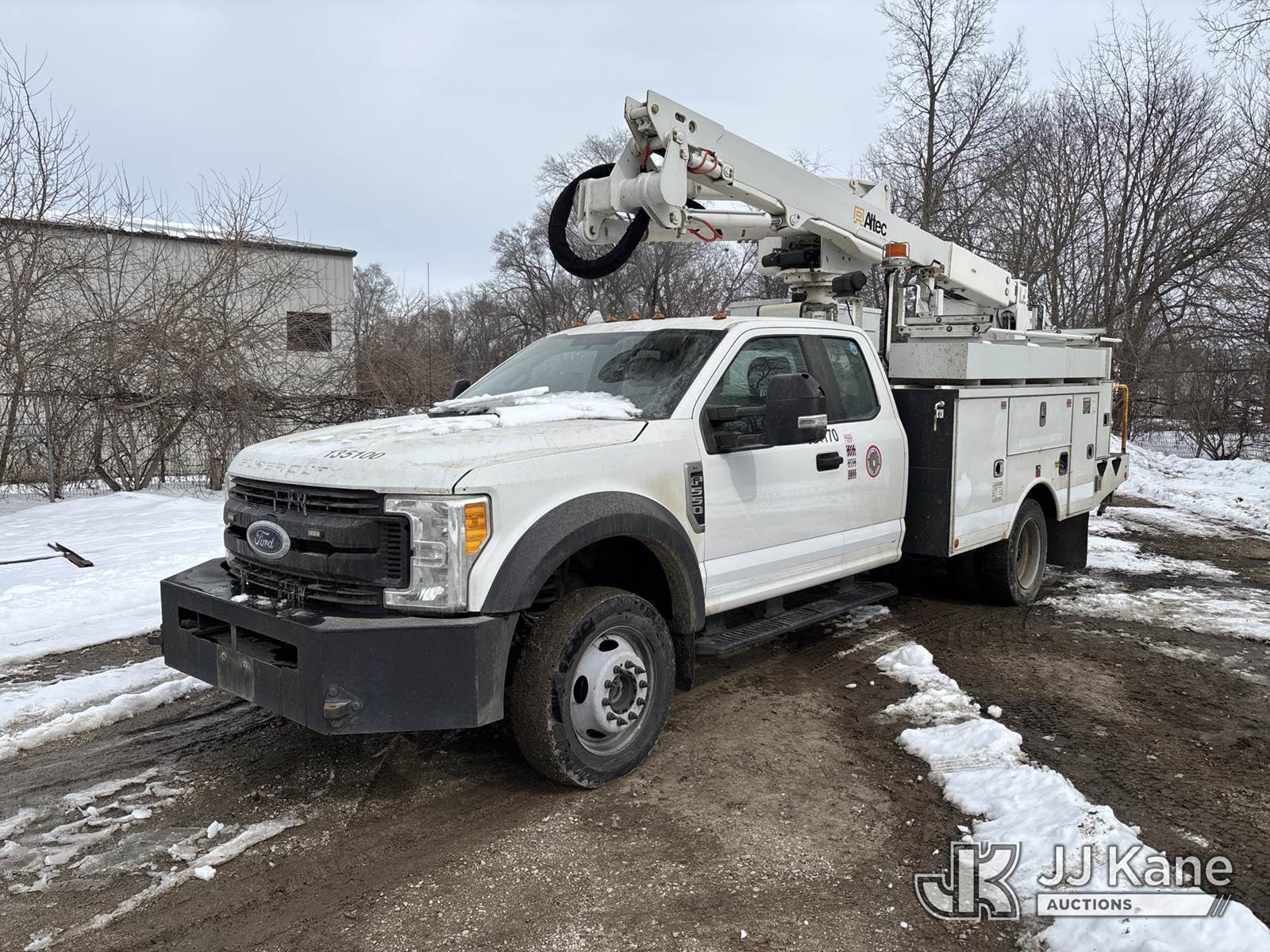 Altec AT40G, 45 ft, Articulating & Telescopic Bucket Truck s/n 0717EY2676, with single man bucket, mounted behind cab on 2017 Ford F-550 Extended-Cab Service Truck, 10-cyl gas, 4wd, Auto, A/C, (157,919 miles) (OPEN RECALL - REQUIRES INSPECTION BEFORE OPERATION) (Runs, Moves & Upper Condition Unknown)(PTO Will Not Engage, Jump To Start, Check Engine & Low Pressure Oil Lights On, Engine Knock) (The manufacturer has notified JJ Kane that this equipment is subject to an open recall. CSN 855 Fuel Line and Brake Line Inspection The equipment should not be operated until this is addressed. Buyer is responsible for reviewing the recall notice and contacting the manufacturer to schedule the recommended corrective actions. Associated costs may be covered by the manufacturer in some cases.) This is a Titled Item NOTE: This unit is being sold AS IS/WHERE IS via Timed Auction and is located in Des Moines, IA. Inspection & preview days for this unit are the 2 business days prior to the first day of items closing for this auction, item is located at 1600 NE 66th Ave Des Moines, IA 50313 and hours of operations are 8a-4p. For pre-sale questions, please contact Eric Stewart @ (515) 626-0492. (Manuals provided in cab) (Buyer is responsible for removal. Assistance by consignor or JJ Kane Auctions is not assured.)