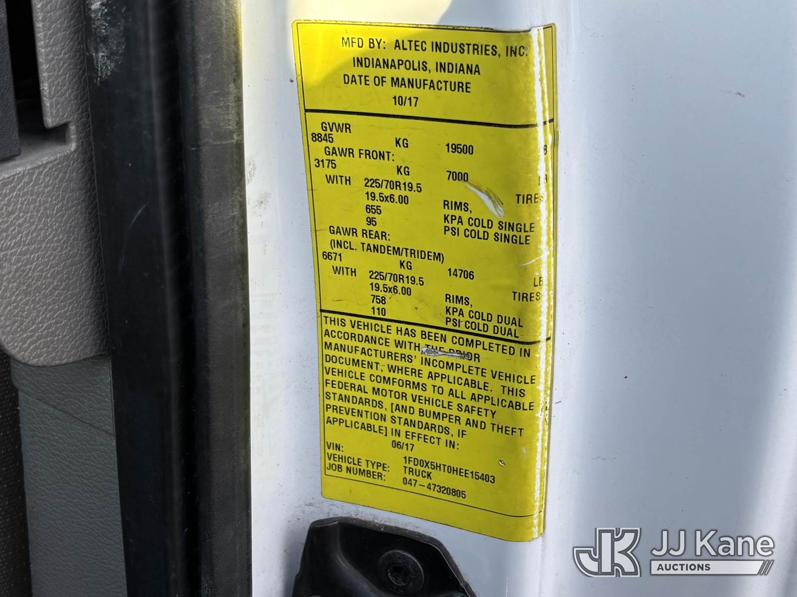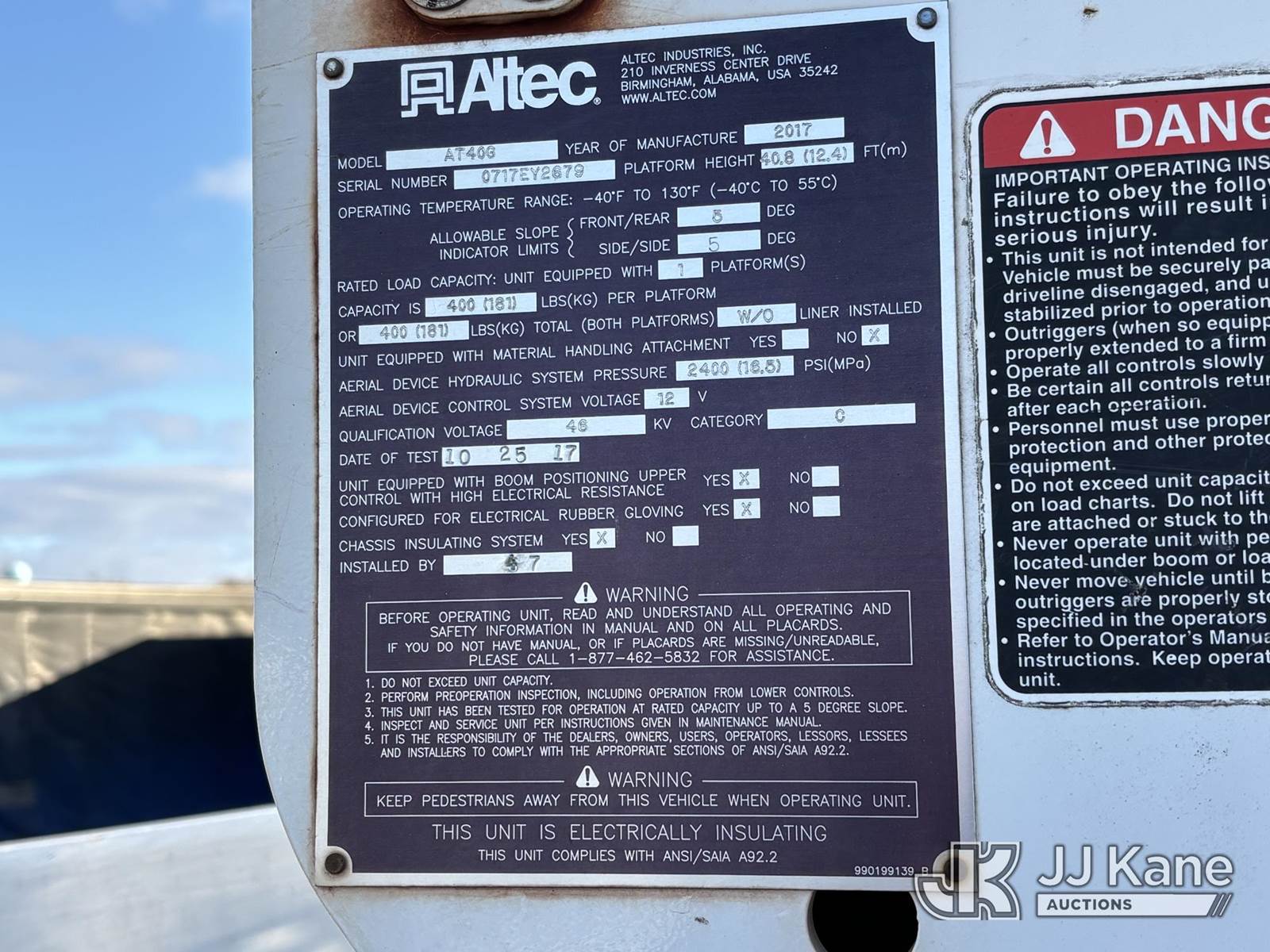 Altec AT40G, 45 ft, Articulating & Telescopic Bucket Truck s/n 0717EY2679, with Single-Man Bucket, mounted behind cab on 2017 Ford F550 4x4 Extended-Cab Service Truck, 6.7L diesel, Auto, A/C, (225,742 miles) (Runs, Moves & Upper Operates, Engine Light On, Dent in Hood & Right Rear Cab Door, Battery Light On ) This is a Titled Item NOTE: This unit is being sold AS IS/WHERE IS via Timed Auction and is located in Plymouth Meeting, PA. Inspection & preview days for this unit are the 2 business days prior to the first day of items closing for this auction, item is located at 1402 Conshohocken Rd Plymouth Meeting, PA 19462 and hours of operations are 8a-4p. For pre-sale questions, please contact Bruce Thomas @ (267) 887-0392 or bruce.thomas.jr@jjkane.com. (Manuals provided in cab) (Buyer is responsible for removal. Assistance by consignor or JJ Kane Auctions is not assured.)