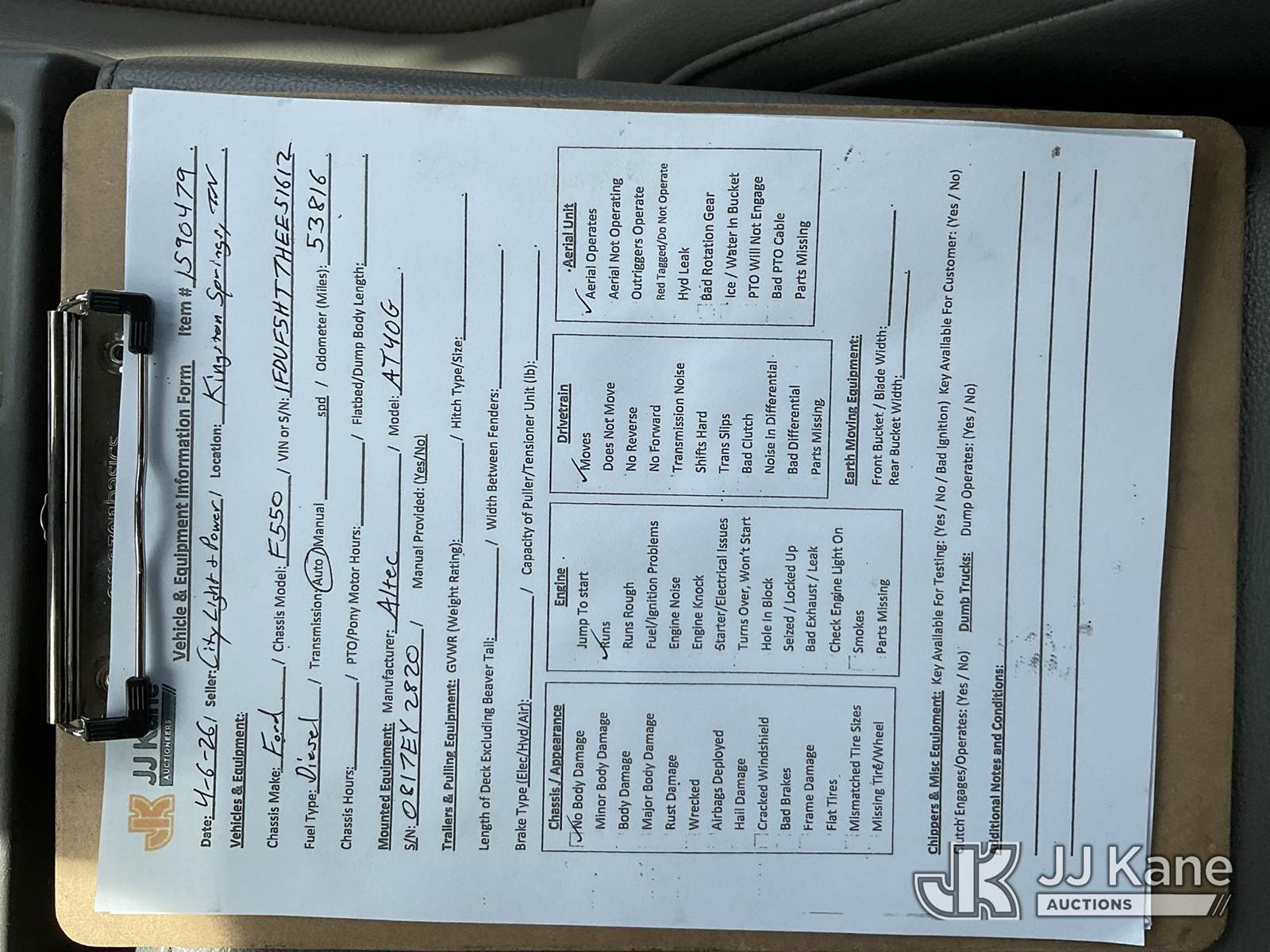 Altec AT40G, 46 ft, Articulating & Telescopic Bucket Truck s/n 0817EY2820, with single-man bucket, mounted behind cab on 2017 Ford F550 4x4 Service Truck, 6.7L V8 OHV 16V DIESEL, Auto, A/C, (53,816 miles) (Runs, Moves & Upper Operates) This is a Titled Item NOTE: This unit is being sold AS IS/WHERE IS via Timed Auction and is located in Kingston Springs, TN. Inspection & preview days for this unit are by appointment only; please contact us at contact@jjkane.com or 84-Go-JJKane for more details. (Missing manuals, See Auction Company for Manufacturers Information to obtain manuals) (Buyer is responsible for removal. Assistance by consignor or JJ Kane Auctions is not assured.)