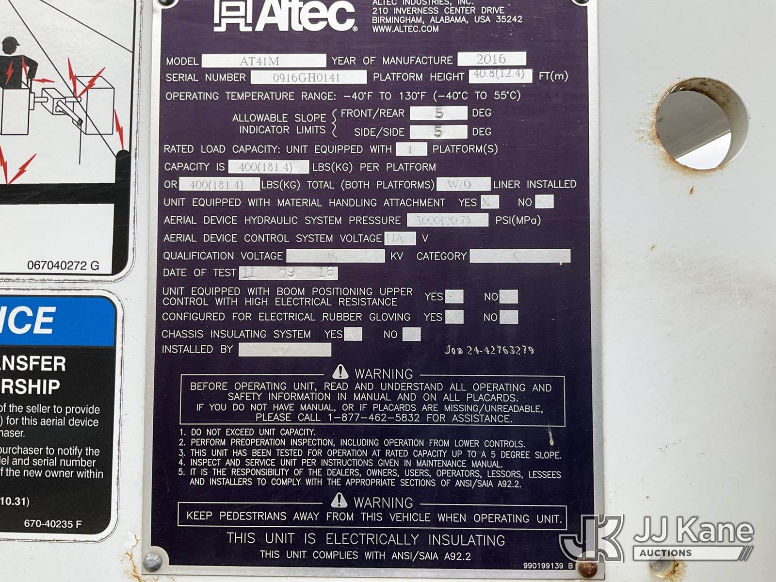 Altec AT41M, 45 ft, Articulating & Telescopic Bucket Truck s/n 0916GH0141, with single-man bucket & 2 hyd outriggers, mounted behind cab on 2017 International 4300 Utility Truck, Cummins 6.7L Auto, 4X2, diesel, A/C, (150,371 miles) (Runs, Moves & Upper Operates) (Rust Damage) (Reads 14,516 hours) This is a Titled Item NOTE: This unit is being sold AS IS/WHERE IS via Timed Auction and is located in Shrewsbury, MA. Inspection & preview days for this unit are the 2 business days prior to the first day of items closing for this auction, item is located at 11 Fortune Blvd Shrewsbury, MA 01545 and hours of operations are 8a-4p. For pre-sale questions, please contact Rob Gifford @ (508) 864-4126. (Manuals provided in cab) (Buyer is responsible for removal. Assistance by consignor or JJ Kane Auctioneers is not assured.)