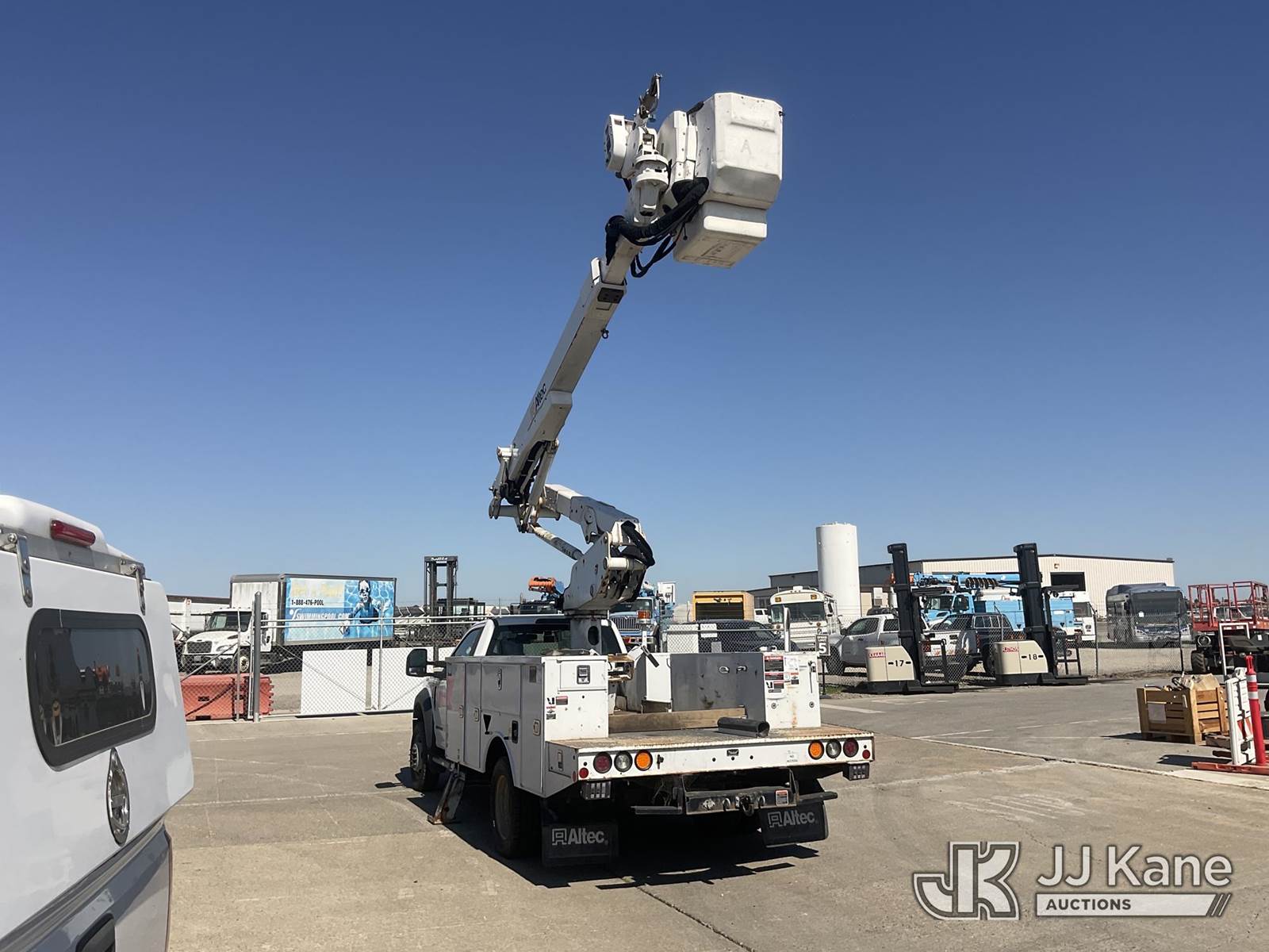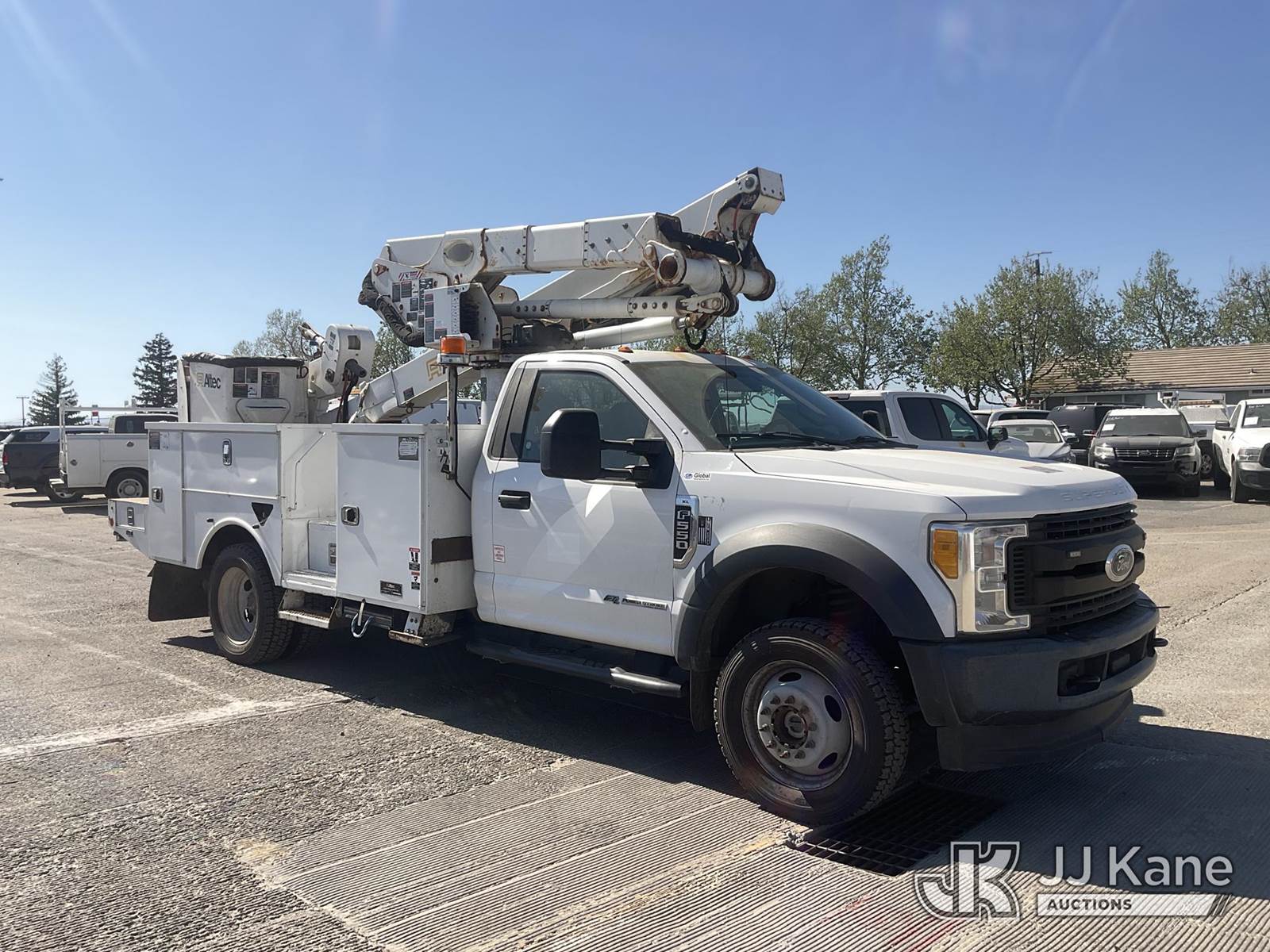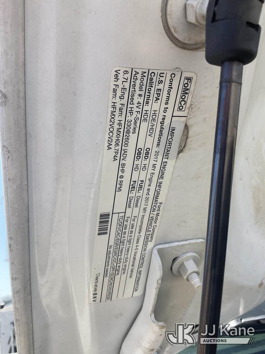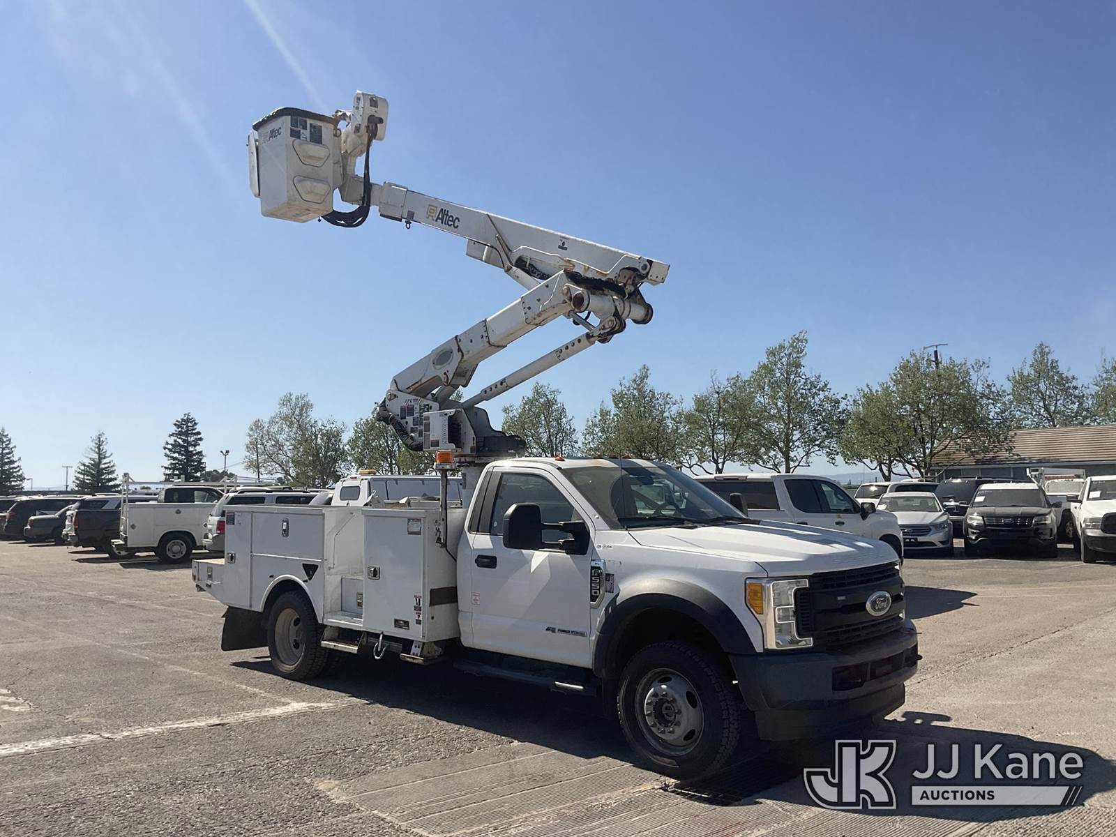 Altec AT41M, 45 ft, Articulating & Telescopic Material Handling Bucket Truck s/n 0418GX0646, with single-man bucket, mounted behind cab on 2017 Ford F-550 Regular Cab DRW 4WD Service Truck, s/n 1FDUF5HT5HDA09837, 6.7L V8 OHV 16V DIESEL, Auto, A/C, with Tow Package, (89,456 miles) (Runs, Moves & Upper Operates, Passenger Side Outrigger Does Not Operate, Rust Damage On Upper Unit) May be subject to ARB Regulations This is a Titled Item NOTE: This unit is being sold AS IS/WHERE IS via Timed Auction and is located in Dixon, CA. Inspection & preview days for this unit are the 2 business days prior to the first day of items closing for this auction, item is located at 8668 Sparling Ln Dixon, CA 95620 and hours of operations are 8a-4p. For pre-sale questions, please contact JJ Kane Staff at (707) 678-8060 (dixon@jjkane.com). Dealer License Number 45696. (Manuals provided in cab) (Buyer is responsible for removal. Assistance by consignor or JJ Kane Auctions is not assured.)