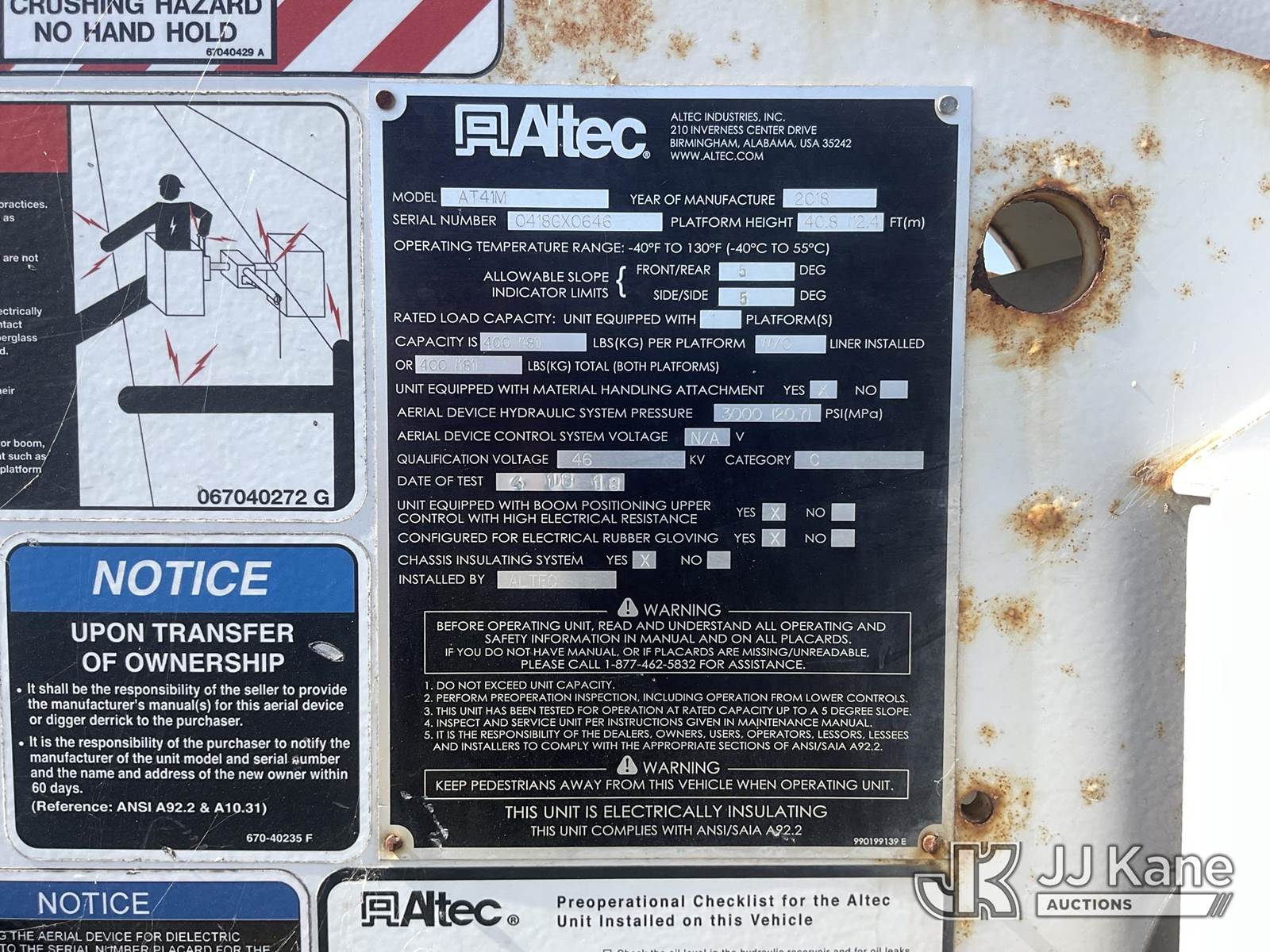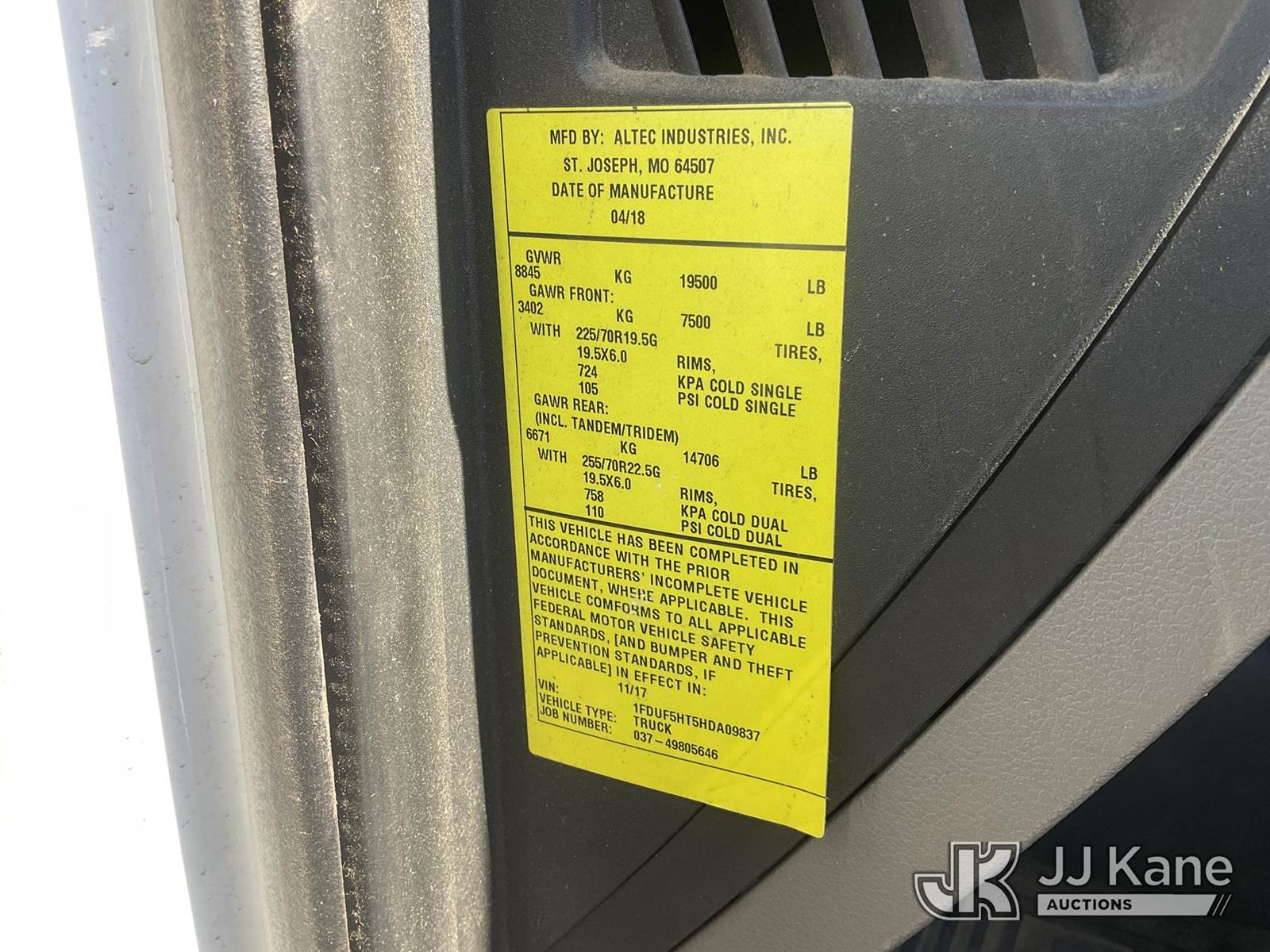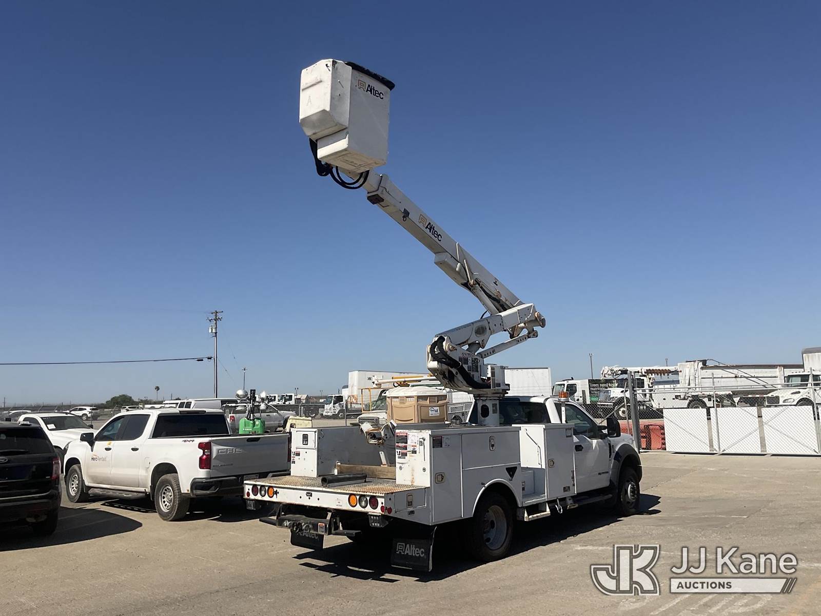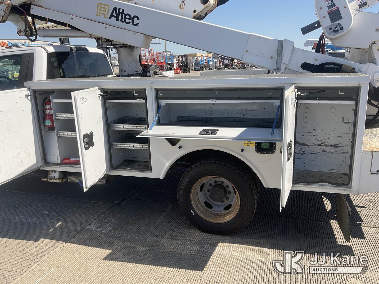 Altec AT41M, 45 ft, Articulating & Telescopic Material Handling Bucket Truck s/n 0418GX0646, with single-man bucket, mounted behind cab on 2017 Ford F-550 Regular Cab DRW 4WD Service Truck, s/n 1FDUF5HT5HDA09837, 6.7L V8 OHV 16V DIESEL, Auto, A/C, with Tow Package, (89,456 miles) (Runs, Moves & Upper Operates, Passenger Side Outrigger Does Not Operate, Rust Damage On Upper Unit) May be subject to ARB Regulations This is a Titled Item NOTE: This unit is being sold AS IS/WHERE IS via Timed Auction and is located in Dixon, CA. Inspection & preview days for this unit are the 2 business days prior to the first day of items closing for this auction, item is located at 8668 Sparling Ln Dixon, CA 95620 and hours of operations are 8a-4p. For pre-sale questions, please contact JJ Kane Staff at (707) 678-8060 (dixon@jjkane.com). Dealer License Number 45696. (Manuals provided in cab) (Buyer is responsible for removal. Assistance by consignor or JJ Kane Auctions is not assured.)