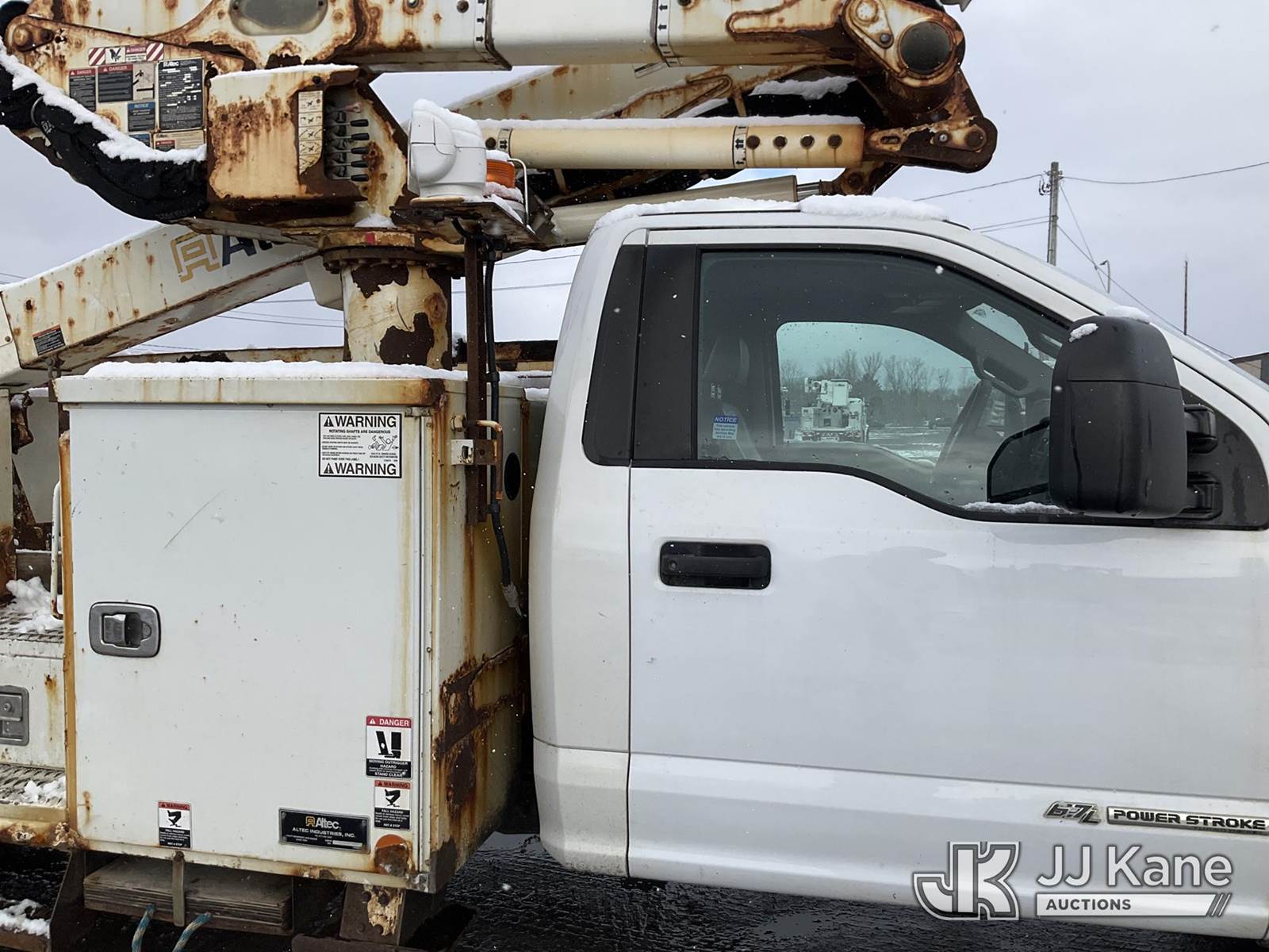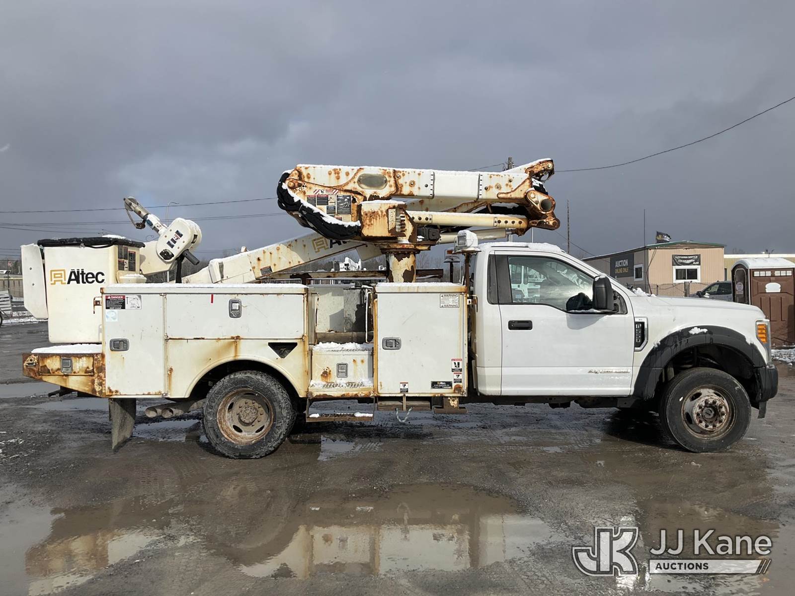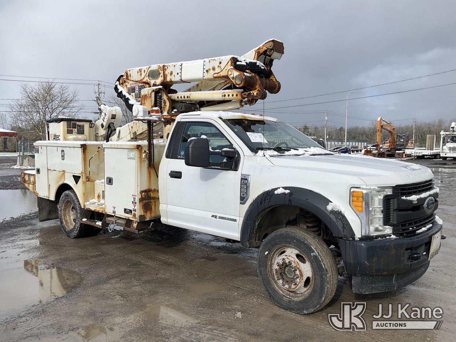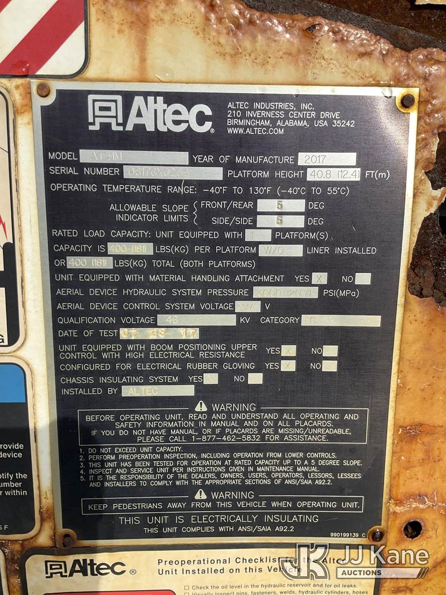 Altec AT41M, 46 ft, Articulating & Telescopic Material Handling Bucket Truck s/n 0617GX0204, with Single-Man Bucket, mounted behind cab on 2017 Ford F550 4x4 Service Truck, 6.7L diesel, Auto, A/C, (190,717 miles) (Runs, Moves & Upper Condition Unknown, PTO Not Engaging, Check Engine, Traction & Battery Light On) This is a Titled Item NOTE: This unit is being sold AS IS/WHERE IS via Timed Auction and is located in Rome, NY. Inspection & preview days for this unit are the 2 business days prior to the first day of items closing for this auction, item is located at 5835 Success Dr Rome, NY 13440 and hours of operations are 8a-4p. For pre-sale questions, please contact Ryan Jackson @ (315) 749-3790 or Ryan.Jackson@jjkane.com. (Missing manuals, See Auction Company for Manufacturers Information to obtain manuals) (Buyer is responsible for removal. Assistance by consignor or JJ Kane Auctions is not assured.)