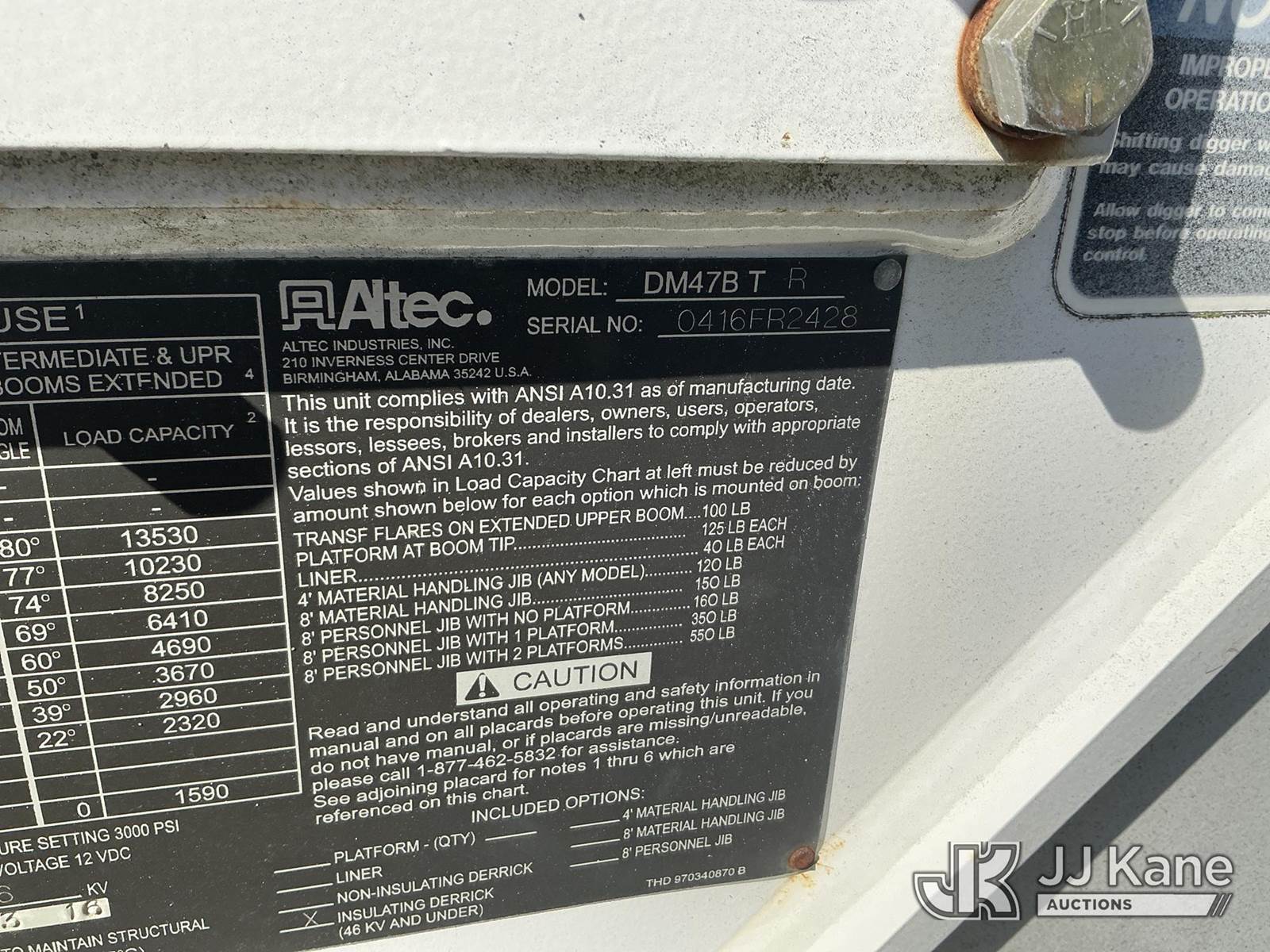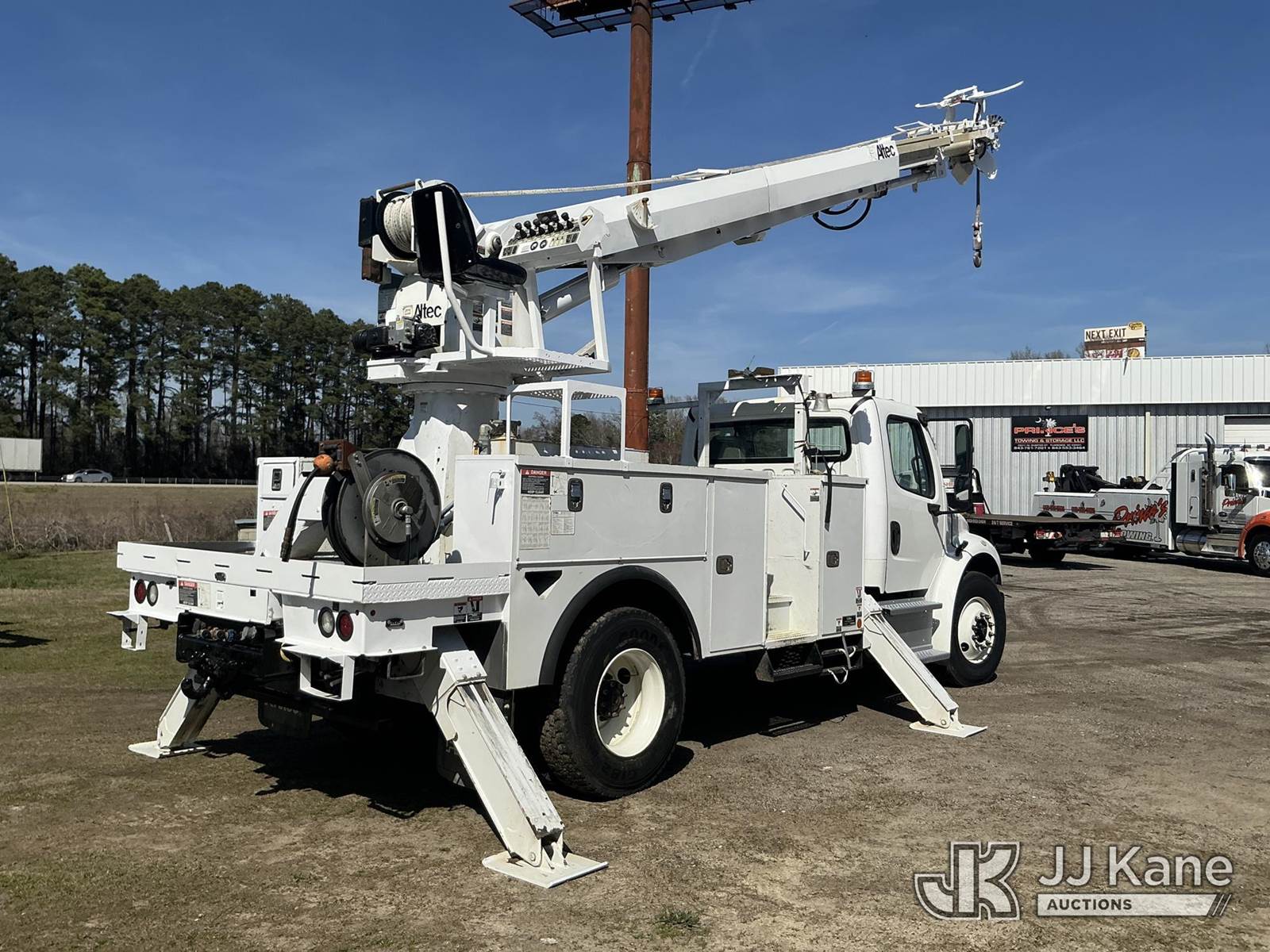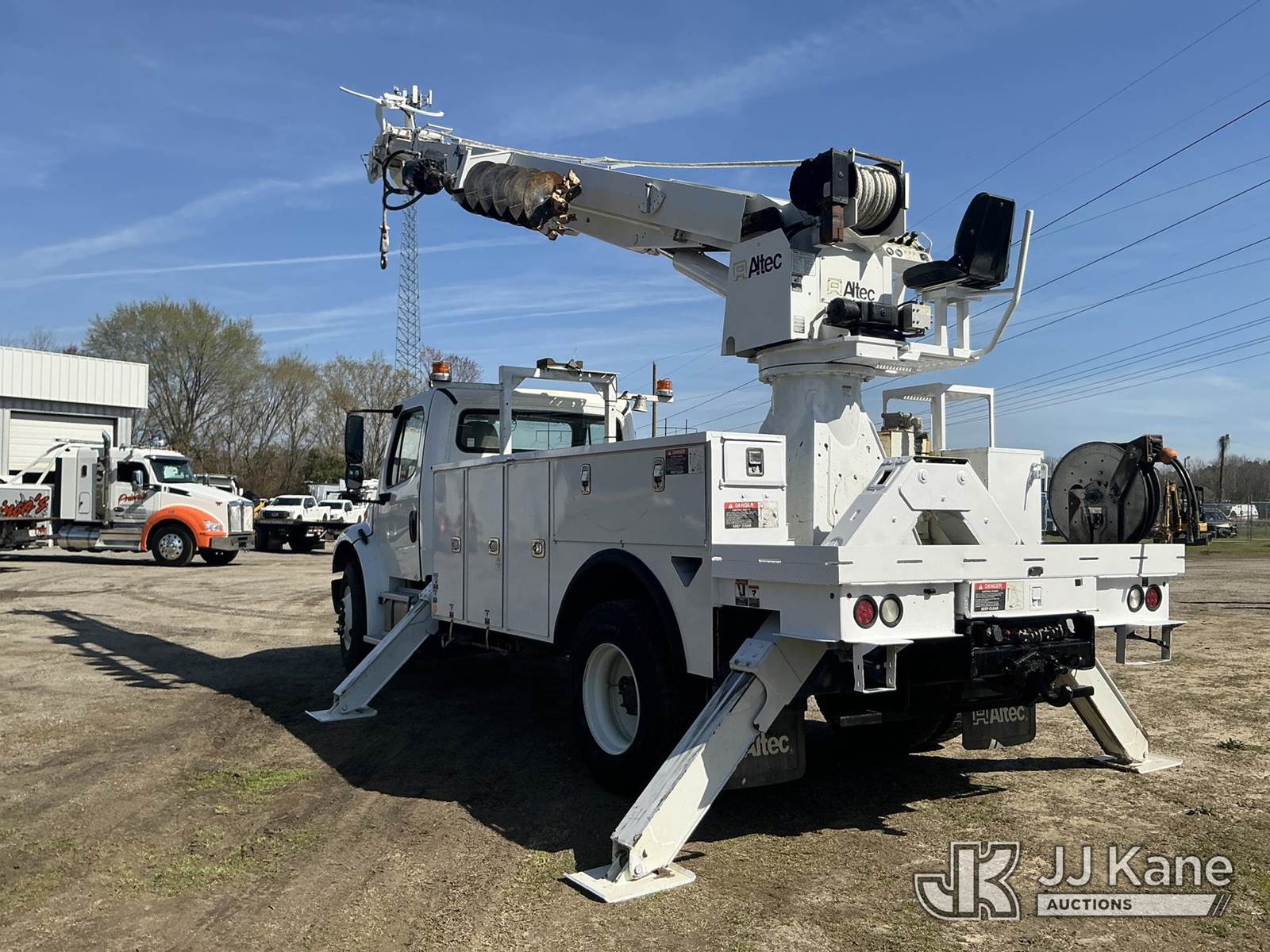 Altec DM47B-TR, 23,790 Lb Digger Derrick s/n 0416FR2428, with 47ft sheave height, three stage hydraulic boom, upper controls, pole grabs, heel winch, riding console, two speed digger, and four hydraulic outriggers, rear mounted on 2017 Freightliner M2 106 Utility Truck, Cummins ISB 6.7L diesel, Auto, A/C, (58,517 miles) (Runs, Moves, Upper Operates ) This is a Titled Item NOTE: This unit is being sold AS IS/WHERE IS via Timed Auction and is located in Florence, SC. Inspection & preview days for this unit are by appointment only; please contact us at contact@jjkane.com or 84-Go-JJKane for more details. (Missing manuals, See Auction Company for Manufacturers Information to obtain manuals) (Buyer is responsible for removal. Assistance by consignor or JJ Kane Auctions is not assured.)