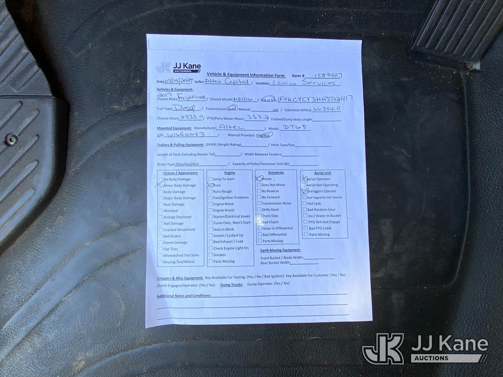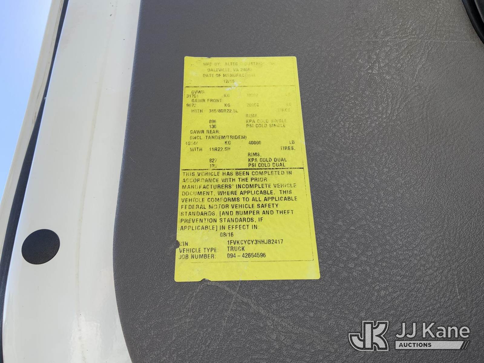 Altec DT65, 30,000 Lb Digger Derrick s/n 1016GK0113, with 65 ft. sheave height, 3 section hyd boom, 2 spd digger, heel winch, pole guides, riding console & 4 hyd outriggers, rear mounted on 2017 Freightliner M2-106 6X6 Utility Truck, Cummins 8.9L L6 Diesel, Auto, with front winch, (66,354 miles) (Runs, Moves & Upper Operates) This is a Titled Item NOTE: This unit is being sold AS IS/WHERE IS via Timed Auction and is located in Graysville, AL. Inspection & preview days for this unit are by appointment only; please contact us at contact@jjkane.com or 84-Go-JJKane for more details. Alabama Auctioneer Michael Whitebread - License # 5592 (Missing manuals, See Auction Company for Manufacturers Information to obtain manuals) (Buyer is responsible for removal. Assistance by consignor or JJ Kane Auctions is not assured.)