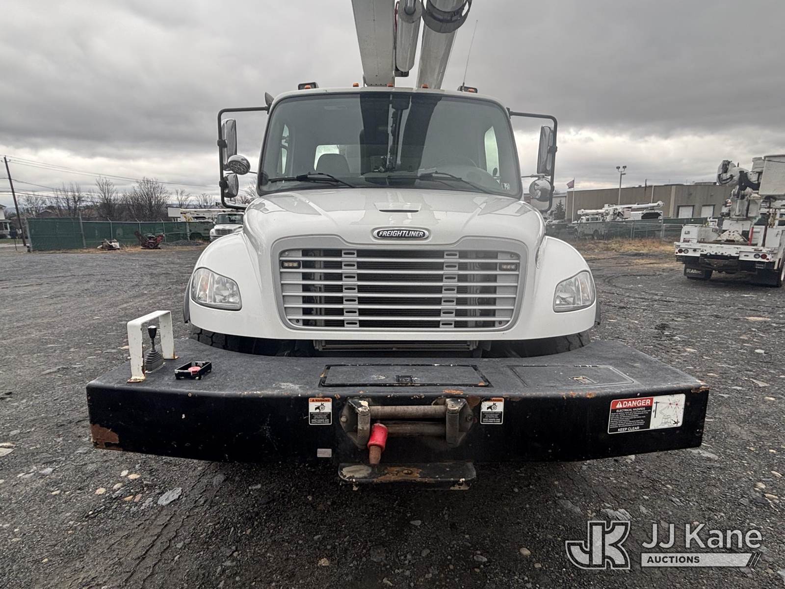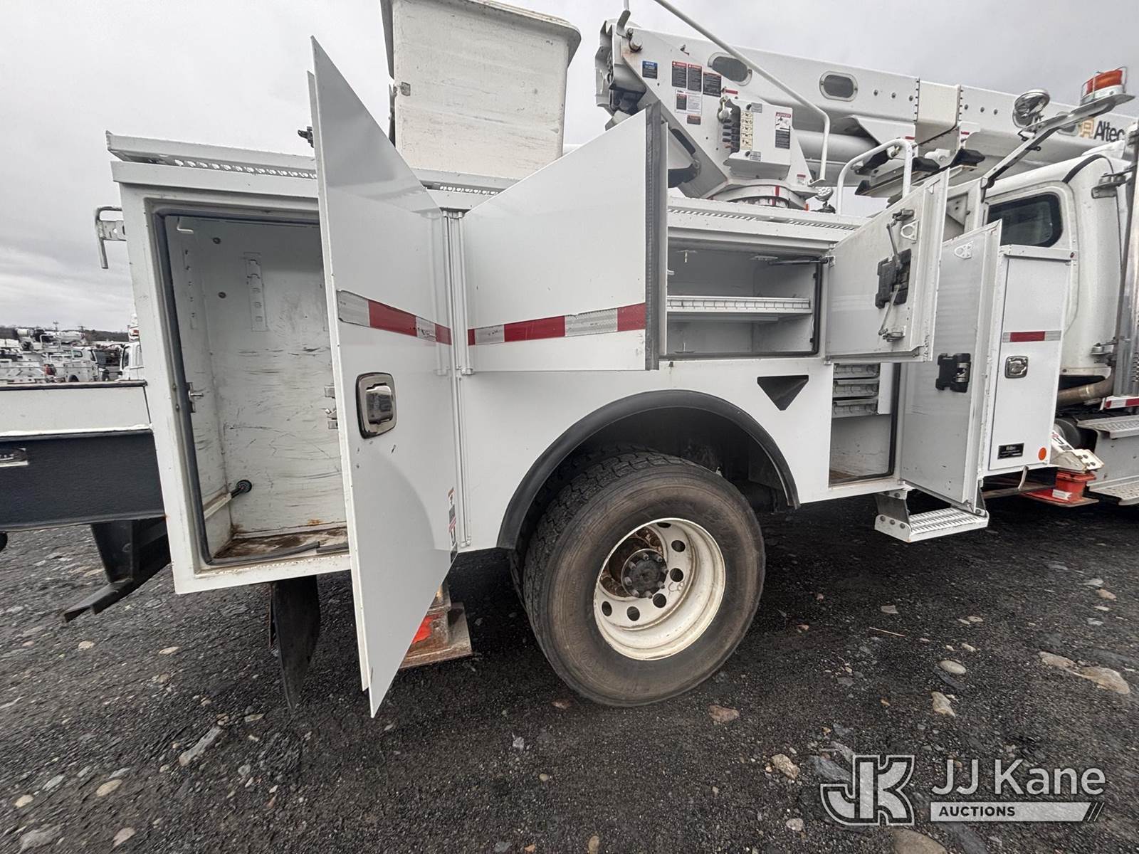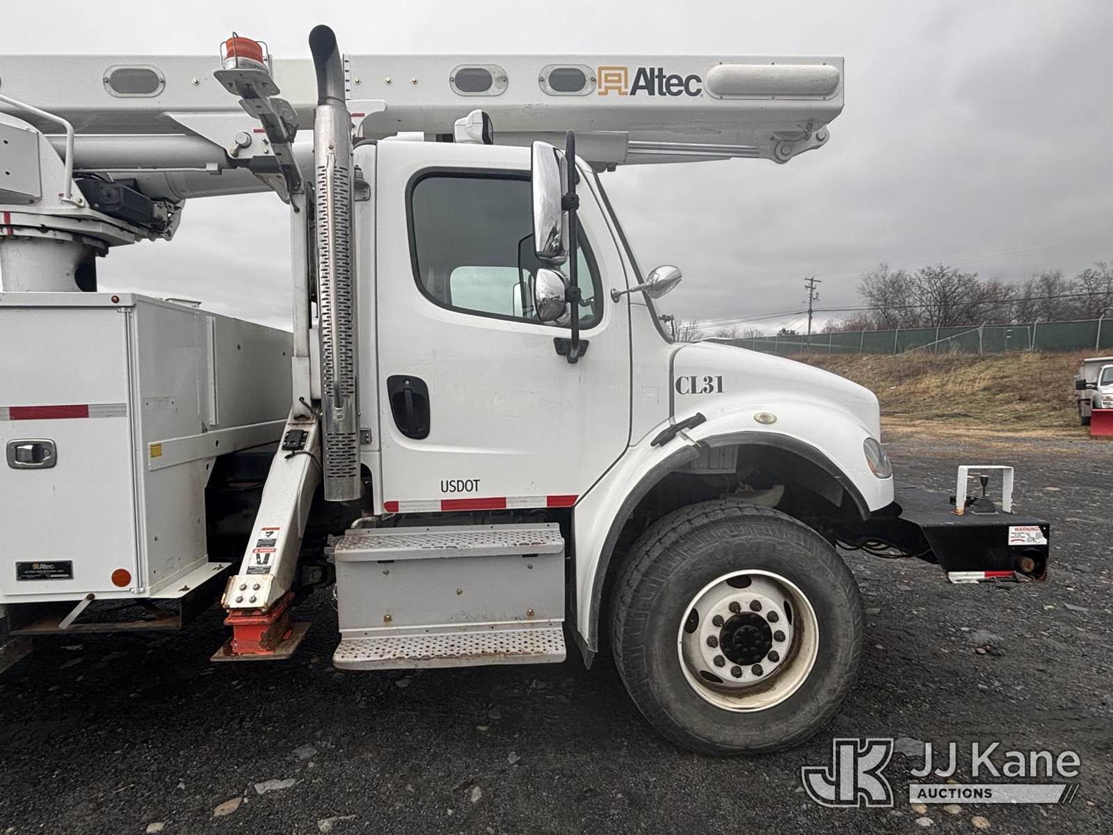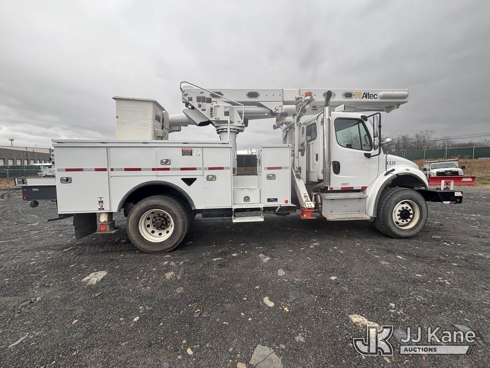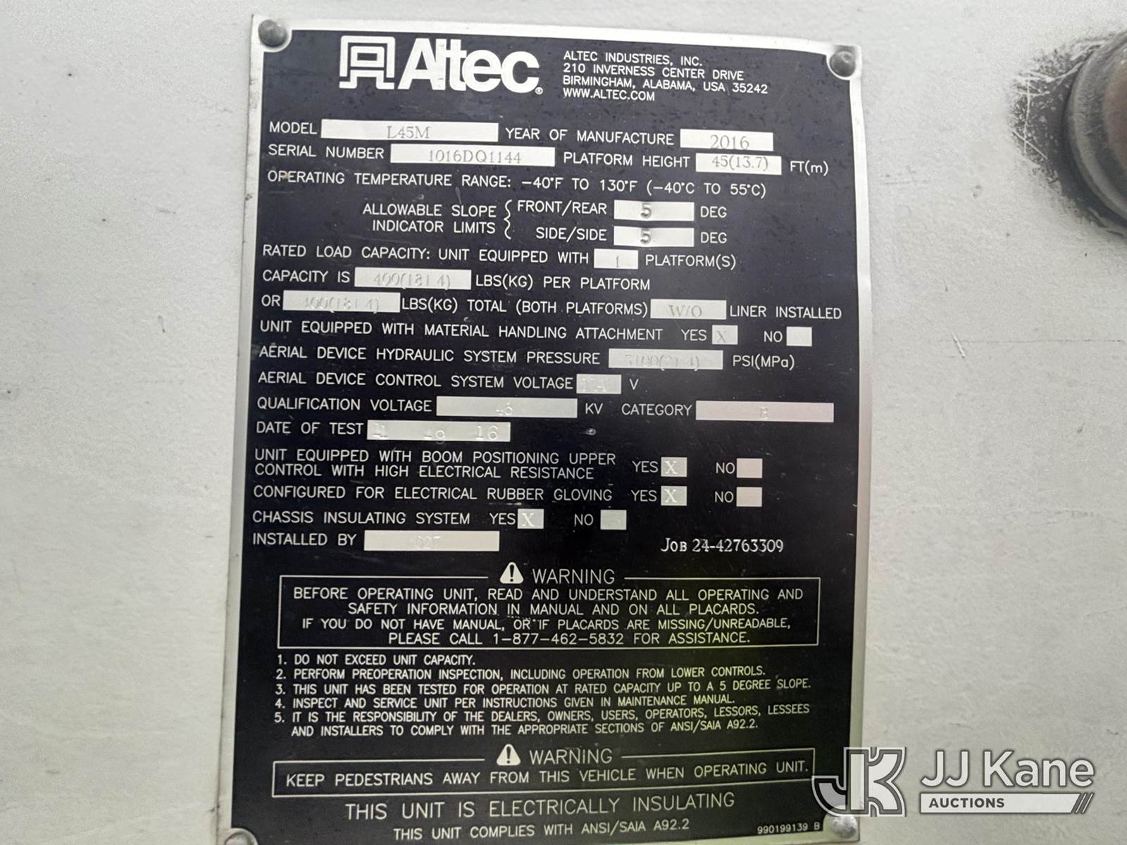 Altec L45M, 50 ft, Over-Center Material Handling Bucket Truck s/n 1016DQ1144, with single man bucket & 4 hyd outriggers, center mounted on 2017 Freightliner M2 106 4x4 Utility Truck, 6.7L L6 Diesel, Auto, A/C, with Front End Winch With Cable Winch & Inverter, (75,341 miles) (Runs & Moves, Does Not Operate, PTO Does Not Engage, Condition Unknown, Scratches, Dings, & Dents, Bad Main Boom Bearings, Booms Tip Covers Damaged, Rust Across Body) (Reads 6,037 hours) This is a Titled Item NOTE: This unit is being sold AS IS/WHERE IS via Timed Auction and is located in Plains, PA. Inspection & preview days for this unit are the 2 business days prior to the first day of items closing for this auction, item is located at 250 Laird St Plains, PA 18705 and hours of operations are 8a-4p.For pre-sale questions, please contact Mary Darlington @ (570) 899-4930 or Mary.Darlington@JJKane.com. (Missing manuals, See Auction Company for Manufacturers Information to obtain manuals) (Buyer is responsible for removal. Assistance by consignor or JJ Kane Auctions is not assured.)
