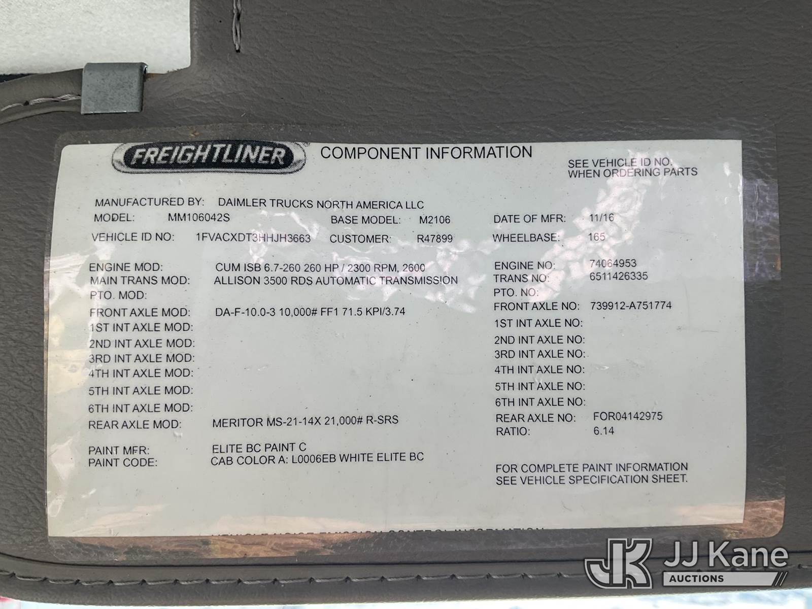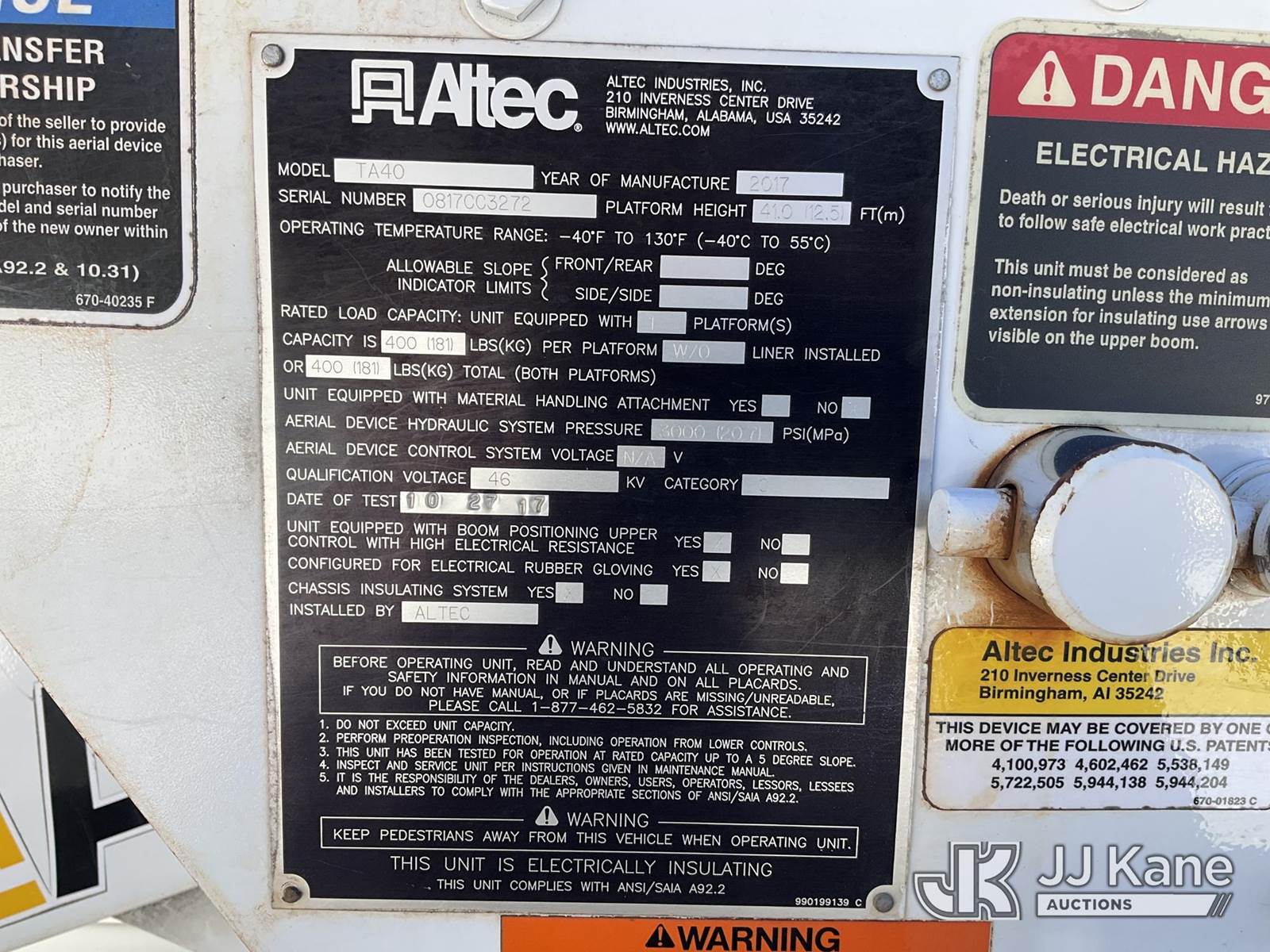 Altec TA40, 46 ft, Articulating & Telescopic Bucket Truck s/n 0817CC3272, with single-man bucket, mounted behind cab on 2017 Freightliner M2-106 Utility Truck, Cummins 6.7L diesel, Auto, A/C, True Mileage Unknown (Runs, Moves & Upper Operates) (No Power To Dash) This is a Titled Item NOTE: This unit is being sold AS IS/WHERE IS via Timed Auction and is located in Shrewsbury, MA. Inspection & preview days for this unit are the 2 business days prior to the first day of items closing for this auction, item is located at 11 Fortune Blvd Shrewsbury, MA 01545 and hours of operations are 8a-4p. For pre-sale questions, please contact Rob Gifford @ (508) 864-4126. (Manuals provided in cab) Sales Tax Collected Based on Residency (Buyer is responsible for removal. Assistance by consignor or JJ Kane Auctions is not assured.)