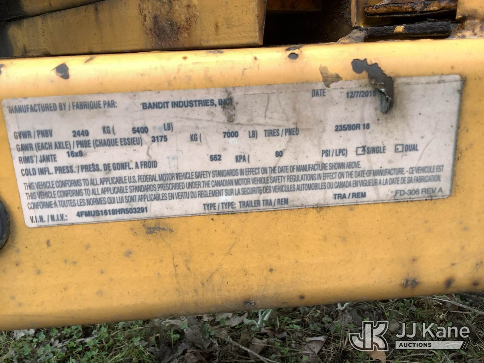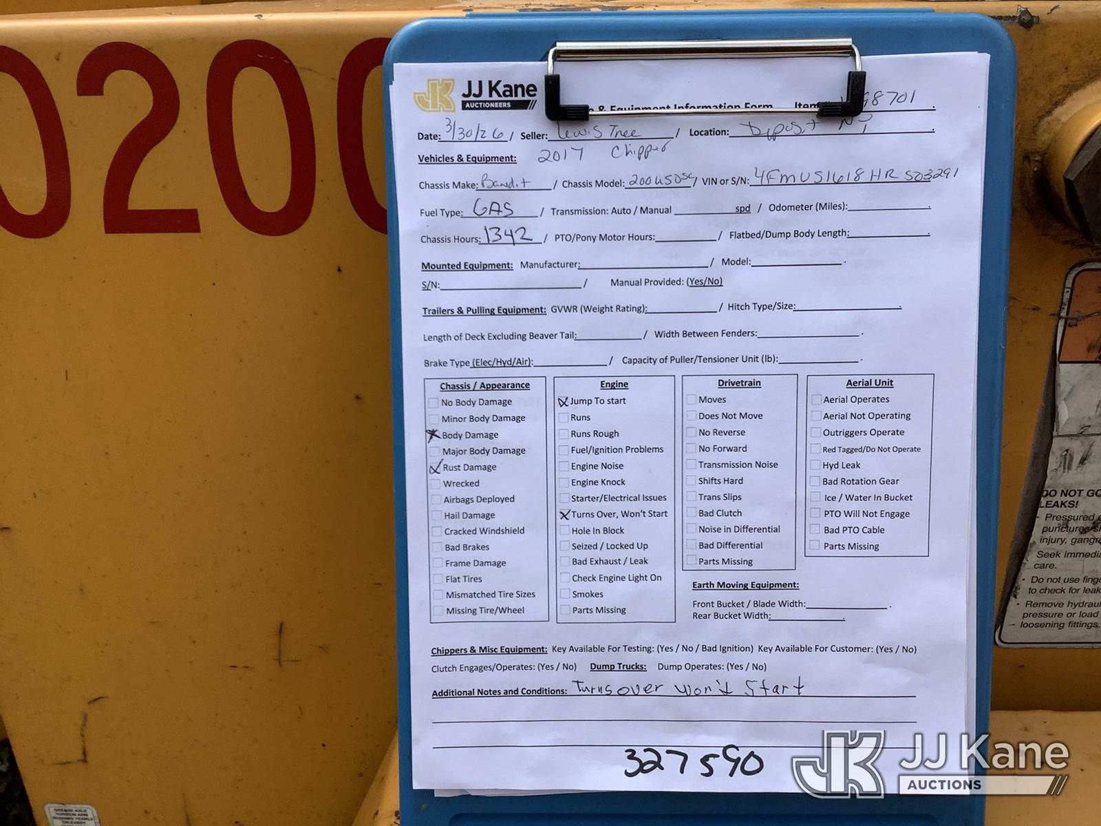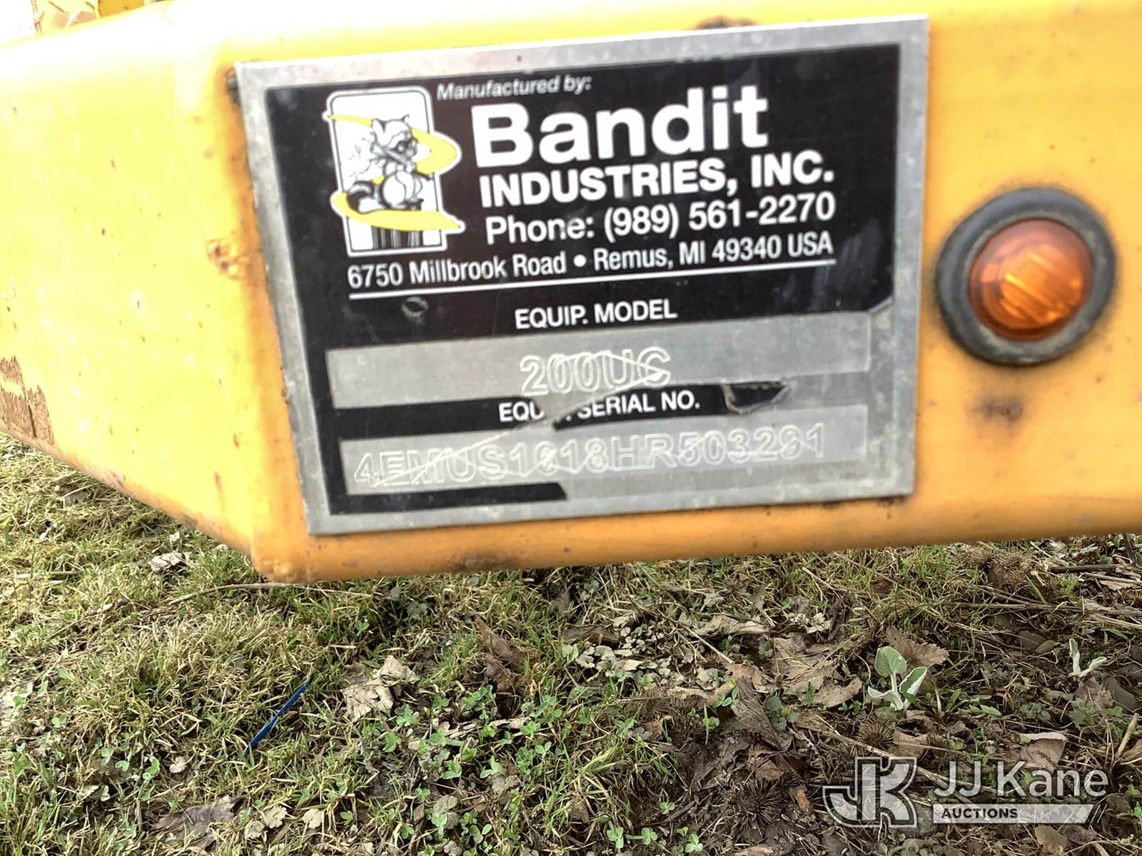 2017 Bandit Industries 200XP Portable Chipper (12in Disc), s/n 4FMUS1618HR503291, 4-cyl gas, Trailer Mounted (No Title) ( Not Running, Condition Unknown) (Reads 1,342 hours) NOTE: This unit is being sold AS IS/WHERE IS via Timed Auction and is located in Deposit, NY. Inspection & preview days for this unit are by appointment only; please contact us at contact@jjkane.com or 84-Go-JJKane for more details. (Buyer is responsible for removal. Assistance by consignor or JJ Kane Auctions is not assured.)