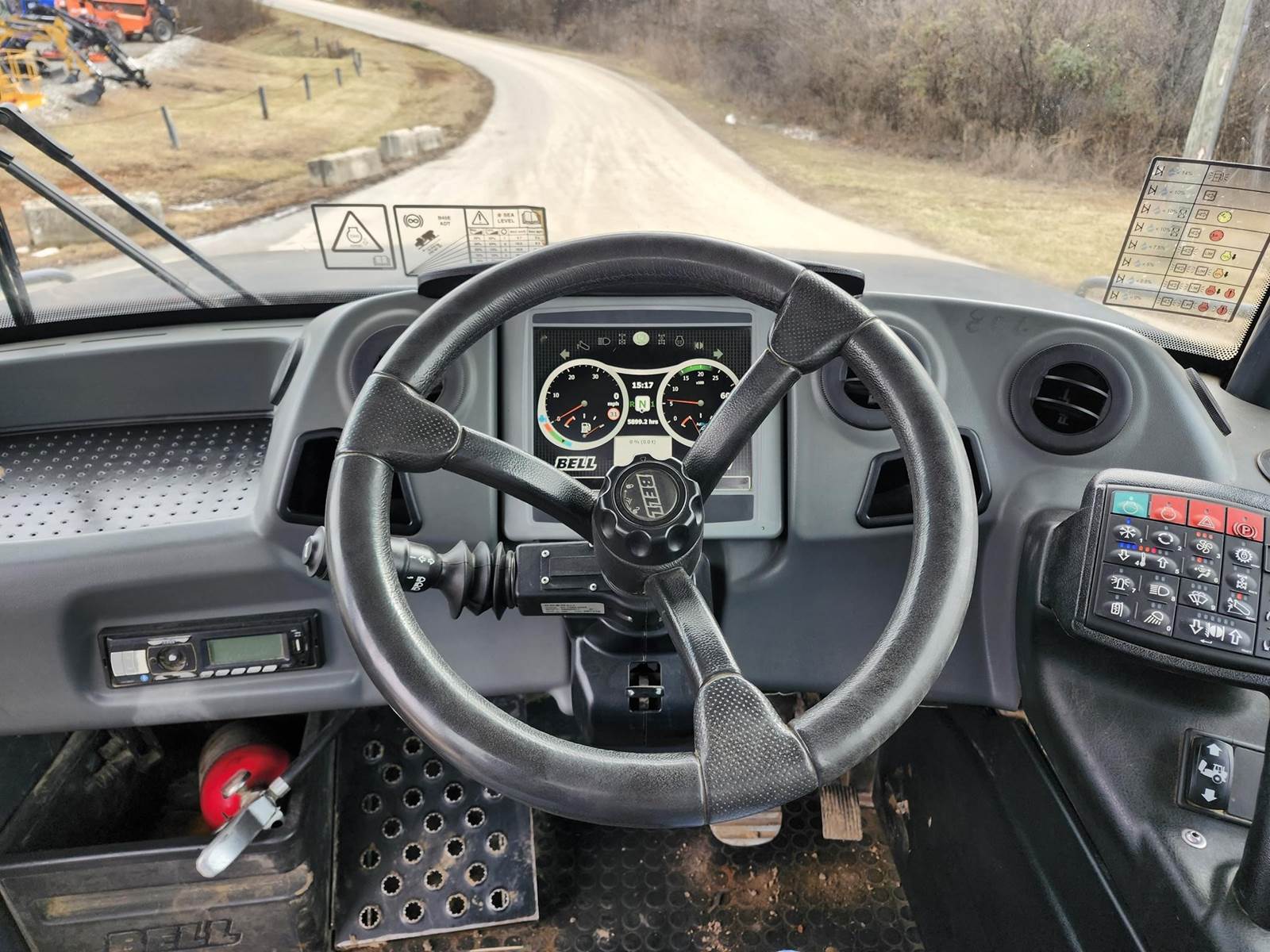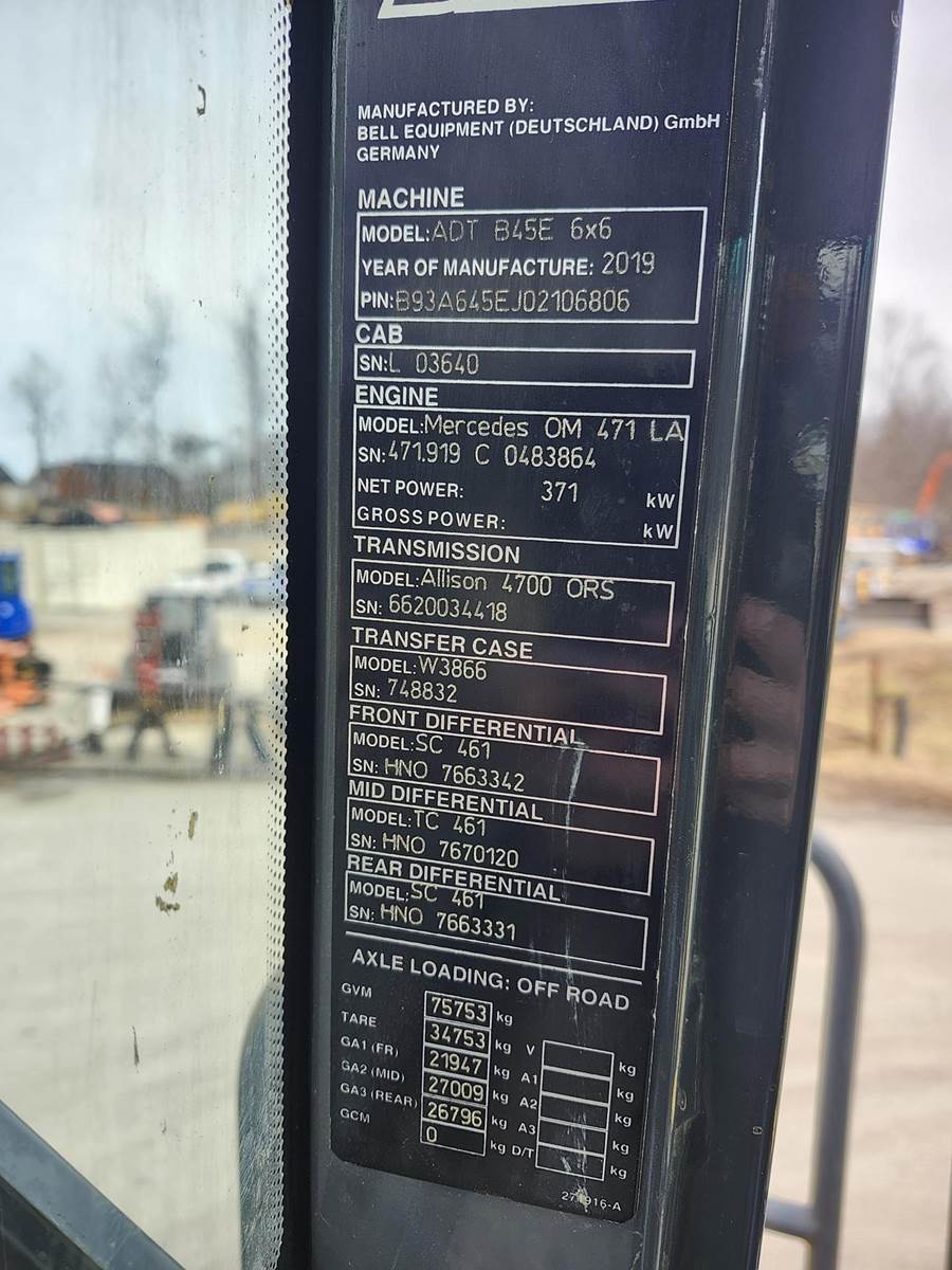 Bell E Series articulated truck line-up is extended with the introduction of the B45E, which offers a rated payload of 41 tons. Powered by the latest six-cylinder Mercedes-Benz off-highway diesel engines and driving through Allison transmissions, the large E Series ADT range all benefit from increased payloads and Bell promises a 6-7% lower cost per ton for all E Series models when compared with previous D series trucks. To accommodate the larger 7-speed transmission, Bell removed the automatic retarder on the transmission and opted to incorporate this feature into the wet brake system. The trucks have also adopted a Jacobs engine brake. The Bell B45E is the ideal choice for heavy hauls and ambitious production schedules. This truck offers a nominal payload of 90,390 lbs (41,000 kg) and is equipped with a 523 hp at 1700 rev/min engine. Air Conditioner, Retarder, Rear View Camera, Air Ride Seat, 2016 US EPA Label, Requires Diesel Exhaust Fluid, Tailgate, Auto Lube, 29.5R25 Tires.