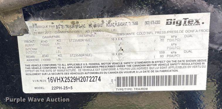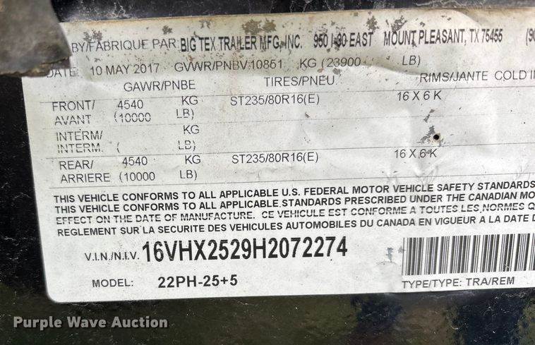 2017 Big Tex 22PH-25+5 equipment trailer