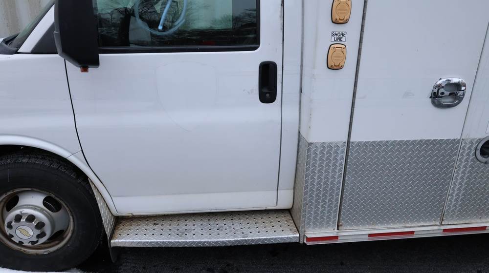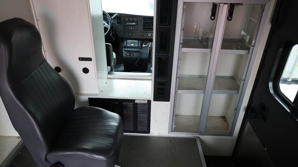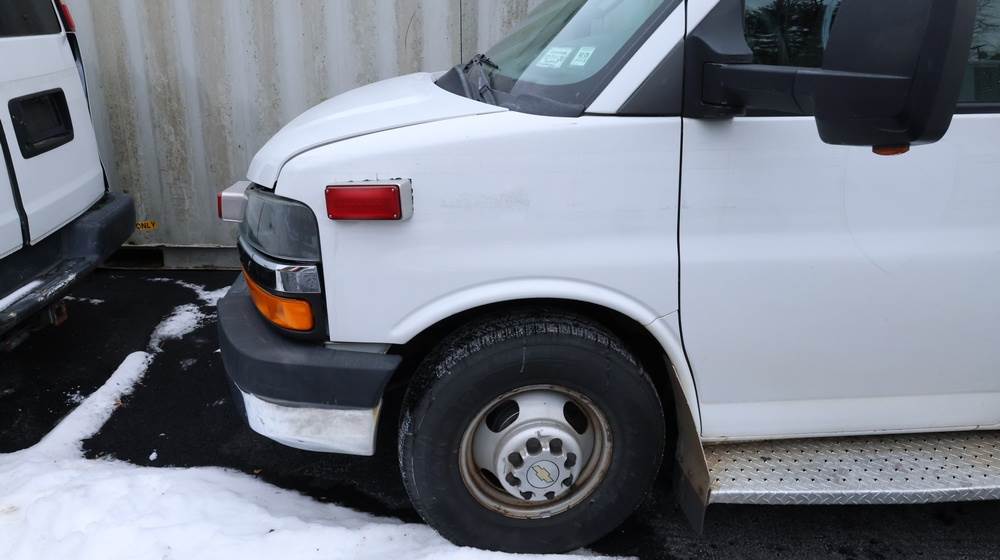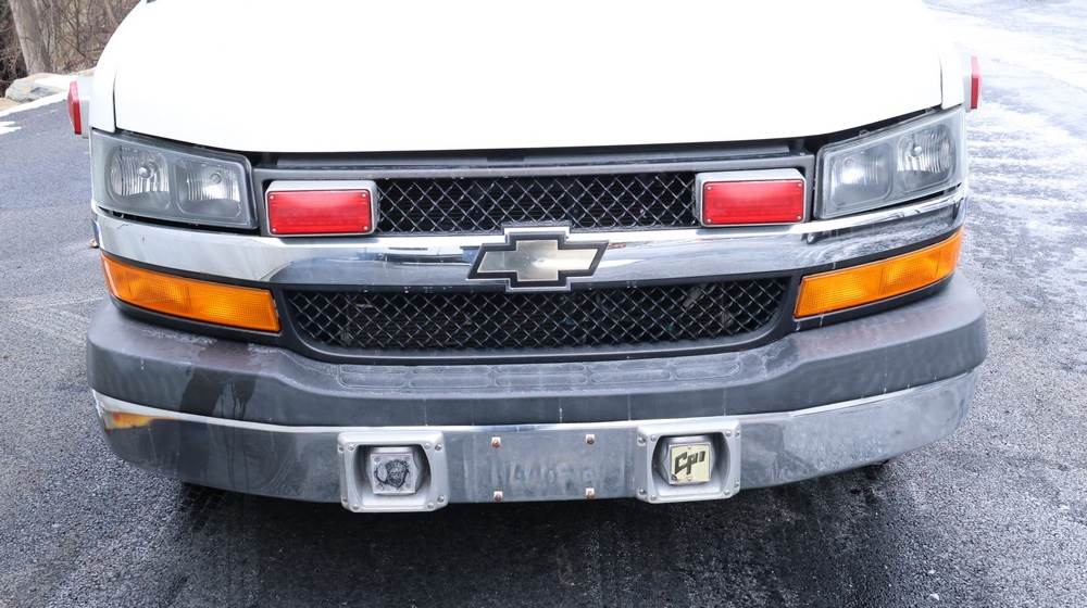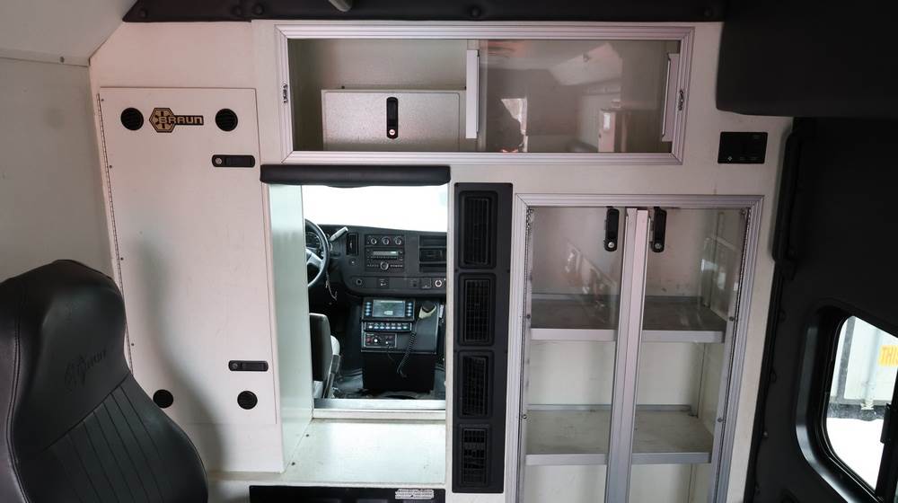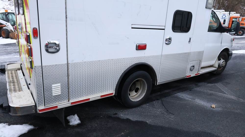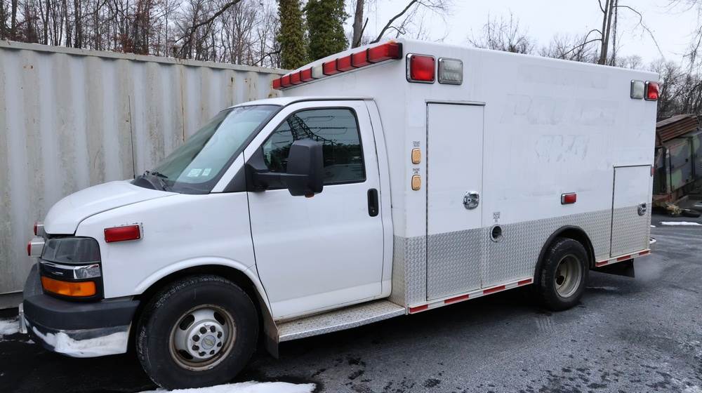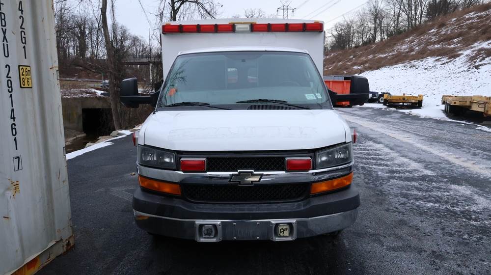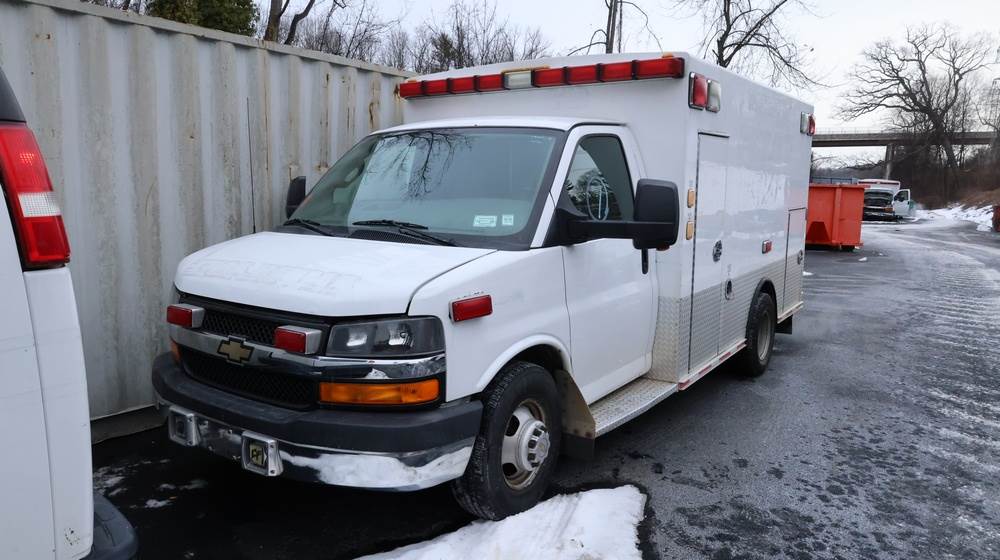 2017 Chevrolet Express G3500 cutaway ambulance with a 6.0L V8 gasoline engine. VIN: 1GB3GRCG7H1107451. Odometer reading: 138199. Body: Cutaway chassis fitted with an ambulance body manufactured by Braun Industries, Inc. Single rear wheel configuration. Roof-mounted emergency lighting, side utility compartments, rear double doors with chevron striping, and rear step bumper. Interior controls include HVAC, factory radio, automatic transmission selector, Whelen emergency control panel, radio microphone, auxiliary switches, and rear ambulance compartment with seating, storage cabinetry, and equipment mounts. Seller reports: Runs and drives, title and key available. Must be towed.