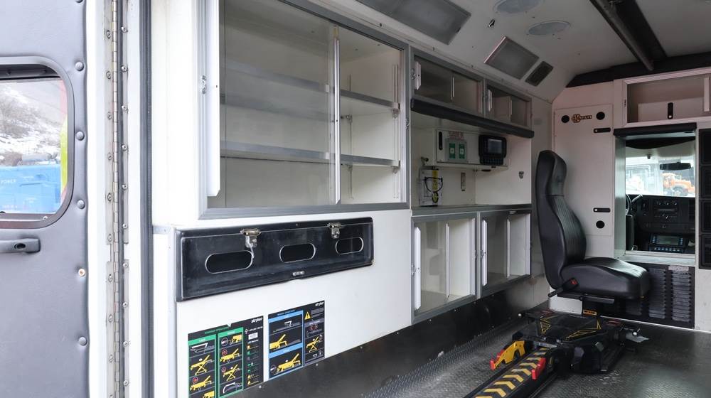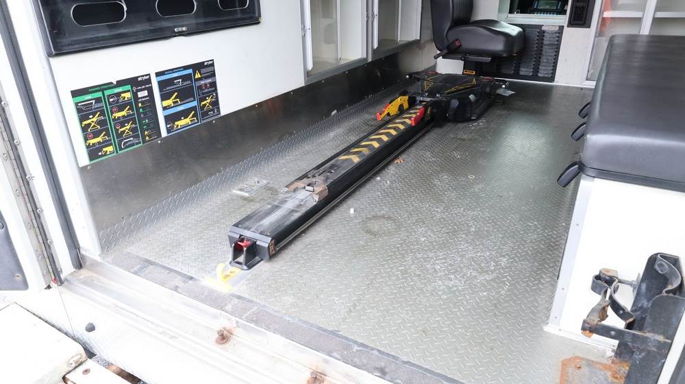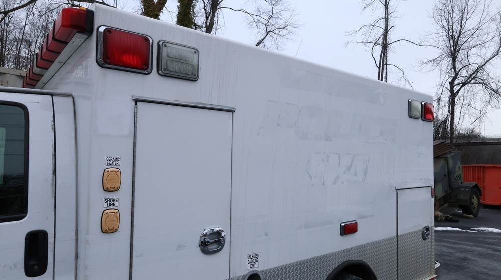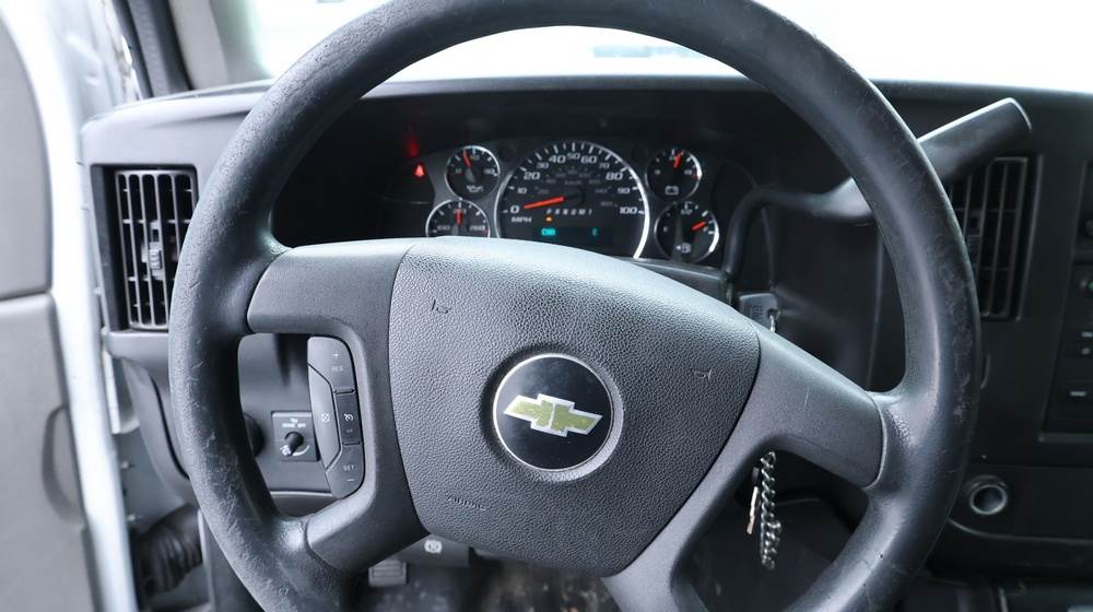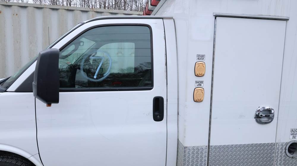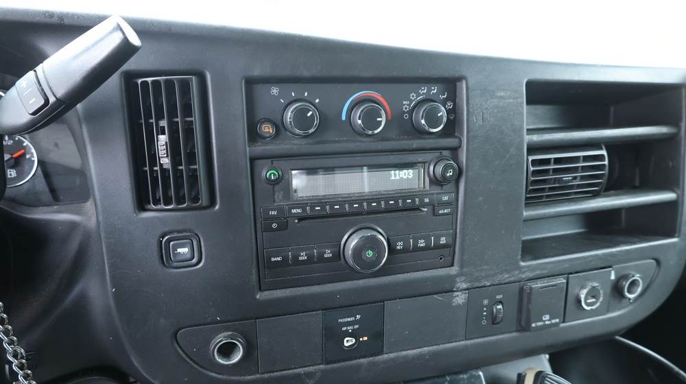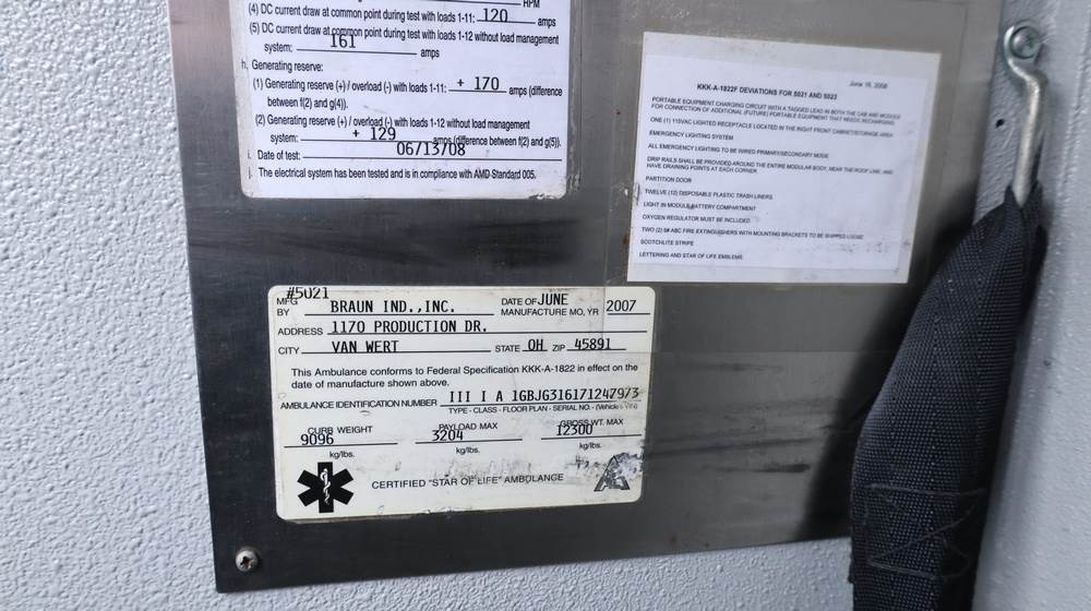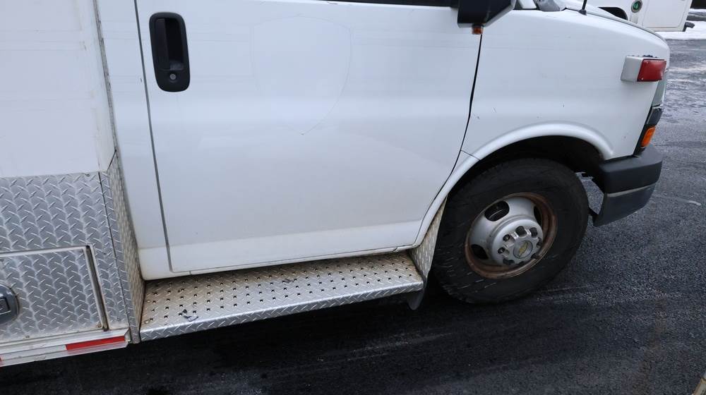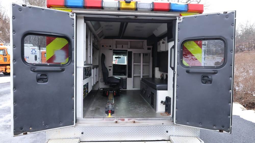 2017 Chevrolet Express G3500 cutaway ambulance with a 6.0L V8 gasoline engine. VIN: 1GB3GRCG7H1107451. Odometer reading: 138199. Body: Cutaway chassis fitted with an ambulance body manufactured by Braun Industries, Inc. Single rear wheel configuration. Roof-mounted emergency lighting, side utility compartments, rear double doors with chevron striping, and rear step bumper. Interior controls include HVAC, factory radio, automatic transmission selector, Whelen emergency control panel, radio microphone, auxiliary switches, and rear ambulance compartment with seating, storage cabinetry, and equipment mounts. Seller reports: Runs and drives, title and key available. Must be towed.