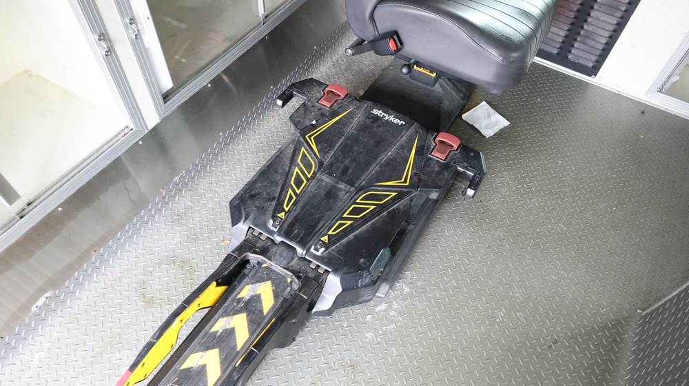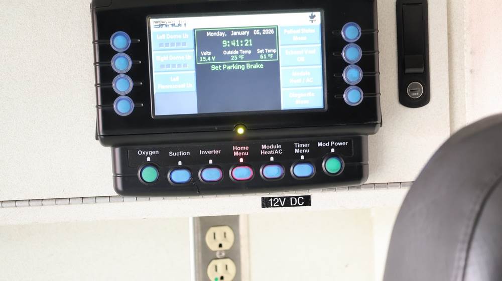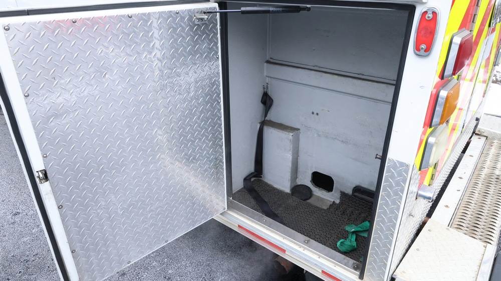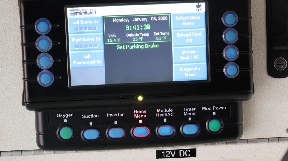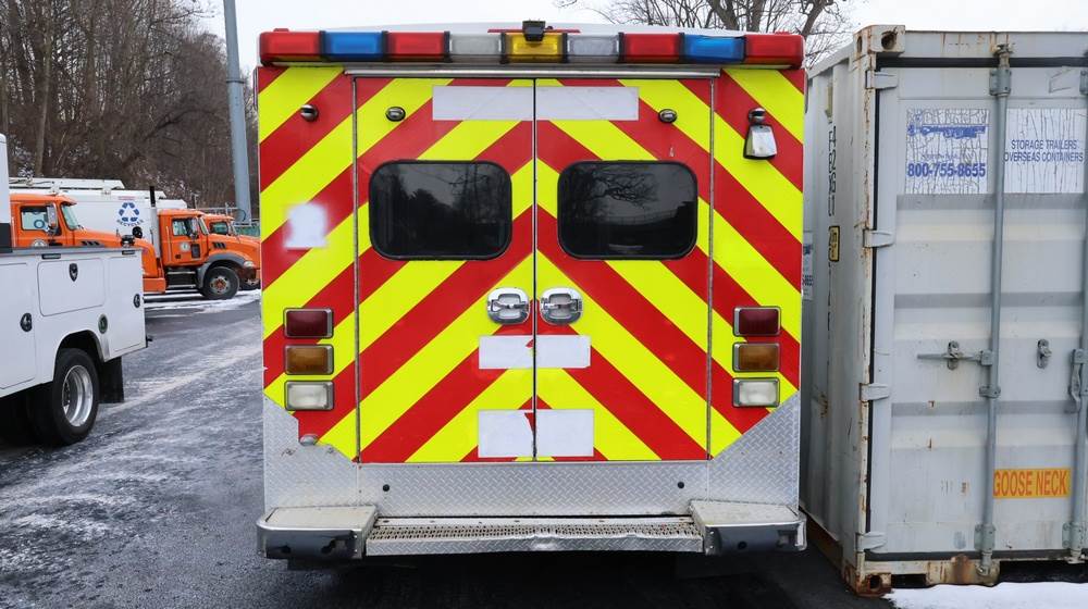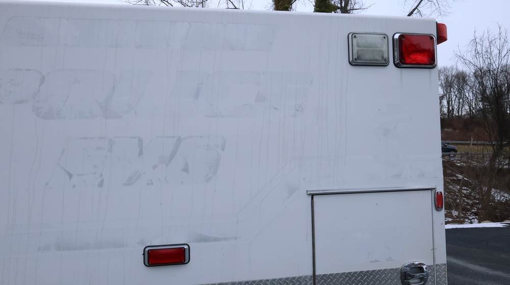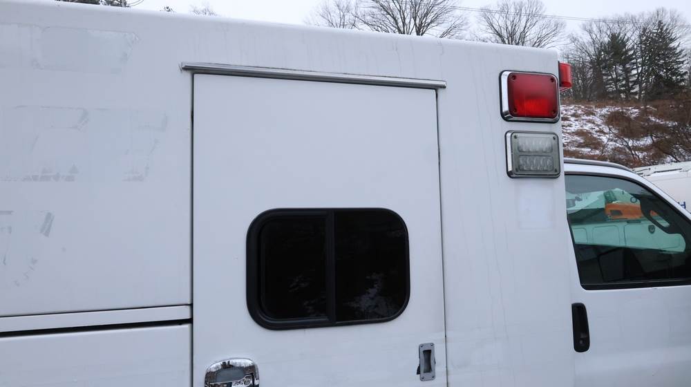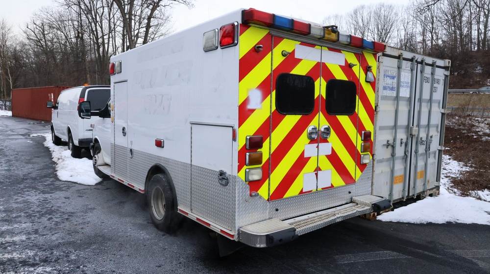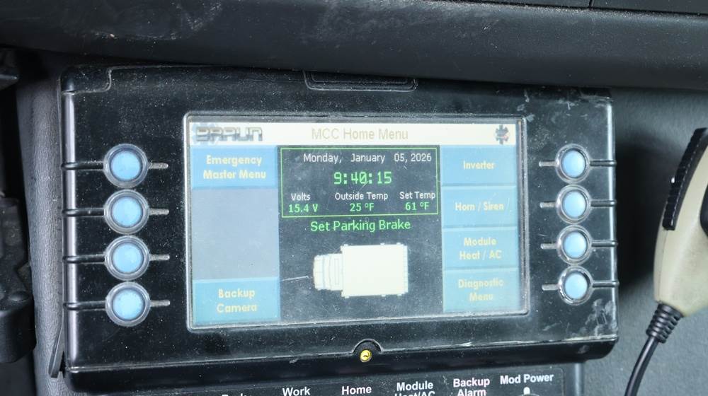 2017 Chevrolet Express G3500 cutaway ambulance with a 6.0L V8 gasoline engine. VIN: 1GB3GRCG7H1107451. Odometer reading: 138199. Body: Cutaway chassis fitted with an ambulance body manufactured by Braun Industries, Inc. Single rear wheel configuration. Roof-mounted emergency lighting, side utility compartments, rear double doors with chevron striping, and rear step bumper. Interior controls include HVAC, factory radio, automatic transmission selector, Whelen emergency control panel, radio microphone, auxiliary switches, and rear ambulance compartment with seating, storage cabinetry, and equipment mounts. Seller reports: Runs and drives, title and key available. Must be towed.
