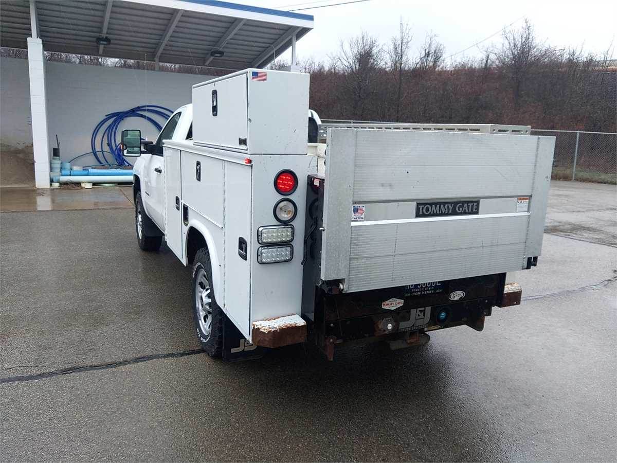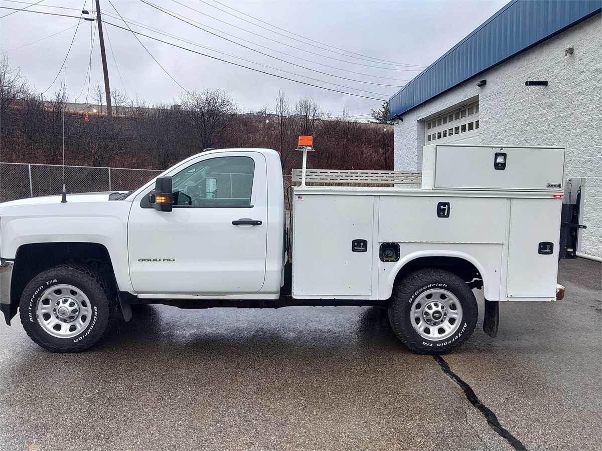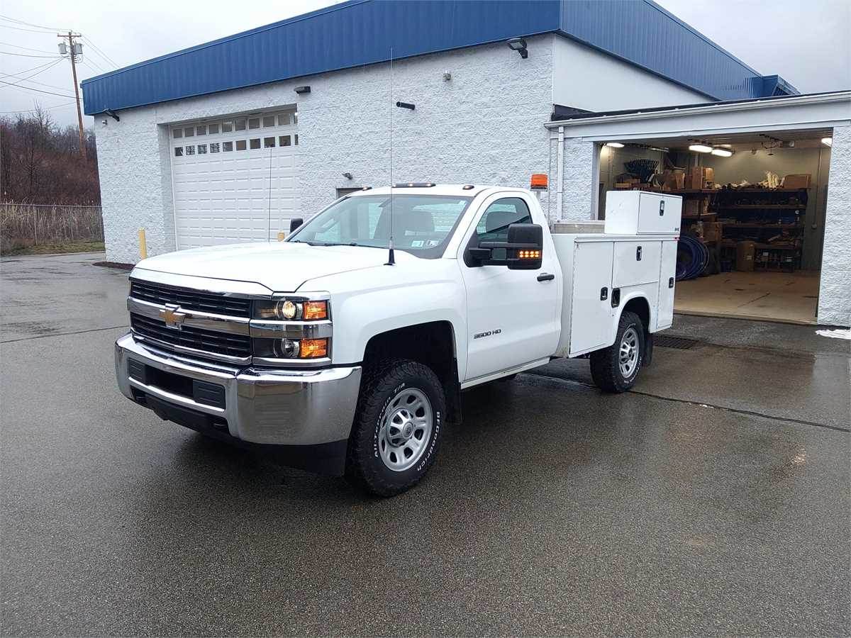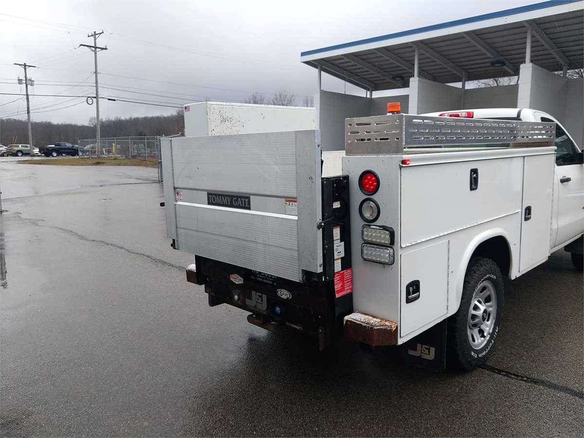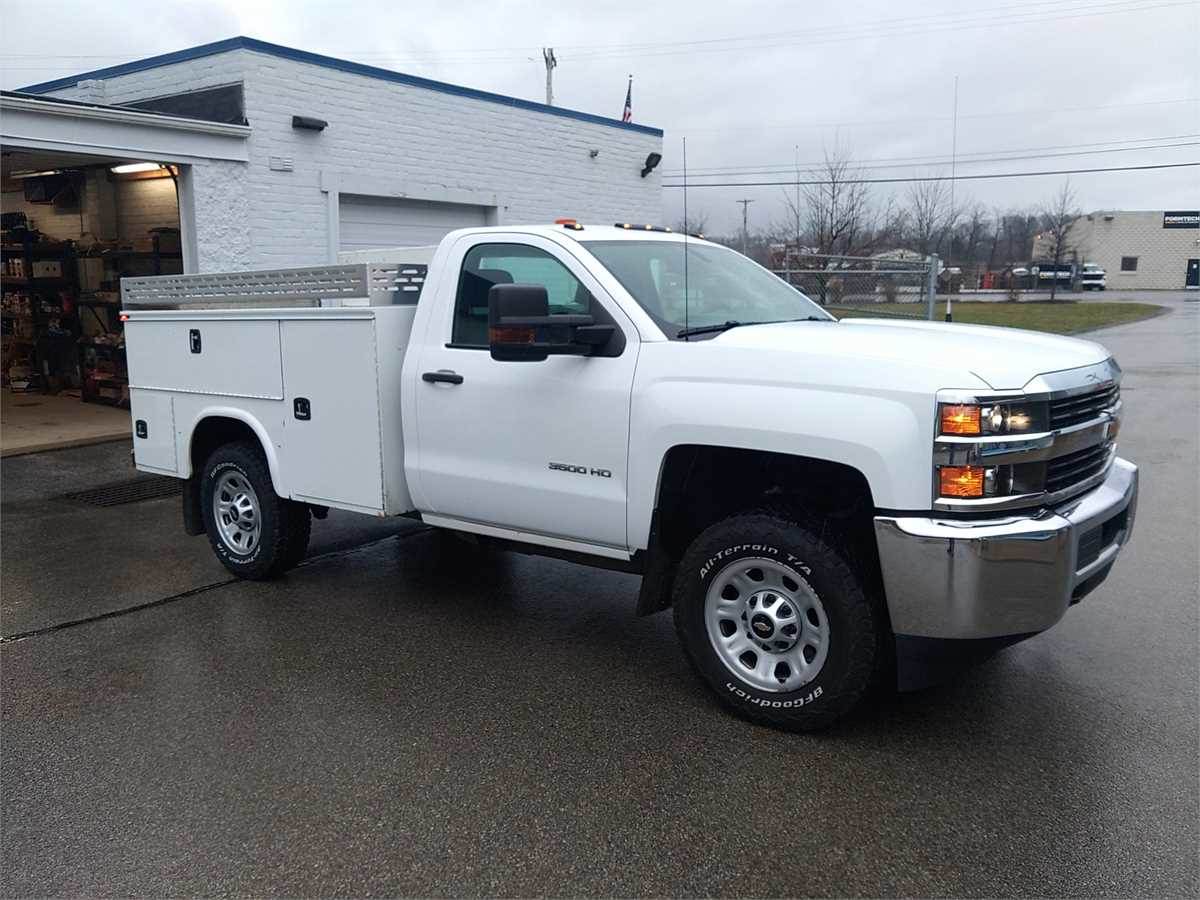 2017 Chevrolet 3500 HD WT 4x4 Regular cab 6.0L, 6 speed automatic transmission, air conditioning, inspected until 5/26. Knapheide 8' service body with tommy gate lift gate, shovel rack, 2000w power inverter,5 drawer tool storage, lighting in compartments, rust on bed floor. Transmission was replaced with remanufactured one a couple years ago.