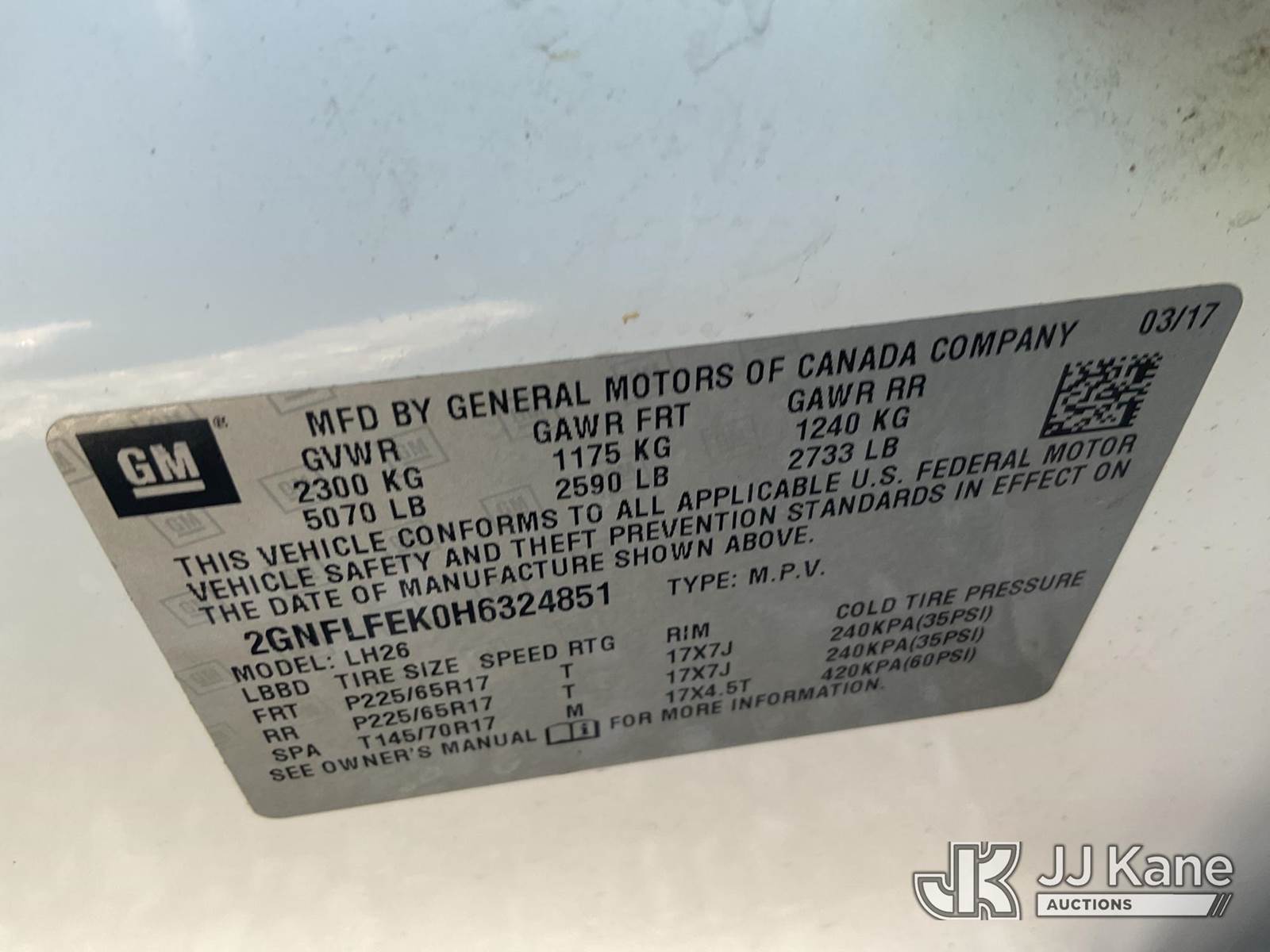 2017 Chevrolet Equinox AWD 4-Door Sport Utility Vehicle, 4-cyl gas, Auto, A/C, (104,969 miles) (Duke Unit) (Runs & Moves) (Cracked Bumper) This is a Titled Item NOTE: This unit is being sold AS IS/WHERE IS via Timed Auction and is located in Verona, KY. Inspection & preview days for this unit are the 2 business days prior to the first day of items closing for this auction, item is located at 2841 Verona-Mudlick Rd Ste B Verona, KY 41092 and hours of operations are 8a-4p. For pre-sale questions, please contact Office Staff @ (502) 612-5080. Auctioneer Michael Whitebread / License # 256617. (Buyer is responsible for removal. Assistance by consignor or JJ Kane Auctions is not assured.)