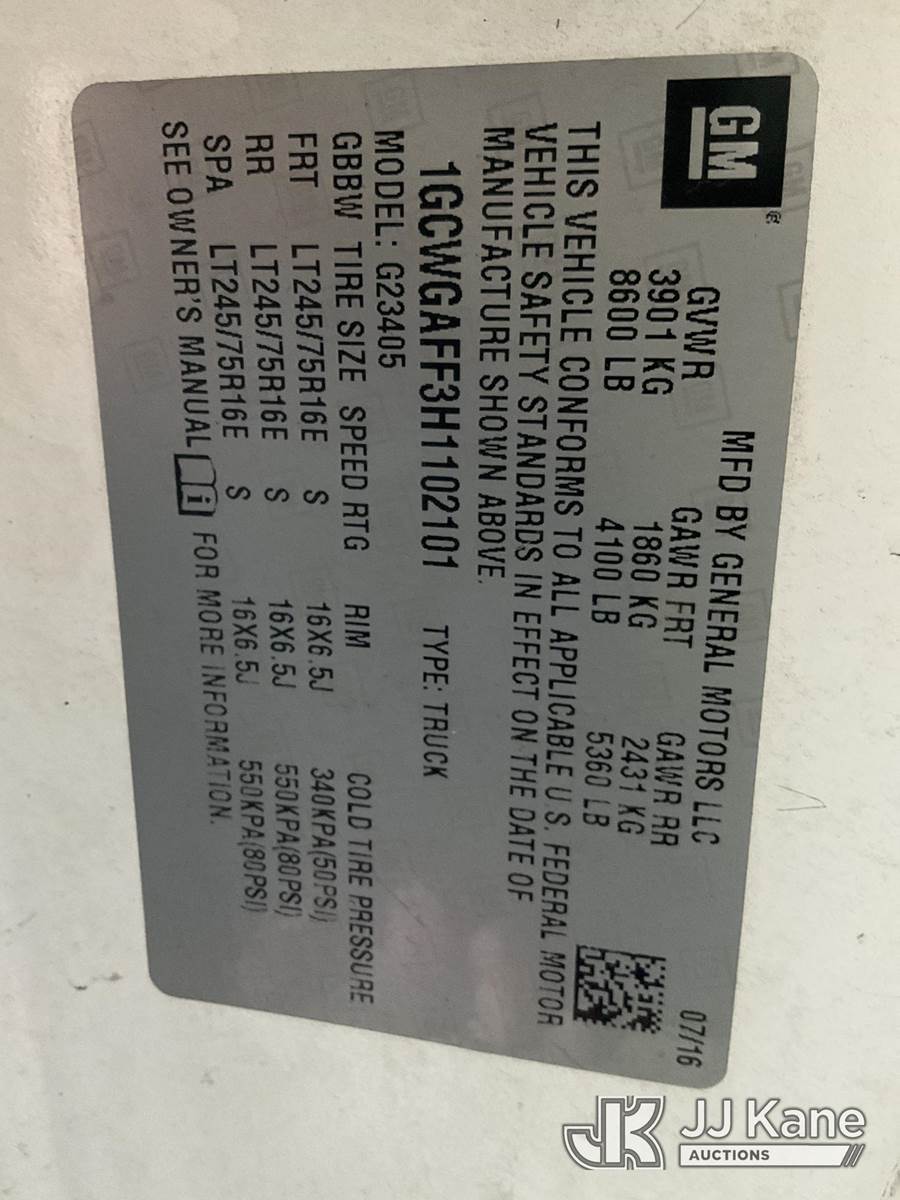 2017 Chevrolet Express 2500 Cargo Van, 8-cyl gas, RWD, 6-Speed Automatic, A/C, (136,337 miles) (Runs) (Does not Move, Check Engine Light On ) (Seller: Transmission Bad) (Reads 4,891 hours) This is a Titled Item NOTE: This unit is being sold AS IS/WHERE IS via Timed Auction and is located in Larose, LA. Please call Jordan at (769) 231-2679 with any questions. Removal by appointment only, Buyer/Hauler must present copy of purchase. paid invoice upon arrival. Purchaser acknowledges ALL lots must be removed within 7 business days of Auction, or a storage fee may be incurred. For Removal and Pick Up information, please reference the release form sent out after purchase. License # LA AB-154 (Buyer is responsible for removal. Assistance by consignor or JJ Kane Auctions is not assured.)