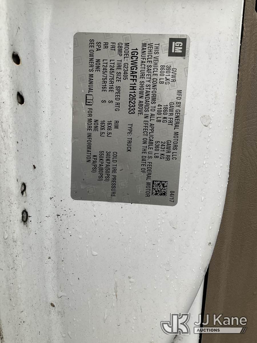 2017 Chevrolet Express G2500 Cargo Van, 8-cyl gas, Auto, A/C, (109,161 miles) (Jump To Start, Runs & Moves, Body Damage)(Removal is by Appointment Only, Buyer MUST make an appointment prior to picking up, Buyer/Transporter Must have PAID IN FULL RELEASE. No onsite assistance available, Please Come prepared.) This is a Titled Item NOTE: This unit is being sold AS IS/WHERE IS via Timed Auction and is located in Bellport, NY. Inspection & preview days for this unit are by appointment only; please contact us at contact@jjkane.com or 84-Go-JJKane for more details. (Buyer is responsible for removal. Assistance by consignor or JJ Kane Auctions is not assured.)