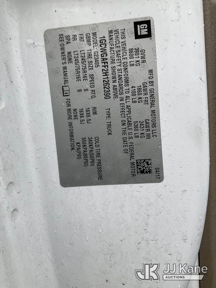 2017 Chevrolet Express G2500 Cargo Van, 8-cyl gas, Auto, A/C, (97,361 miles) (Runs & Moves, Seller States: Bad Engine, Jump to Start, Engine Noise, Rust Damage, Must Tow) (Removal is by Appointment Only, Buyer MUST make a appointment prior to picking up, Buyer/Transporter Must have PAID IN FULL RELEASE. No onsite assistance available, Please Come prepared. Jump To Start, Runs & Moves, Low Fuel) This is a Titled Item NOTE: This unit is being sold AS IS/WHERE IS via Timed Auction and is located in Bellport, NY. Inspection & preview days for this unit are by appointment only; please contact us at contact@jjkane.com or 84-Go-JJKane for more details. (Buyer is responsible for removal. Assistance by consignor or JJ Kane Auctions is not assured.)
