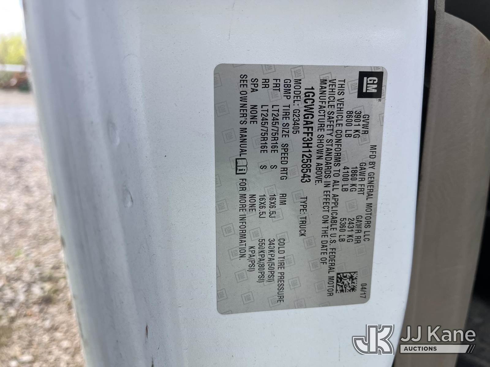 2017 Chevrolet Express G2500 Cargo Van, 4.8L V8 FFV, RWD, Automatic, A/C, (62,130 miles) (Not Running, Cranks, Condition Unknown, Seller States: Corrosion Issues) This is a Titled Item NOTE: This unit is being sold AS IS/WHERE IS via Timed Auction and is located in Smock, PA. Inspection & preview days for this unit are the 2 business days prior to the first day of items closing for this auction, item is located at 1000 Franklin Dr Smock, PA 15480 and hours of operations are 7:00 am to 3:30 pm. For pre-sale questions, please contact Alaina White @ (724) 562-2575 or Alaina.White@JJKane.com. (Buyer is responsible for removal. Assistance by consignor or JJ Kane Auctions is not assured.)