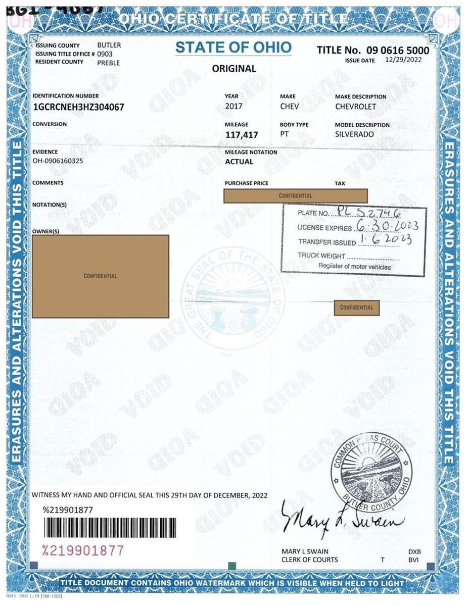 2017 Chevrolet Silverado 1500 Work Truck, 255,235miles, 4.3L V6 gas engine 4x2, auto trans, cloth interior, heat, ac, radio, has check engine light on, Runs and Drives, VIN#1GCRCNEH3HZ304067; (***OHIO TITLE GUARANTEED BY CONSIGNOR, ALLOW 30 BUSINESS DAYS FOR PROCESSING *** $25 TITLE FEE APPLIES***)